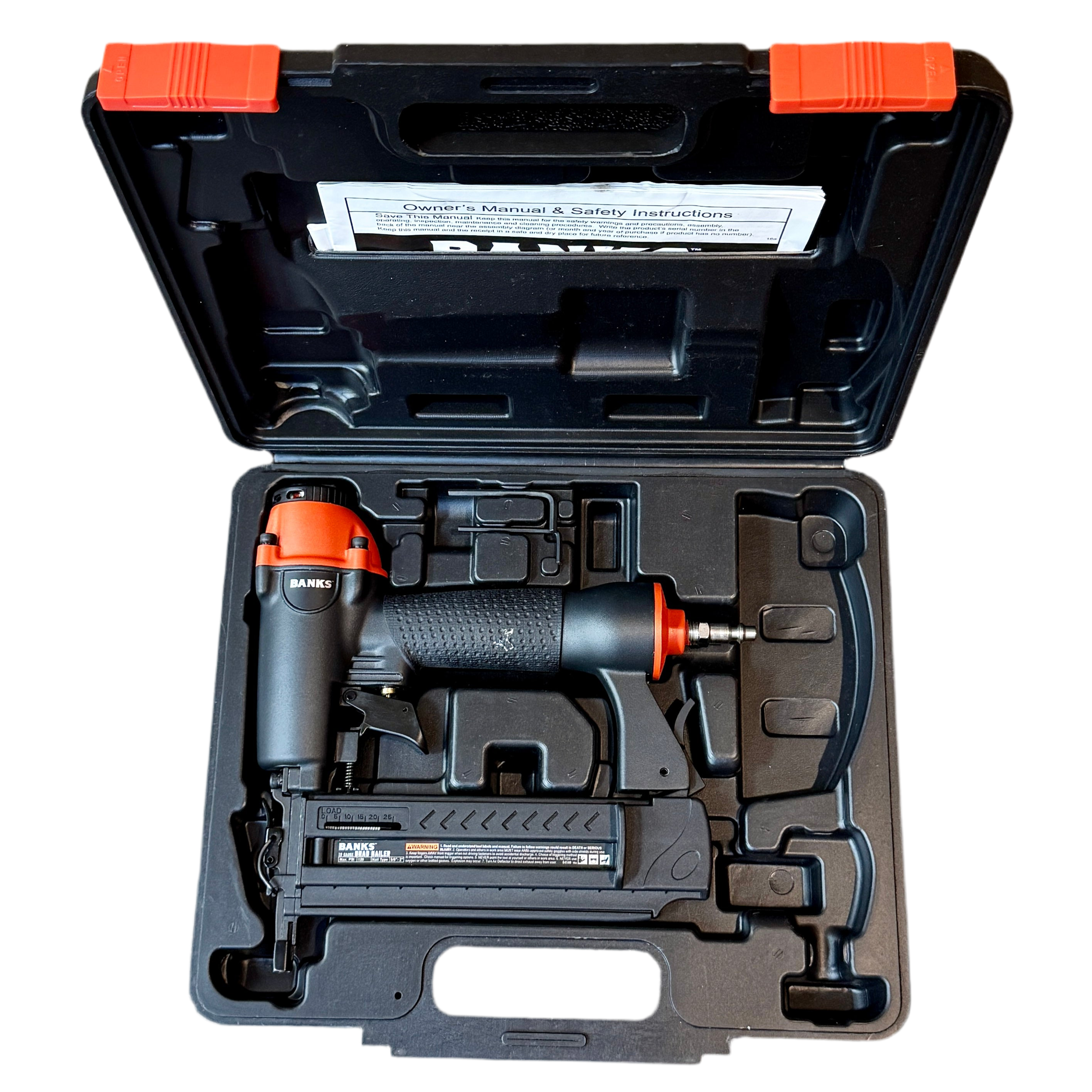 The BANKS 18-Gauge 2" Pneumatic Brad Nailer (64140) is a versatile tool designed for precise and efficient finishing work. Ideal for trim, molding, cabinetry, and craft projects, this brad nailer offers consistent performance, ease of use, and secure storage with the included hard case.