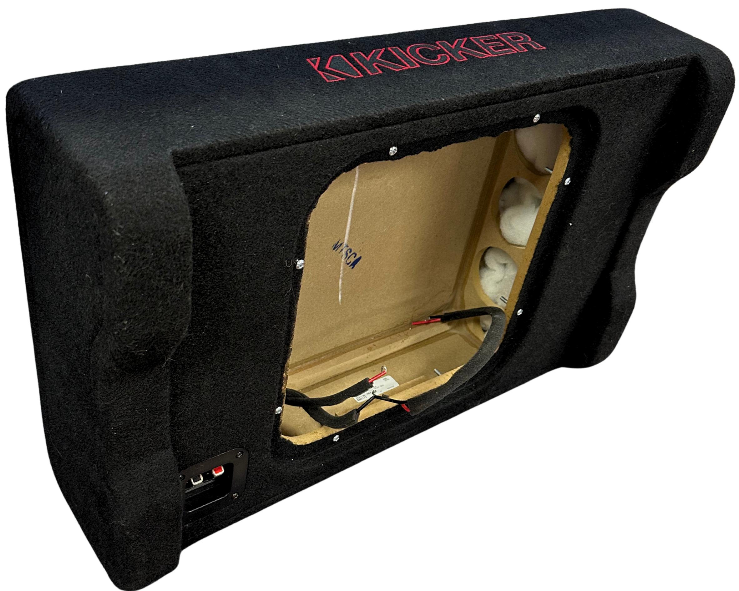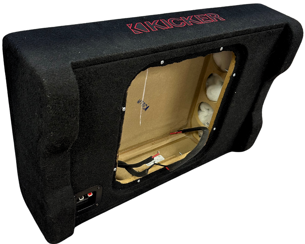 Take your car audio system to the next level with this rugged, stylish Kicker subwoofer enclosure. Designed to house a 12” subwoofer (not included), this box features durable black carpeted MDF construction, internal bracing, and premium terminal connections for reliable performance. The KICKER logo is boldly stitched across the top, giving it that clean, factory-fresh look that stands out in any trunk or back seat.