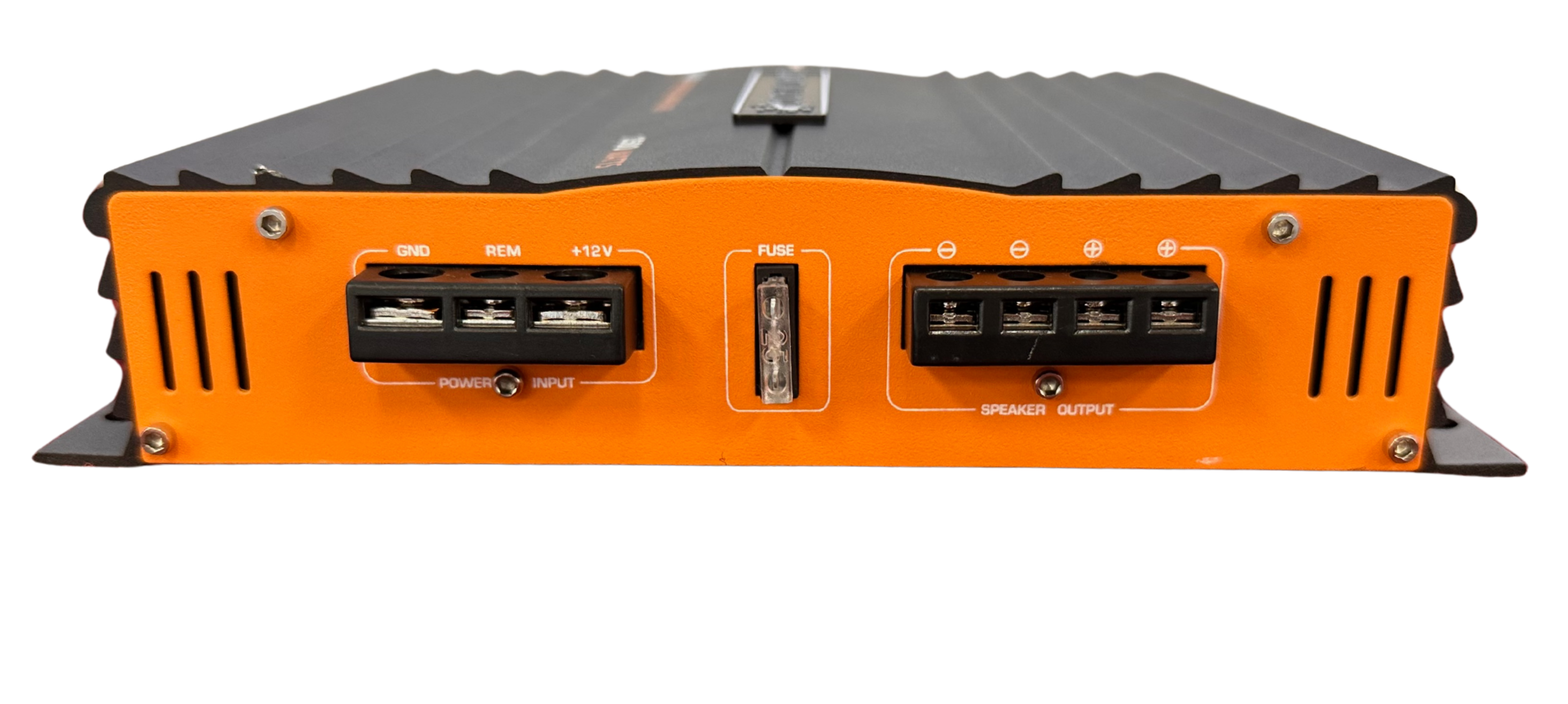 It features adjustable bass boost, subsonic filter, and low-pass crossover to fine-tune your audio experience. The durable black-and-orange aluminum housing provides excellent heat dissipation and a bold, stylish look.