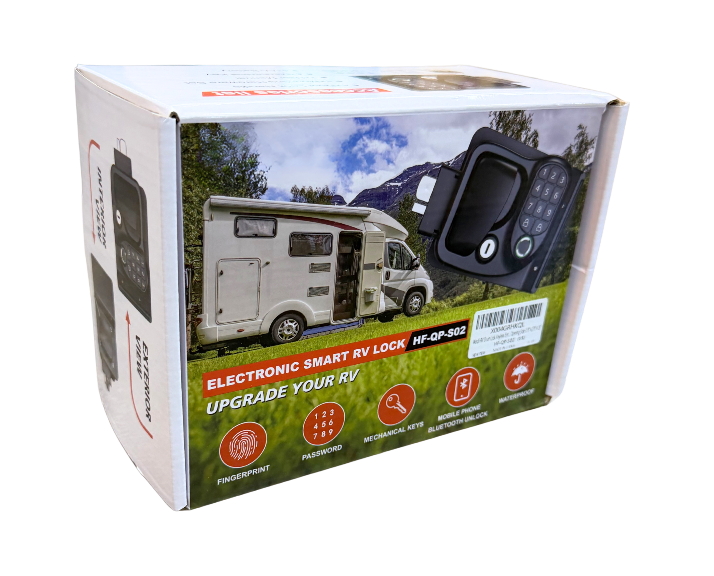 Upgrade your RV security with this electronic smart door lock system, model HF-QP-S02, designed for convenience and reliable access control. This unit features multiple unlocking methods including fingerprint recognition, keypad password entry, Bluetooth mobile access, and traditional mechanical keys, giving you flexible options for entry whether you're on the road or at camp.