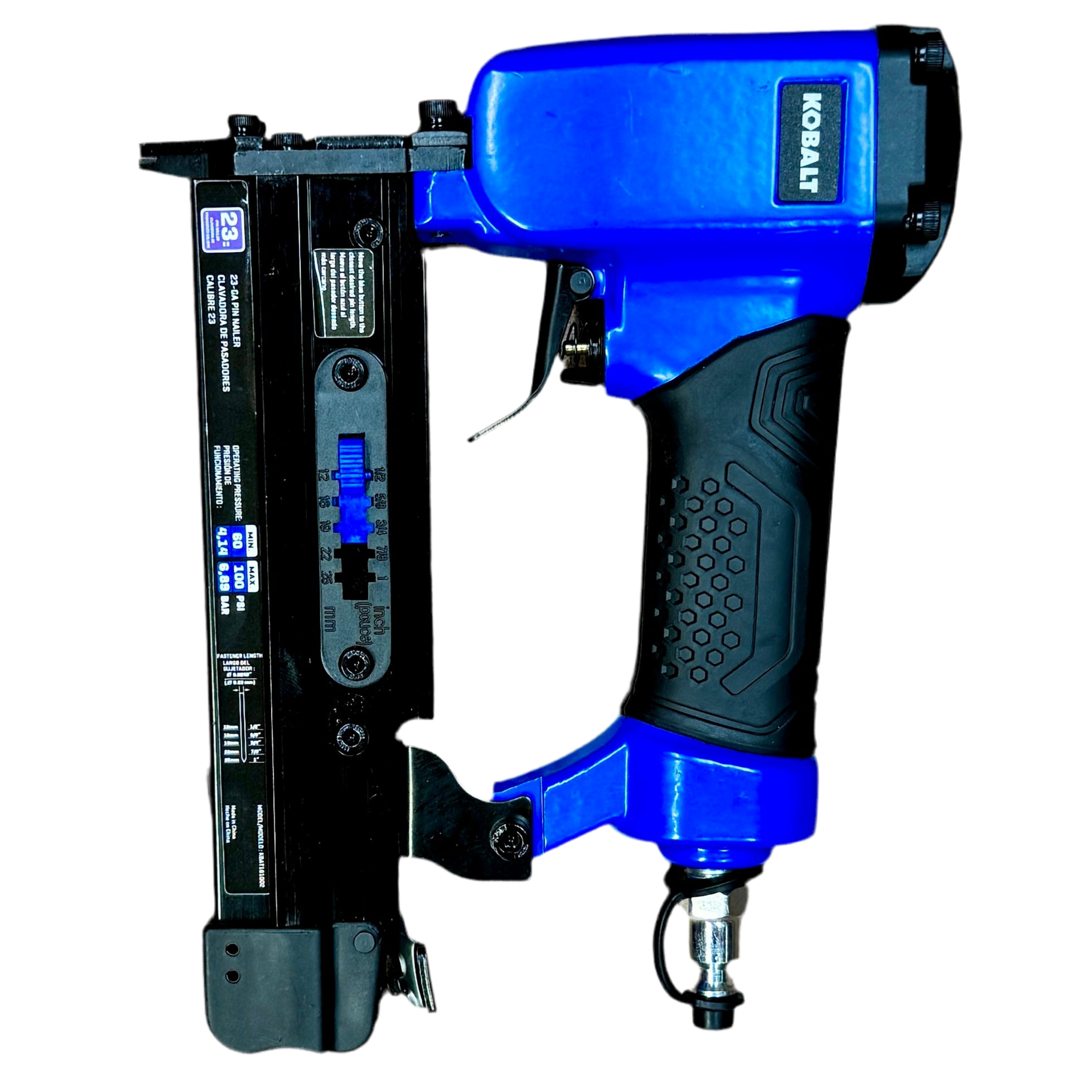 The Kobalt KBAT161002 Pneumatic Pin Nailer is the perfect tool for delicate trim, molding, and craftwork. Designed to drive 23-gauge headless pins with precision, this compact and lightweight nailer is ideal for fine detail work where a clean, nearly invisible finish is essential.