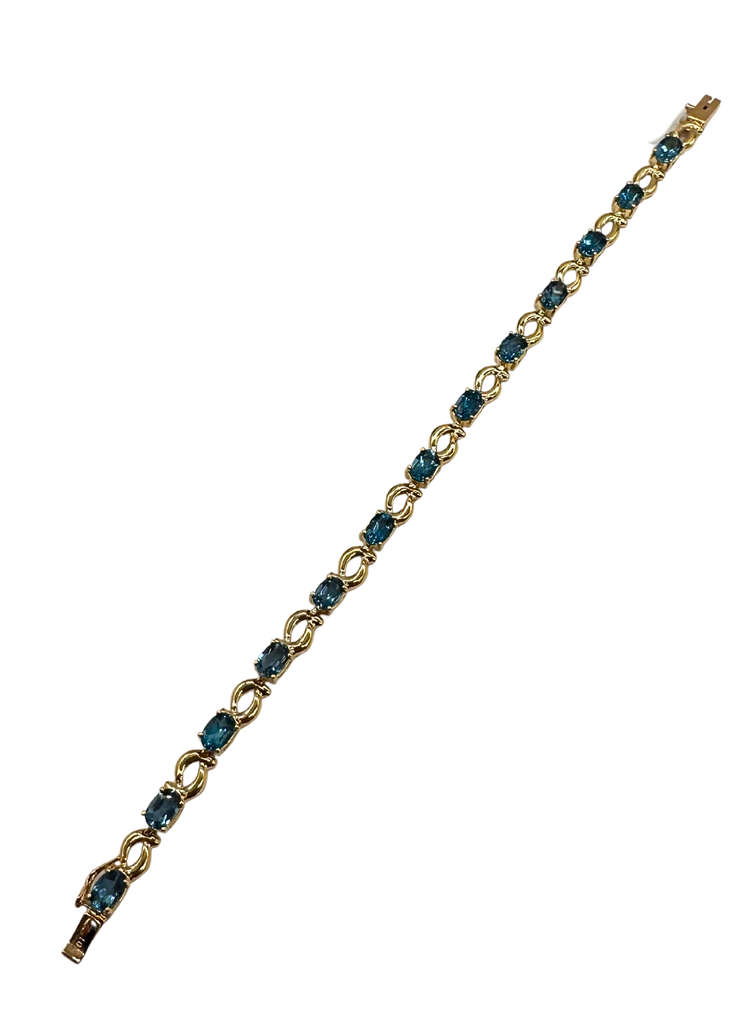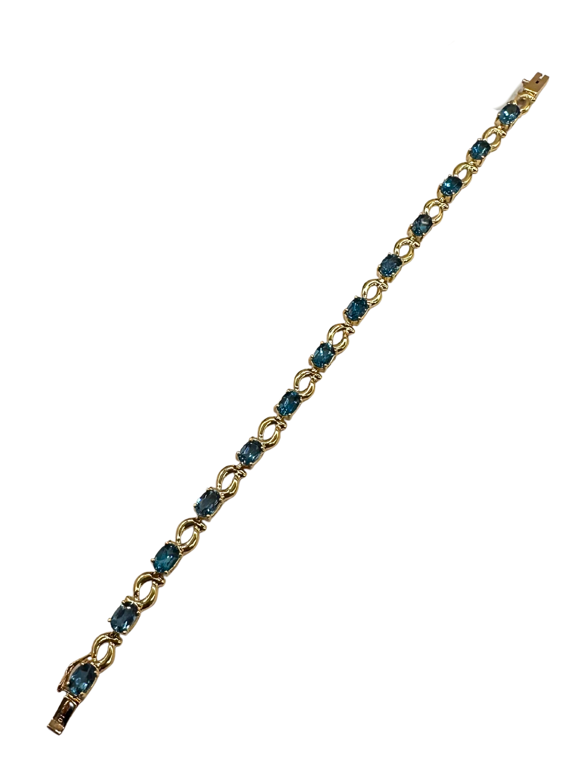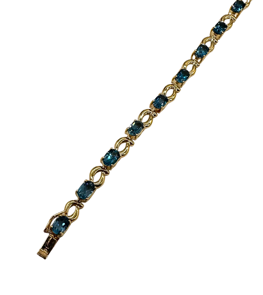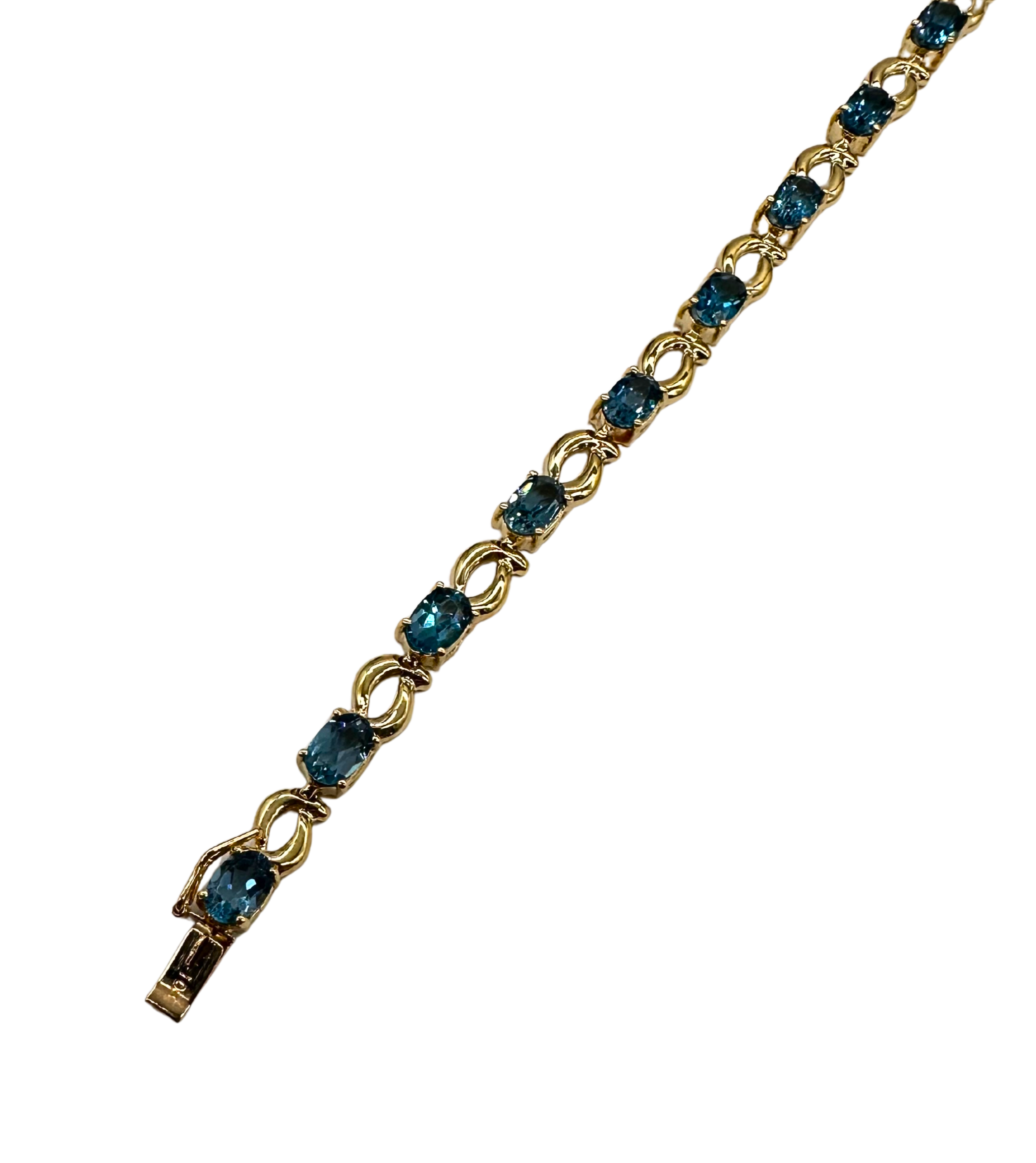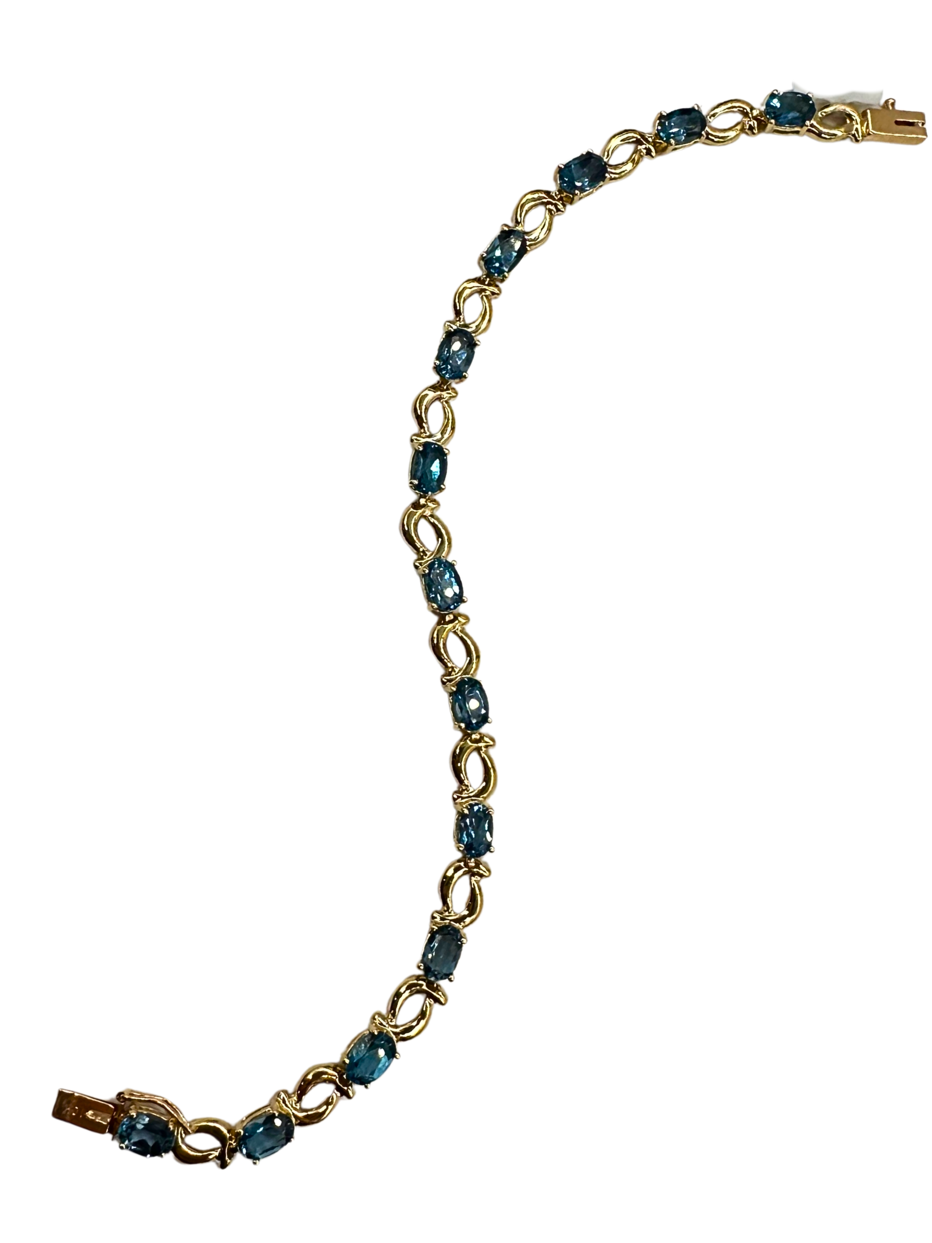 A gorgeous 10k yellow gold bracelet featuring vivid oval-cut blue topaz stones set in elegant open-link stations. The rich golden tone complements the cool blue sparkle beautifully, creating a timeless and eye-catching piece for everyday wear or special occasions.