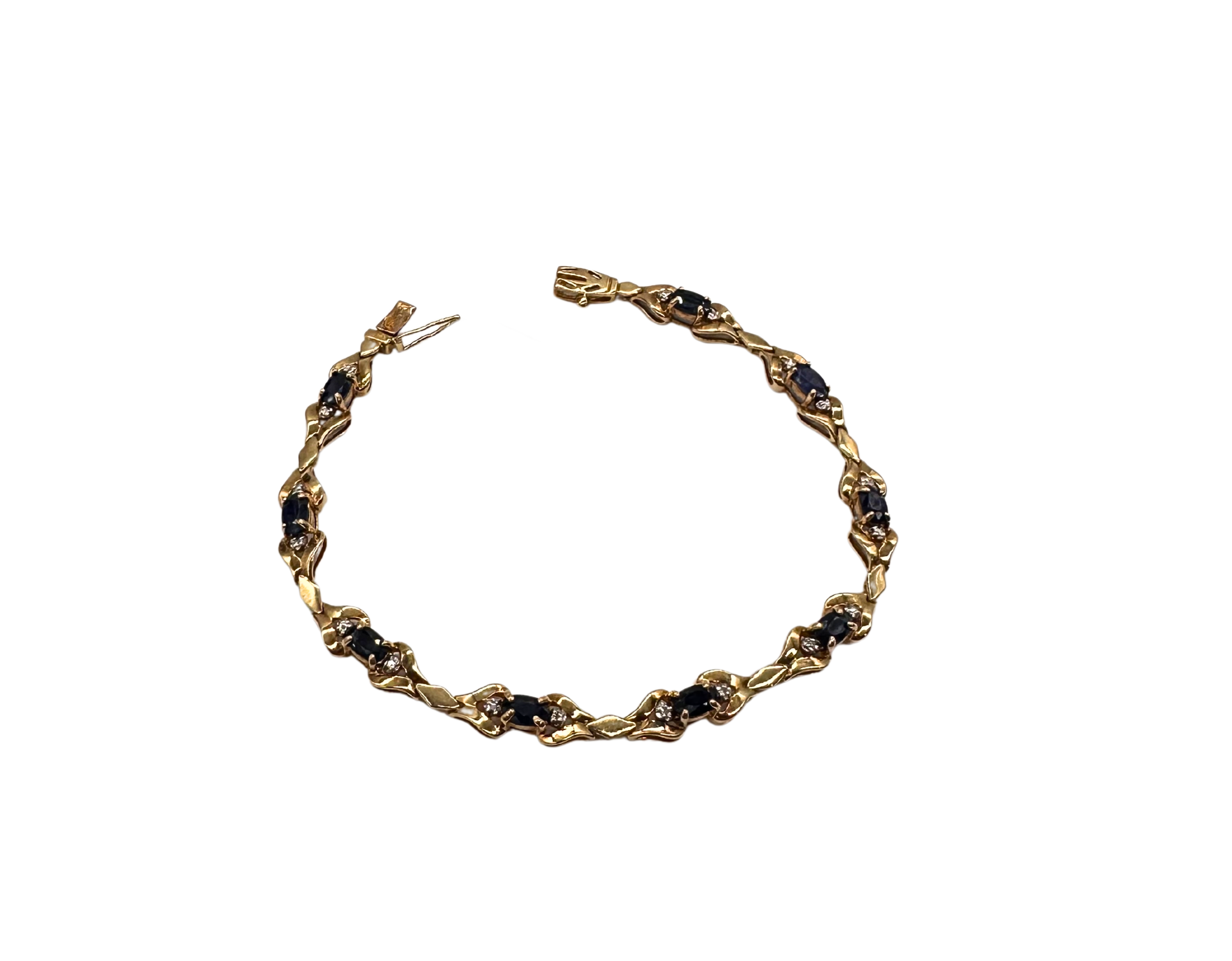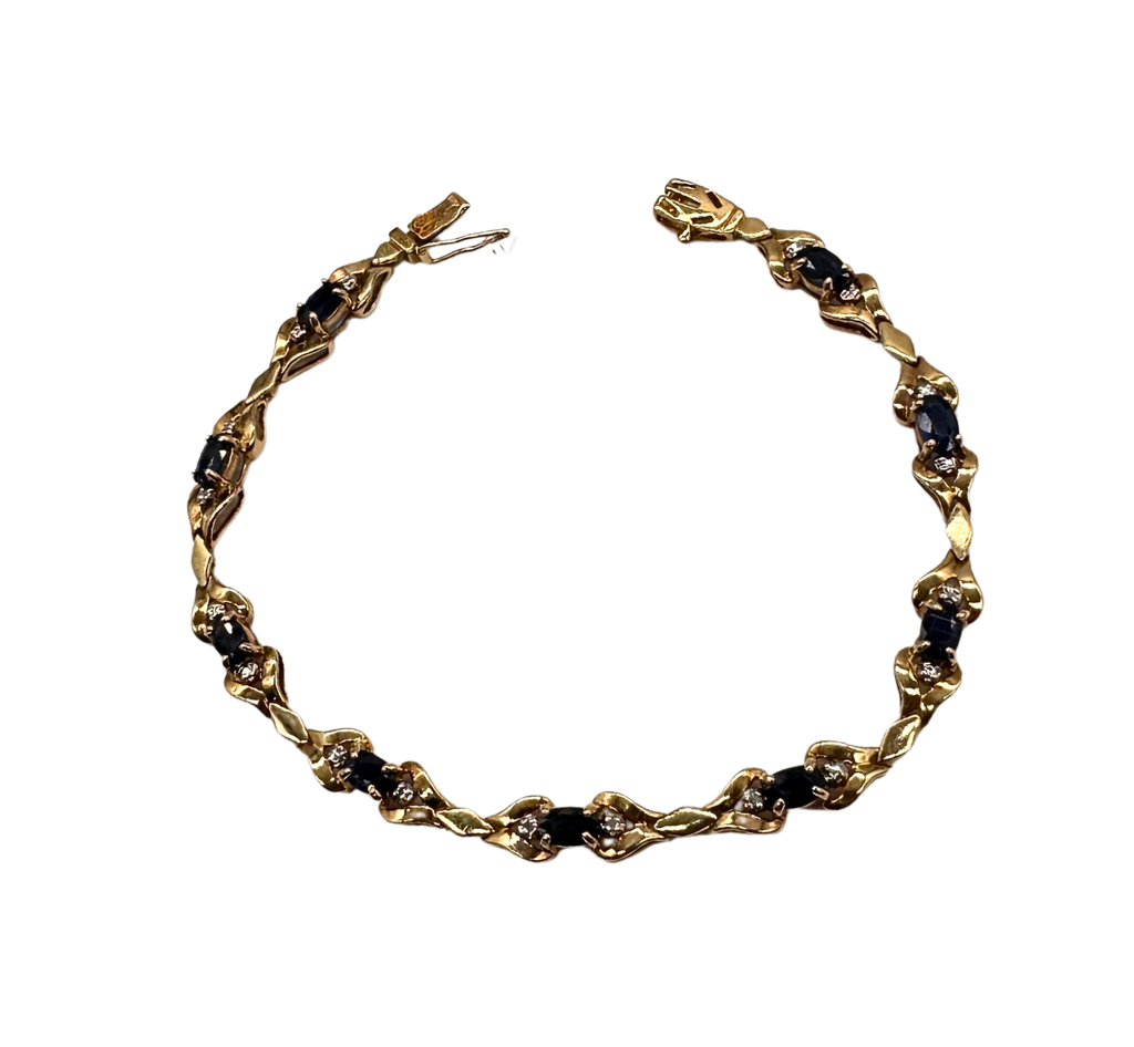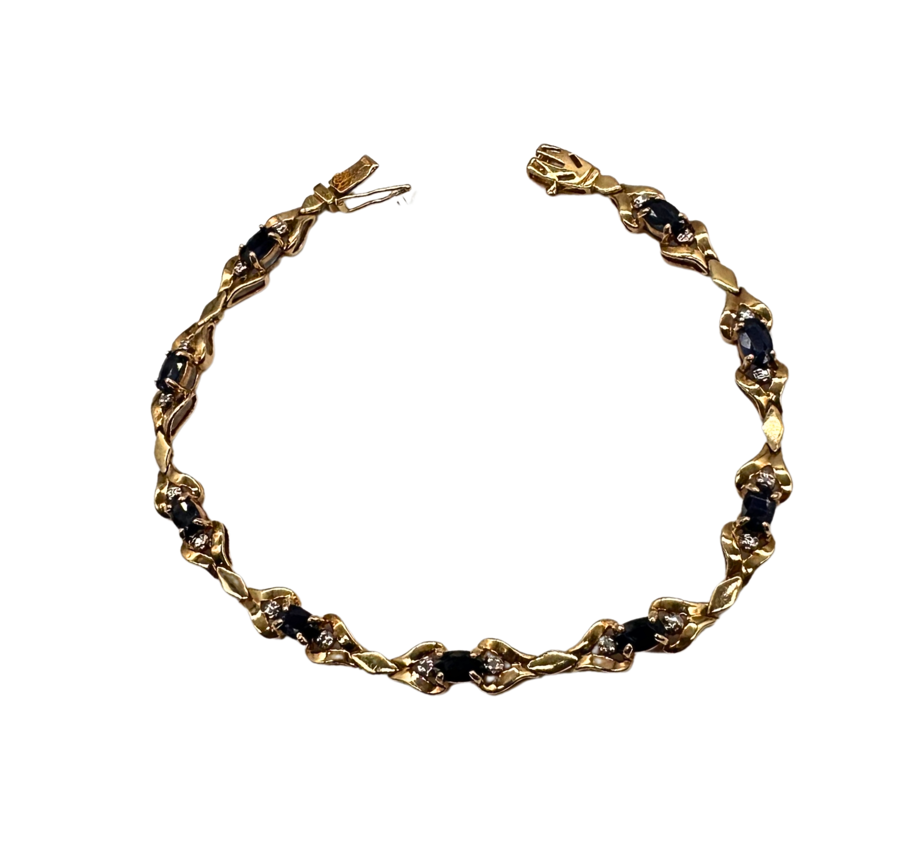 This elegant 10K yellow gold bracelet features deep blue oval sapphires set along a flowing bridge-style link pattern. Each sapphire station is highlighted with sparkling diamond accents, adding just the right touch of shimmer.