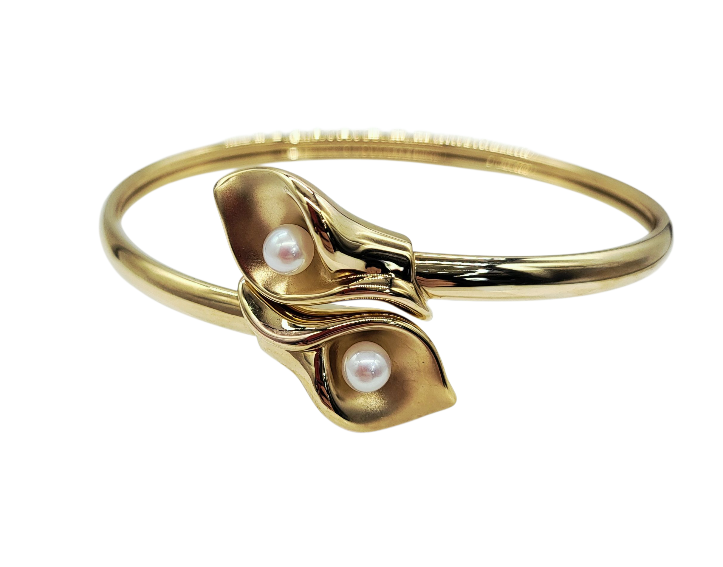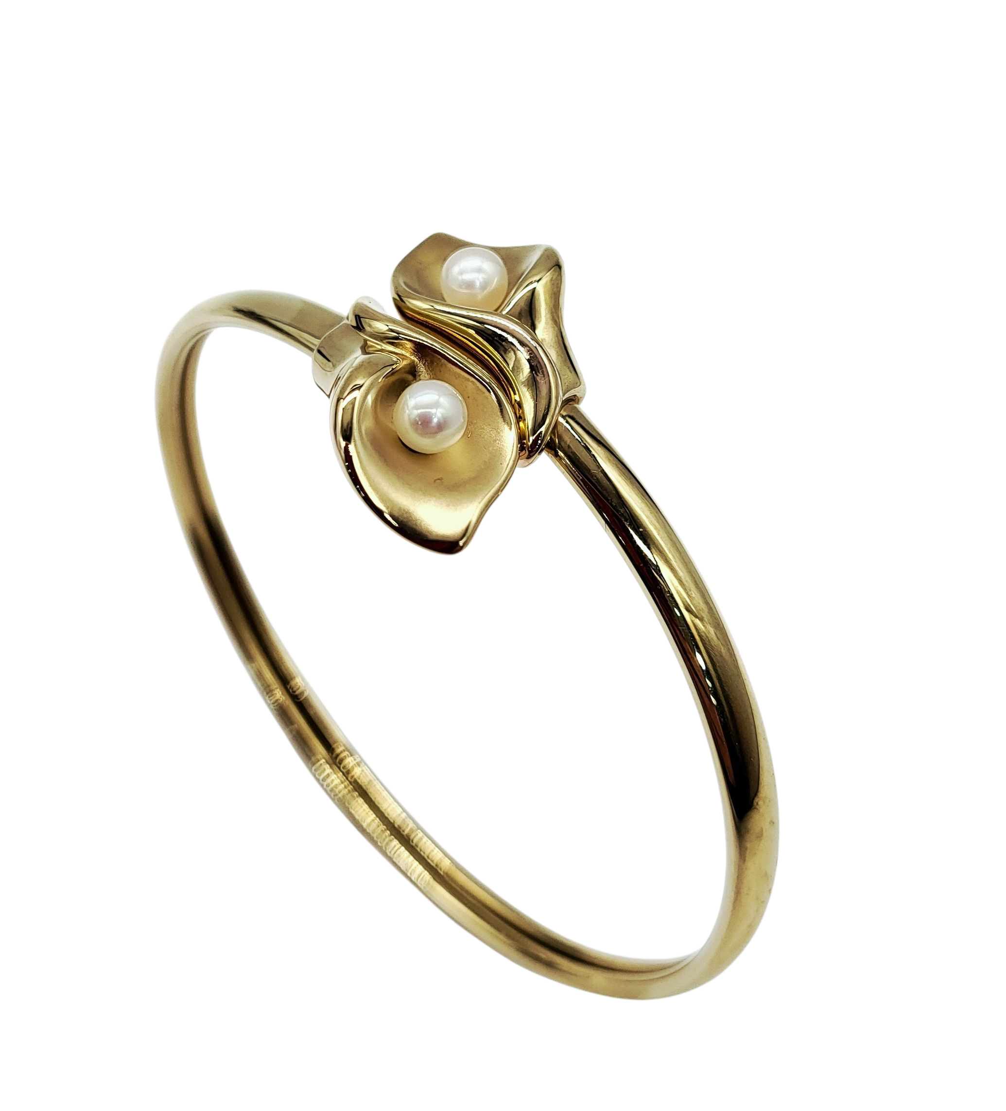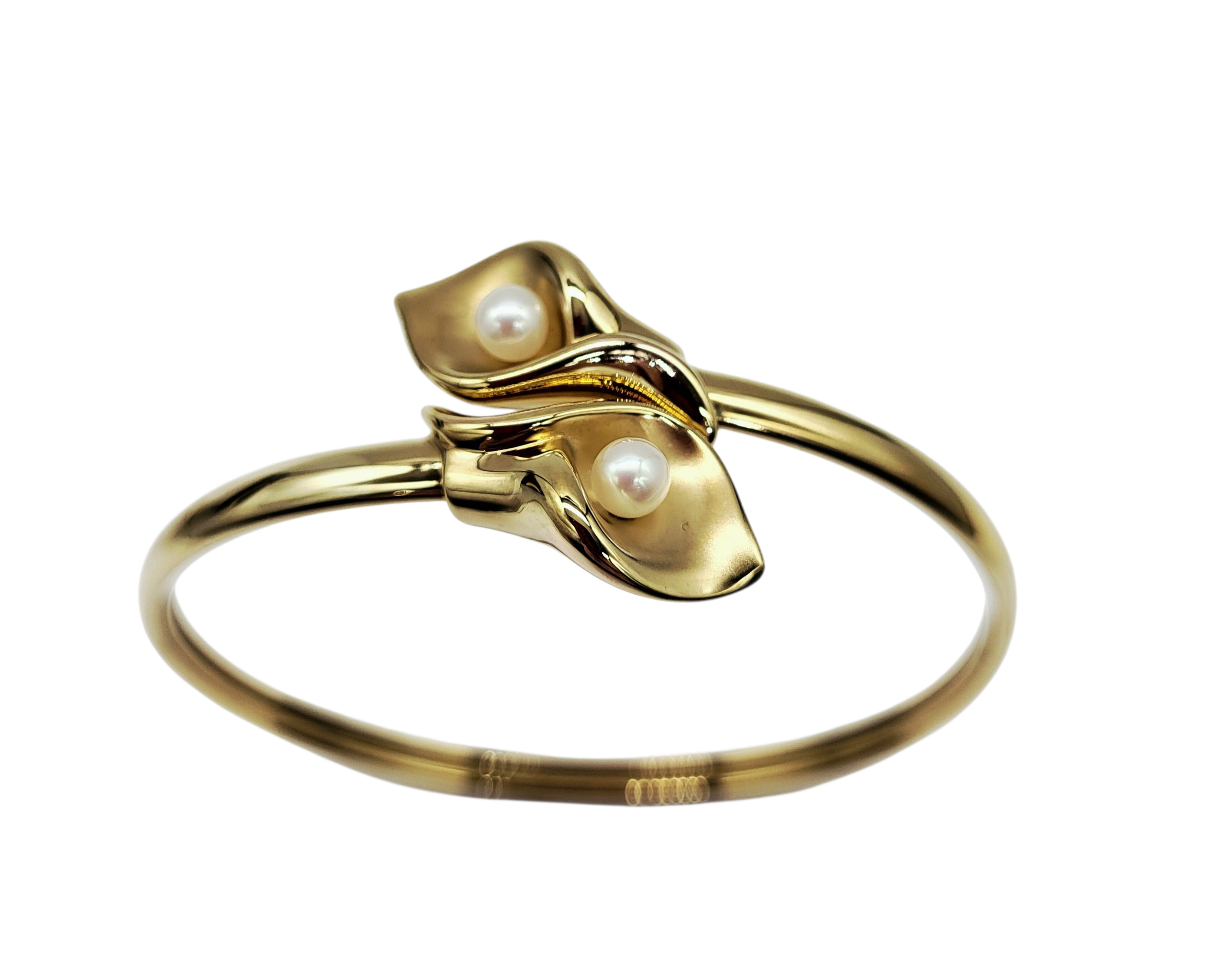 Add the perfect touch of whimsy to any outfit with our 14 Karat Gold Pearl Cuff Bracelet. Featuring a unique white pearl Lilly flower design, this bypass cuff bracelet is crafted in 14 karat yellow gold - a charming statement piece for any occasion.