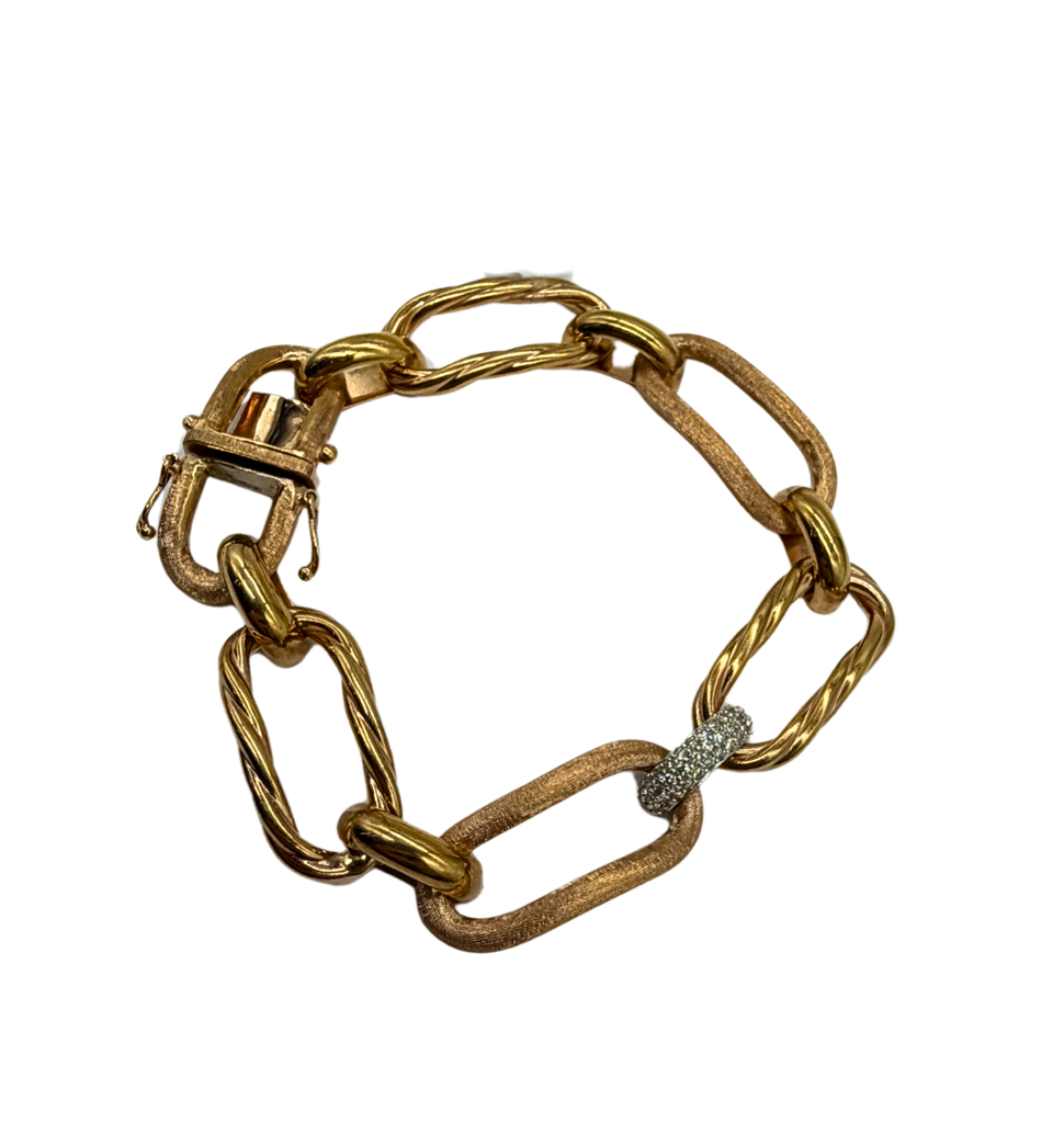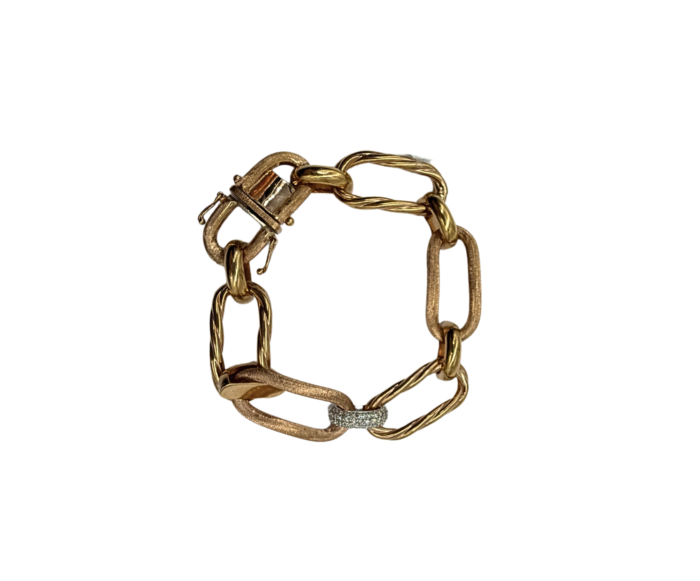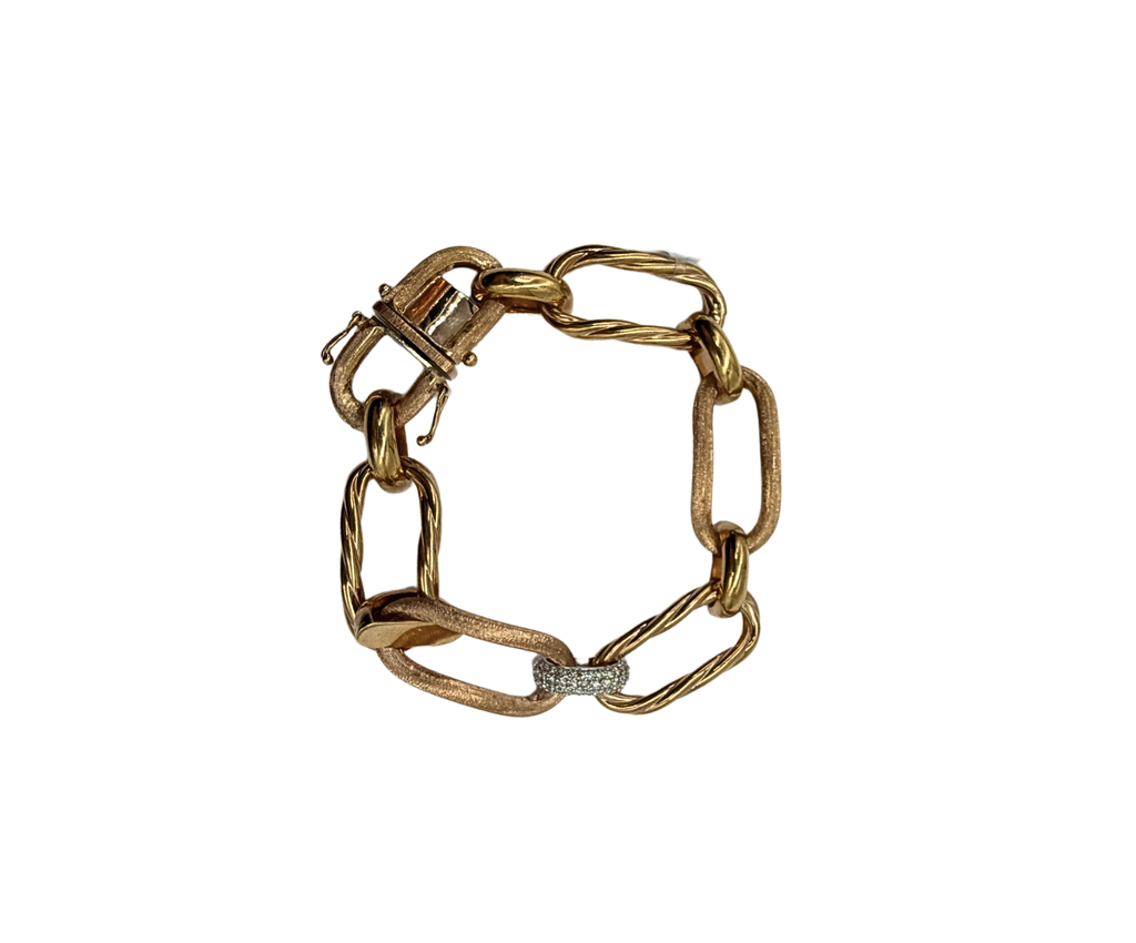 This stunning 14k rose and white gold bracelet brings a bold, modern feel with its oversized twisted oval links and contrasting satin textures. Each link creates a rich mix of shine and brushed detail, giving the piece a dimensional, designer-level look.