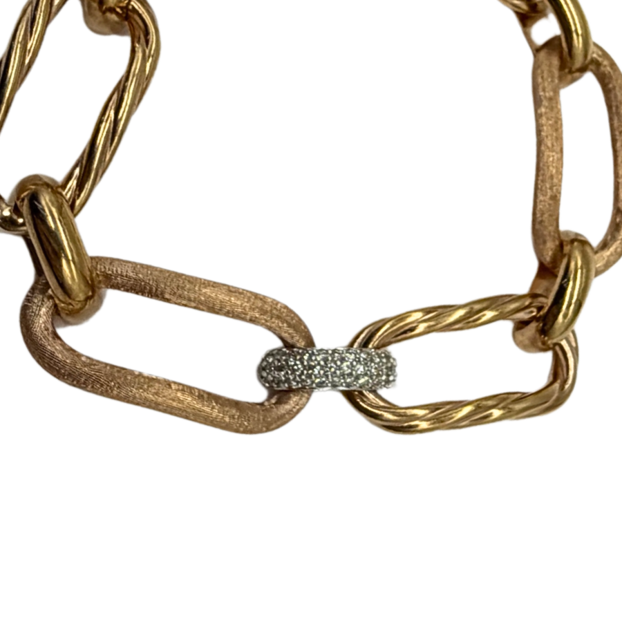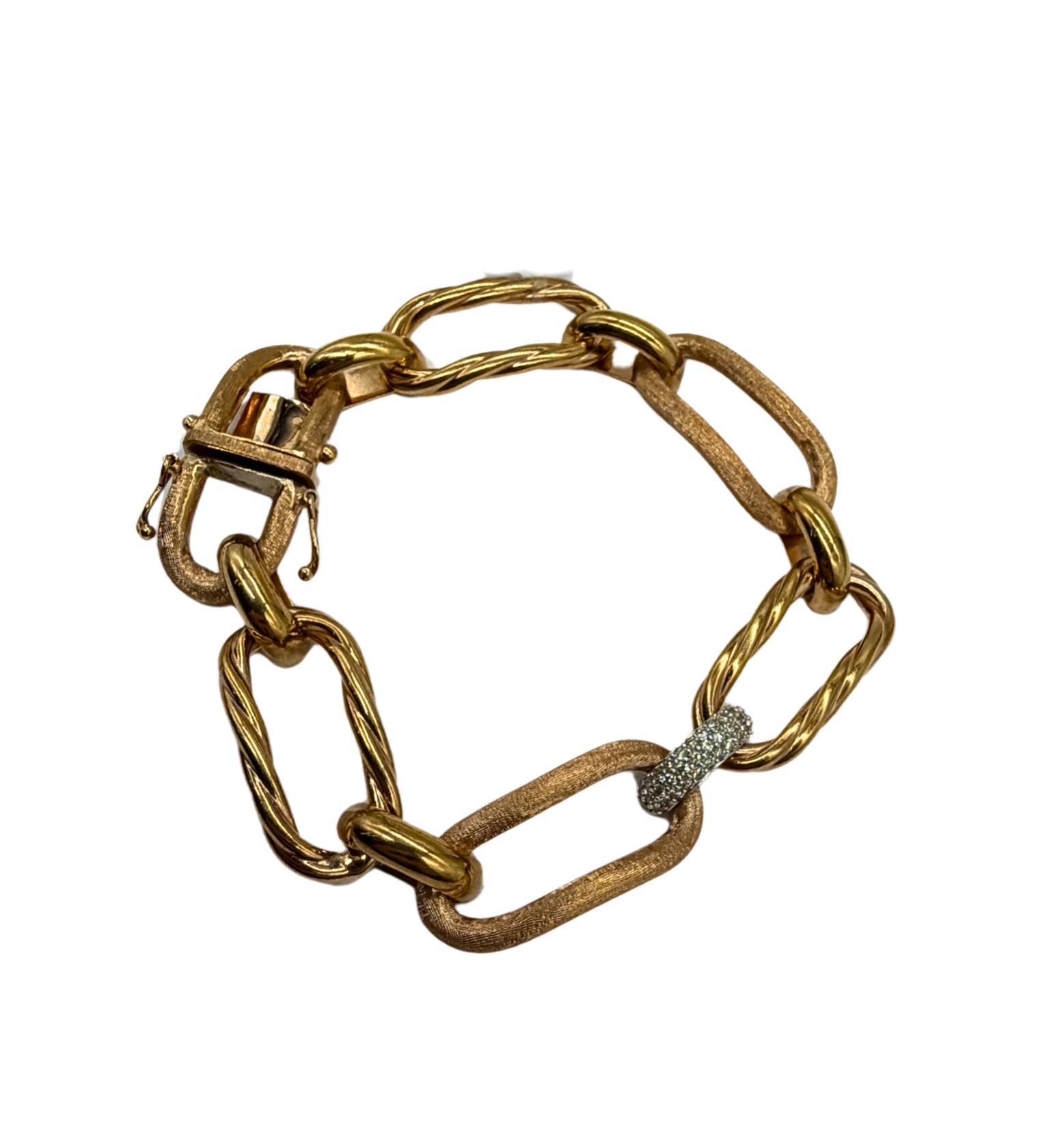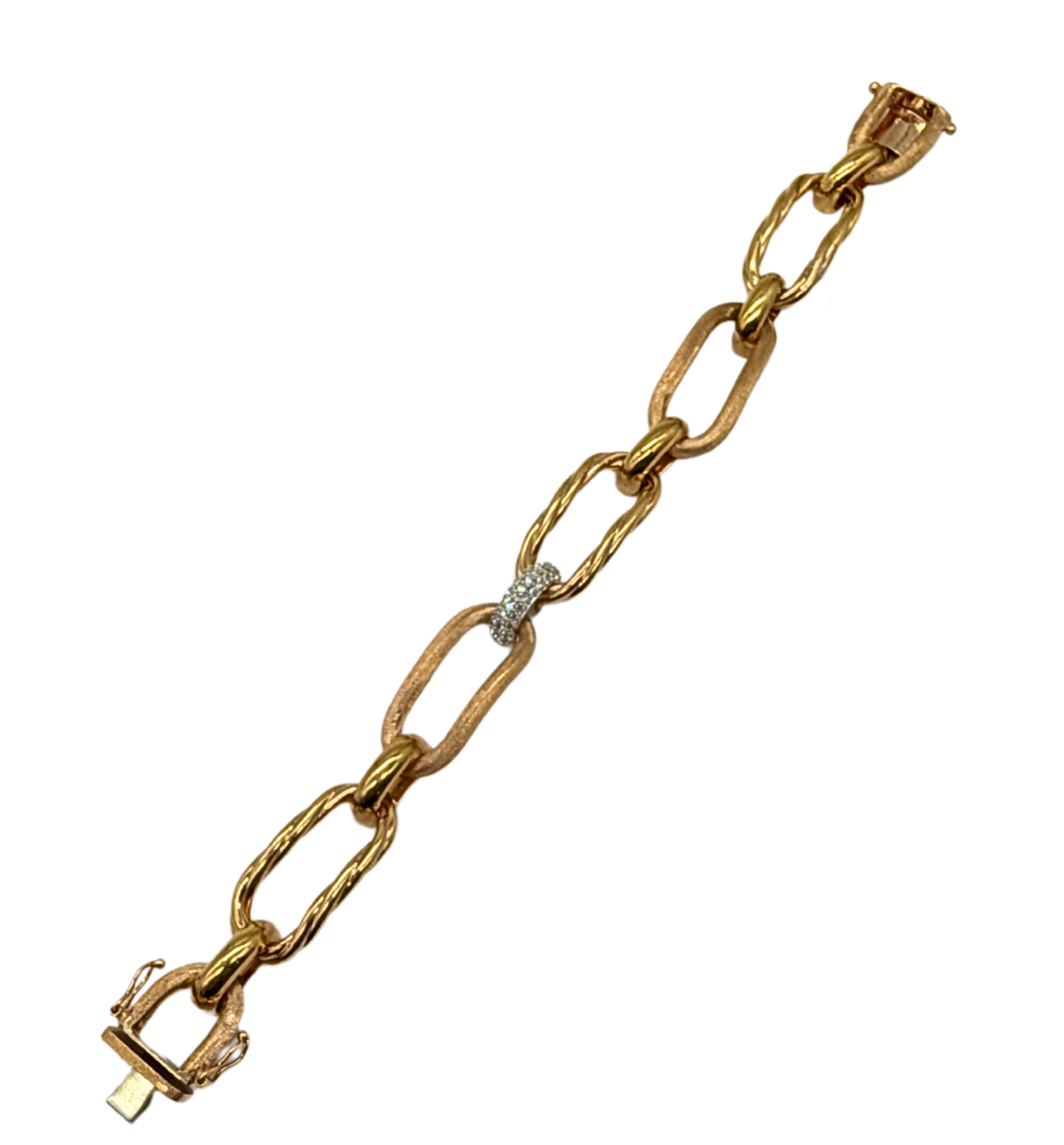 This stunning 14k rose and white gold bracelet brings a bold, modern feel with its oversized twisted oval links and contrasting satin textures. Each link creates a rich mix of shine and brushed detail, giving the piece a dimensional, designer-level look.