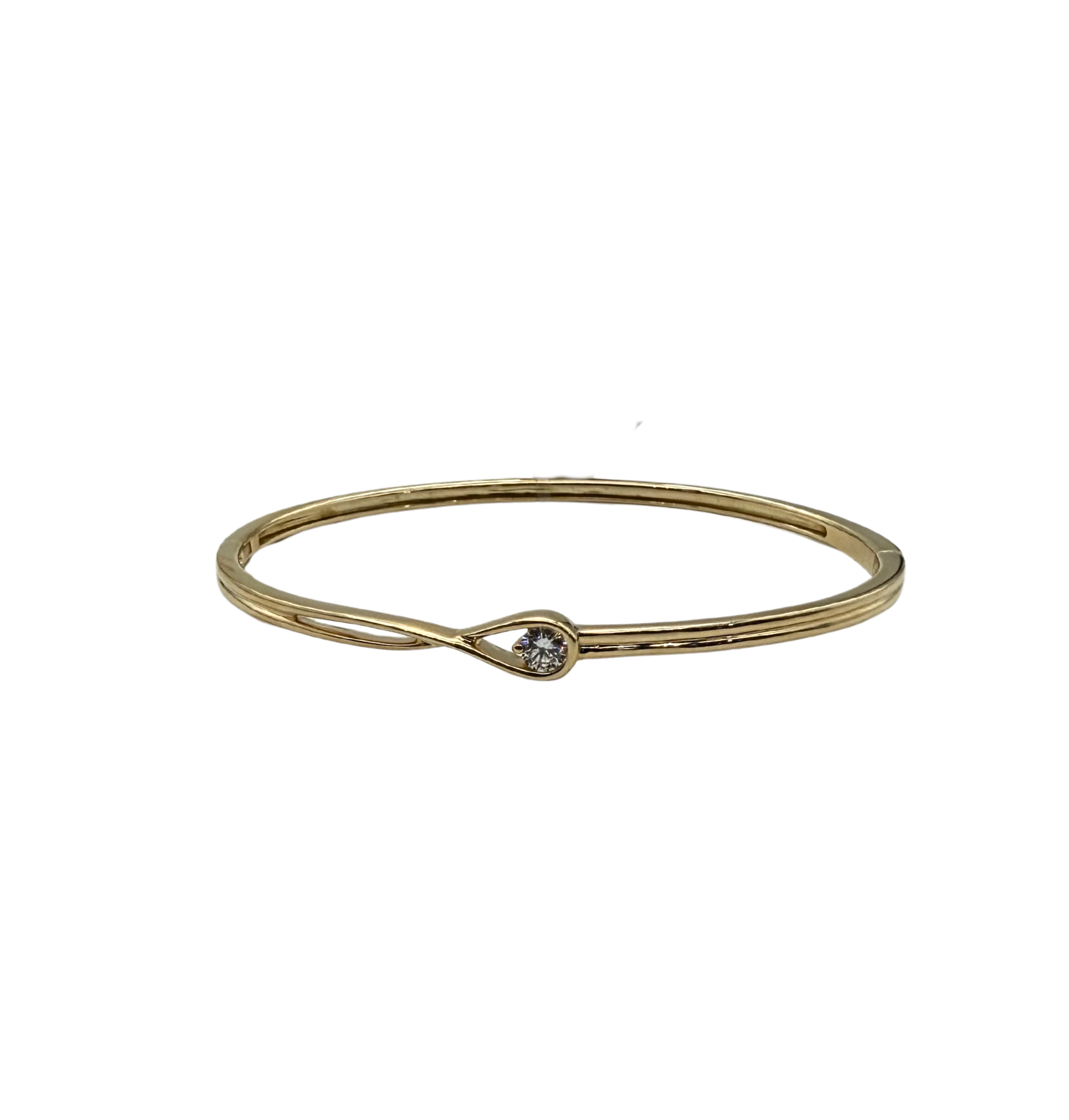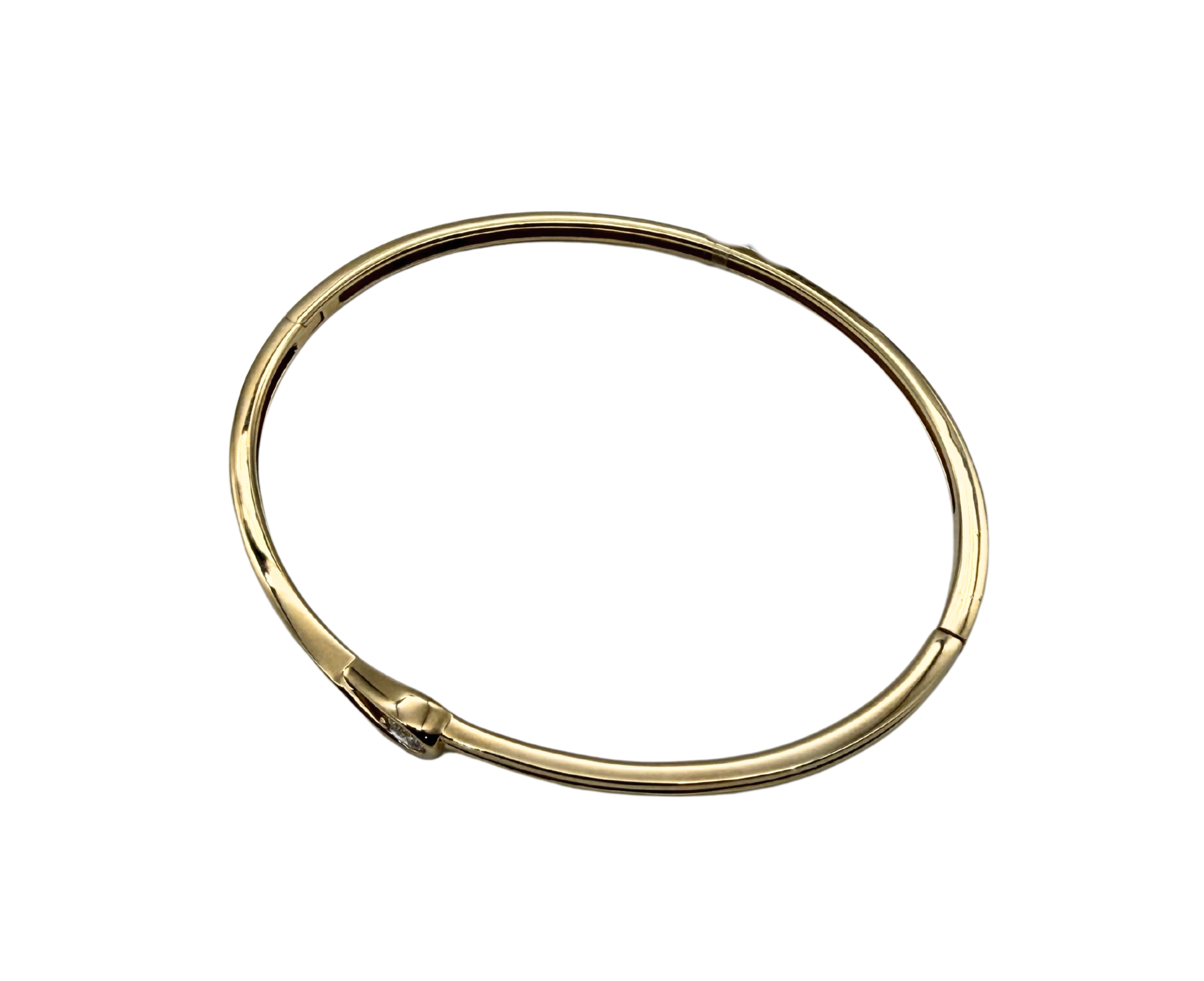 This elegant Pandora bangle bracelet is crafted in rich 14k yellow gold and features a sleek, minimalist silhouette accented by a sparkling .25 carat total weight lab created diamond. The diamond is securely set within a graceful teardrop-style accent, adding a refined focal point while maintaining a clean and modern look.