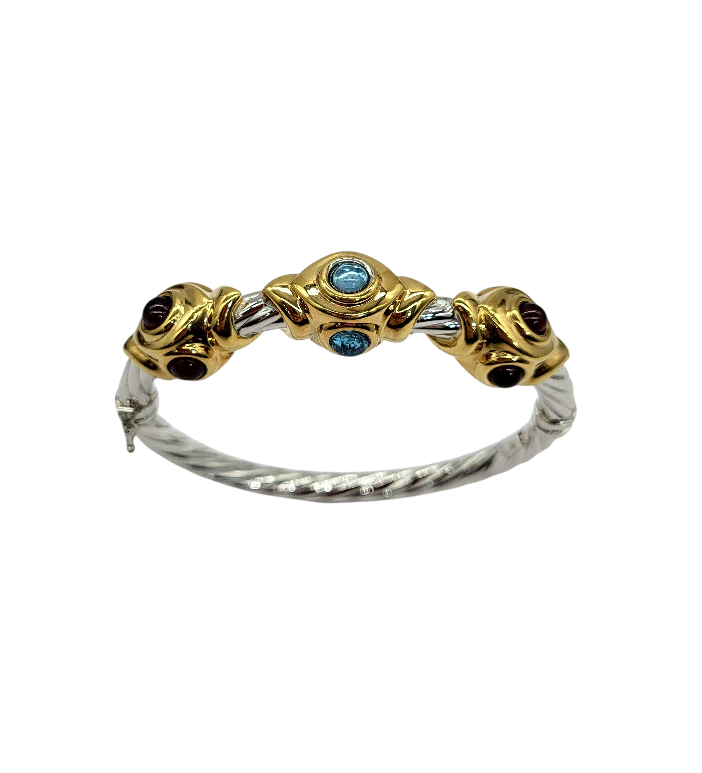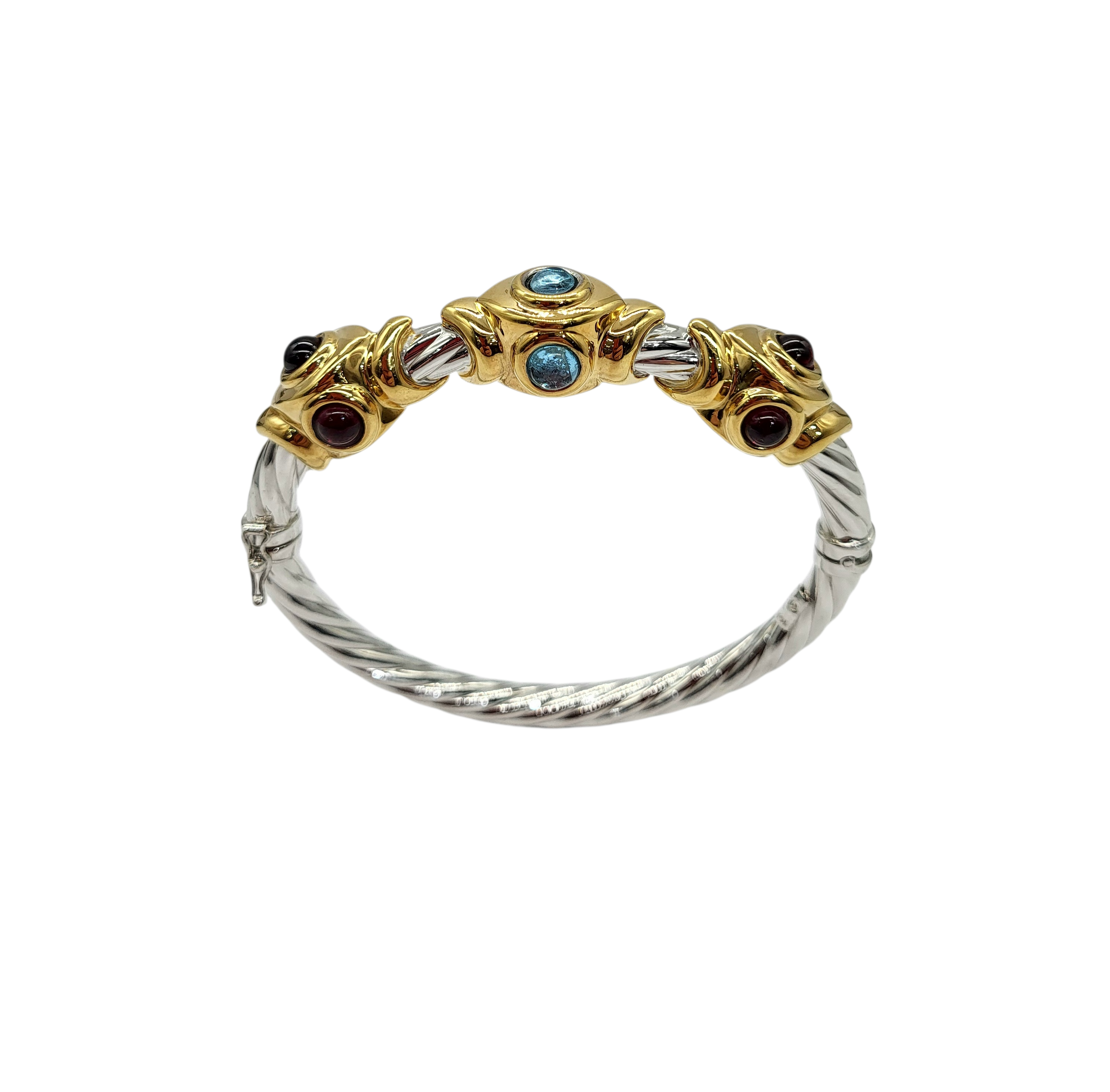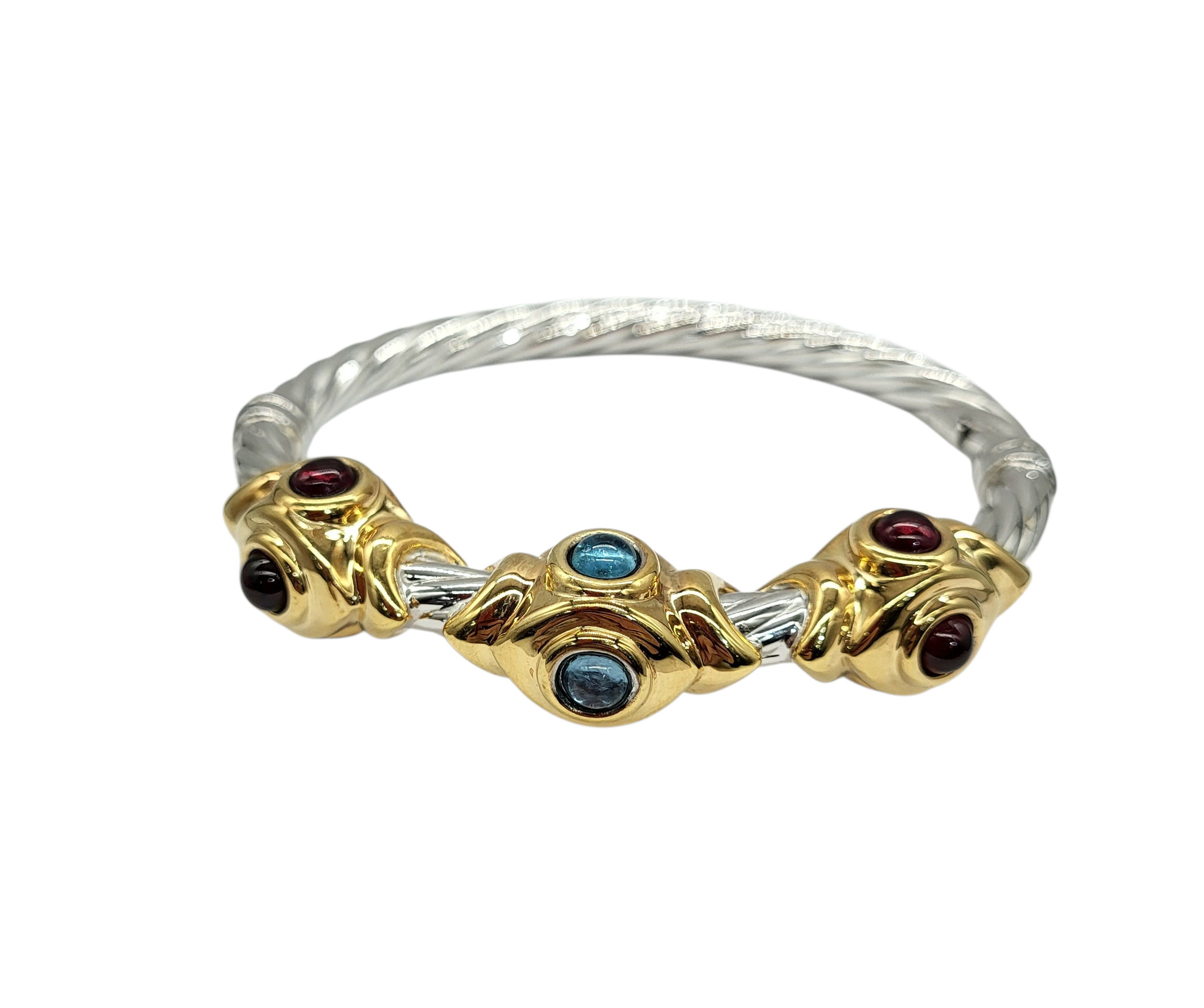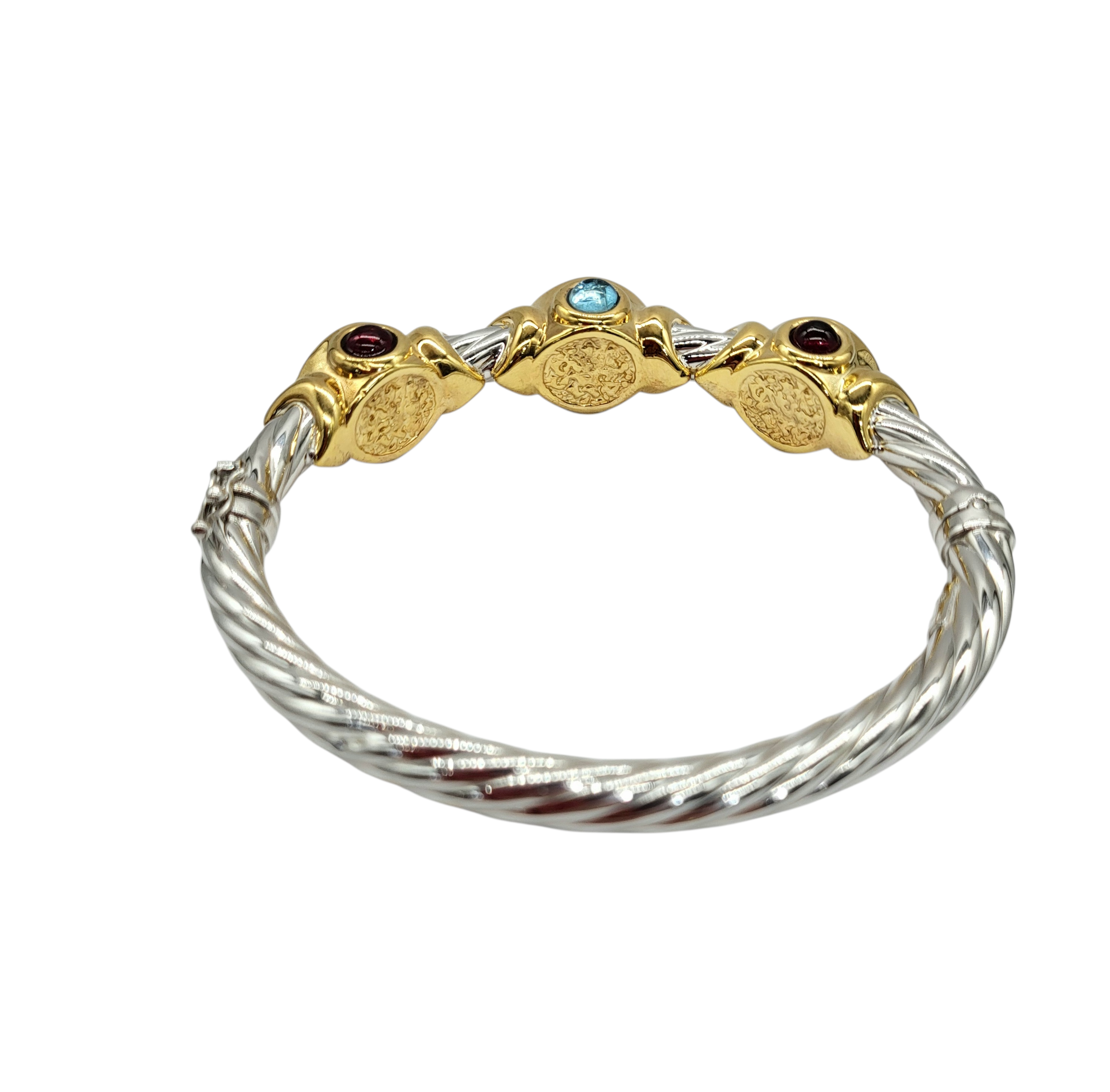 Elevate your style with the breathtaking two tone 14 katat gold gemstone bangle bracelet. Crafted from stunning 14-karat white and yellow gold, this exquisite piece features a cable twist design adorned with vibrant cabochon polished bezel set gemstones. Embrace the beauty of its colors, perfect for adding a touch of elegance to any outfit!