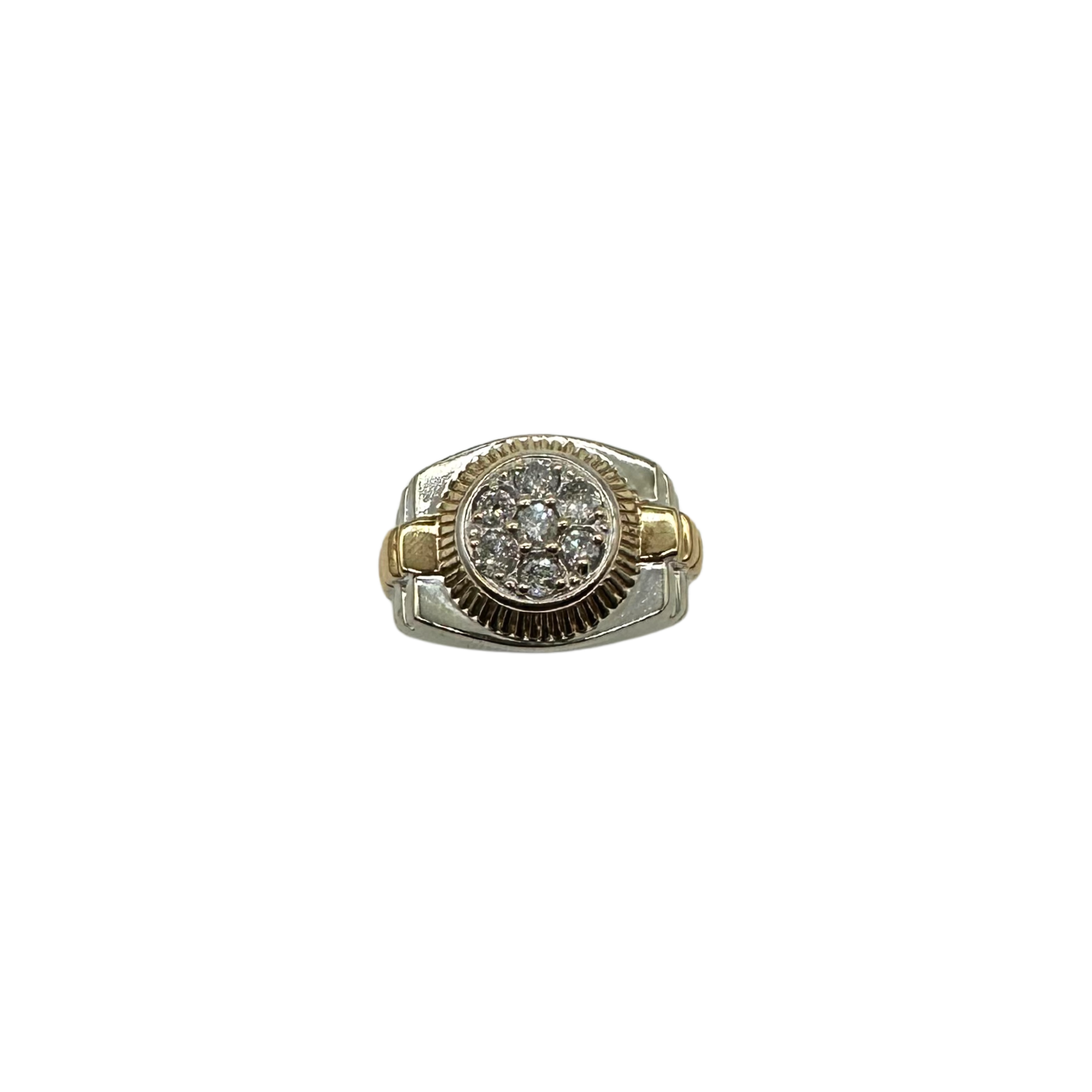 Bold and commanding, this striking men’s ring features a unique watch-style band and a round cluster of brilliant diamonds totaling 1.15 carats. The mix of 10k yellow and white gold gives it an upscale two-tone appeal, with bold ridged framing around the centerpiece for that eye-catching pop.