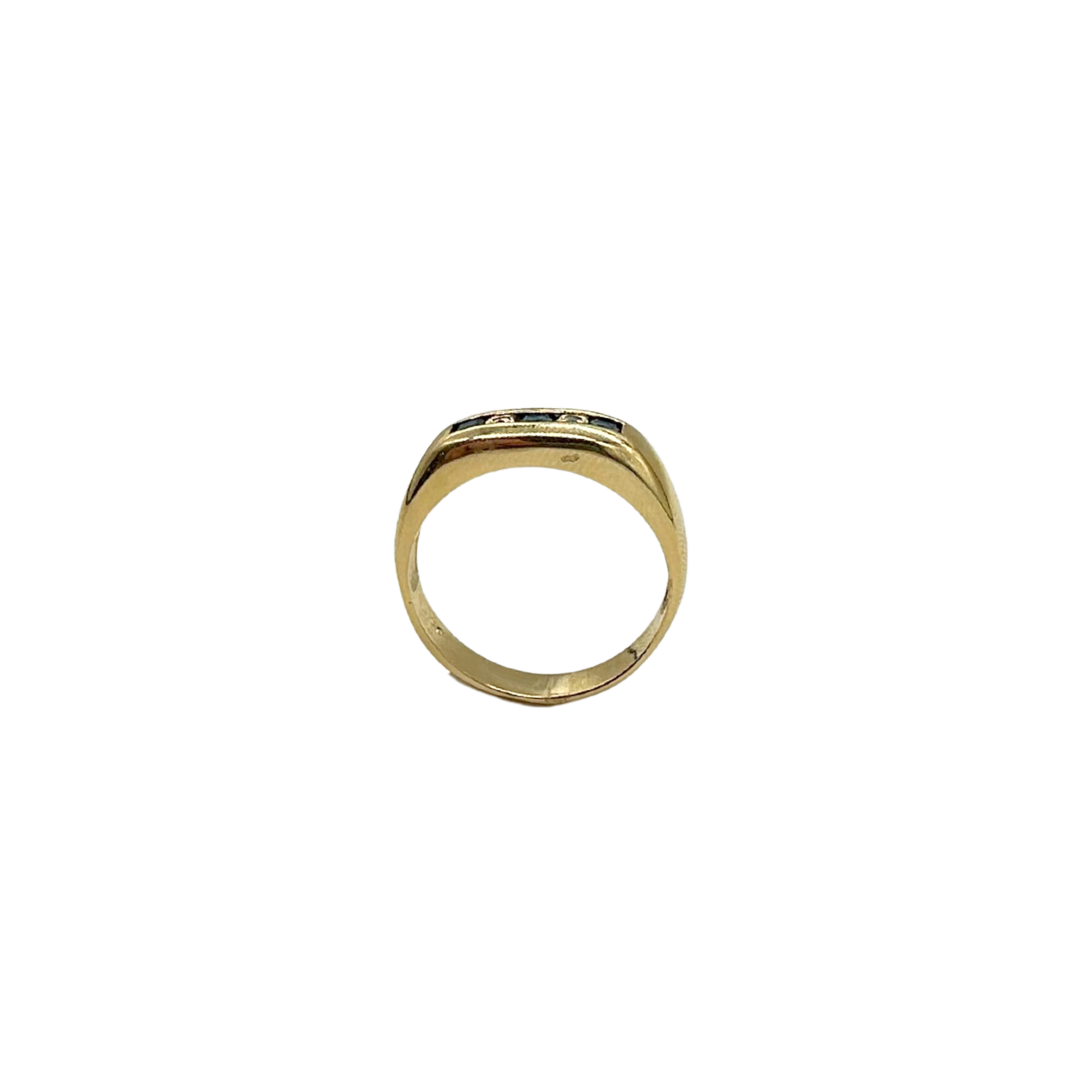 Bold and timeless, this 10k yellow gold ring features a sleek, modern design with a touch of classic sophistication. The centerpiece showcases a trio of deep blue baguette-cut sapphires set in a clean channel setting, accented by two sparkling round diamonds that bring just the right amount of brilliance to the look.
