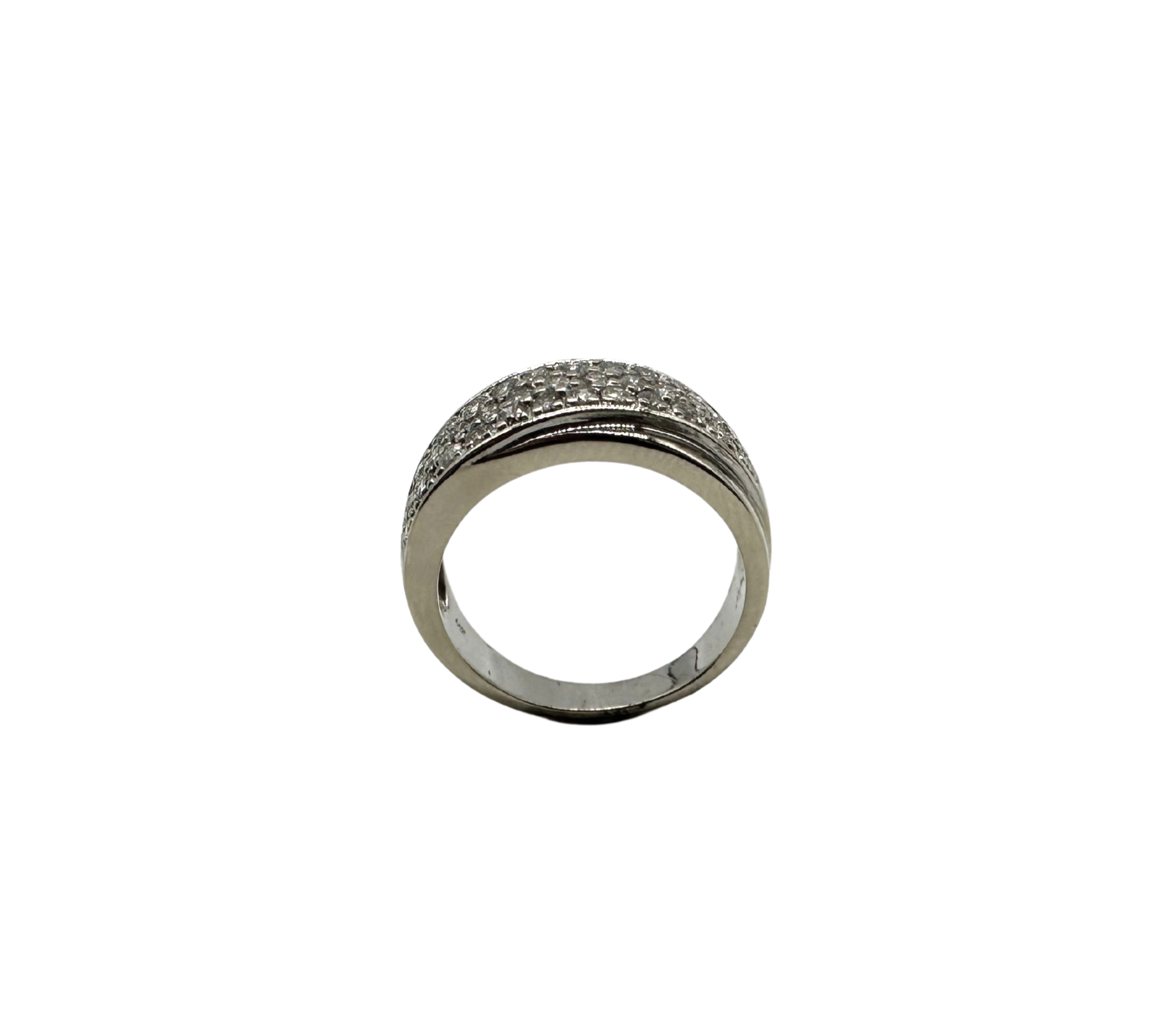 This elegant 14k white gold band features a captivating diagonal design, fully encrusted with approximately 1 carat total weight of brilliant pave-set diamonds.