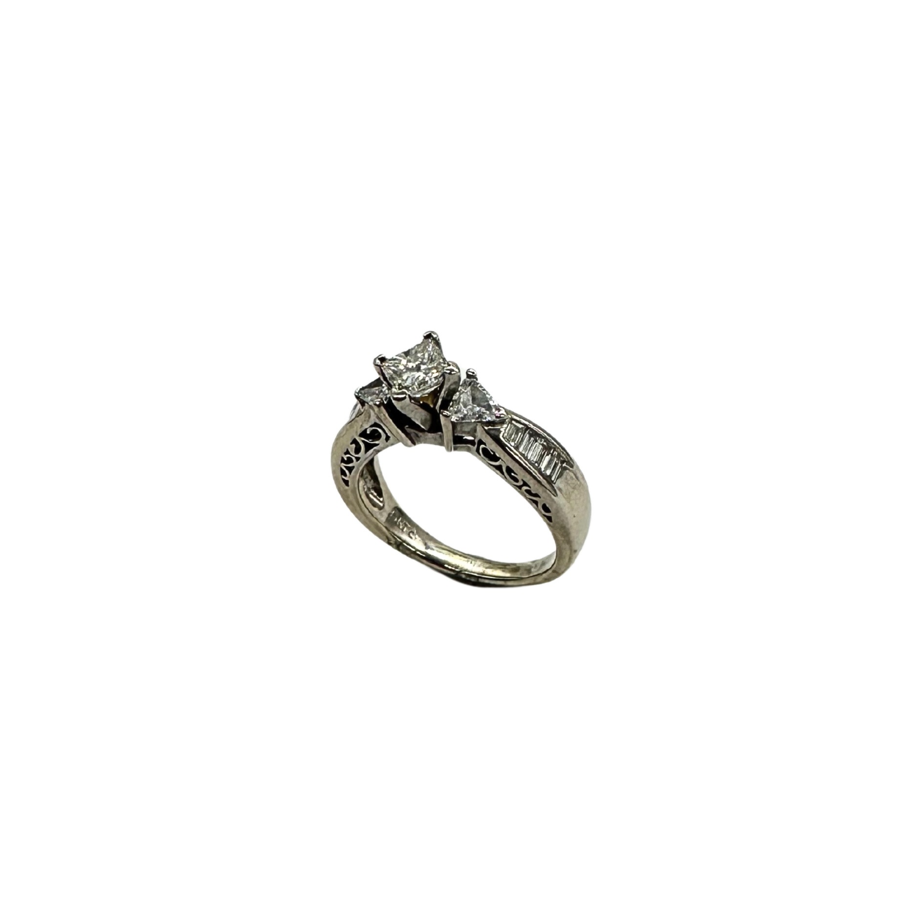 This stunning diamond ring is crafted in solid 14k white gold and features a brilliant square-cut center diamond, accented by trillion-cut side stones and baguette channel-set diamonds along the band. The intricate filigree details on the gallery add a touch of vintage charm, making this ring both timeless and unique.