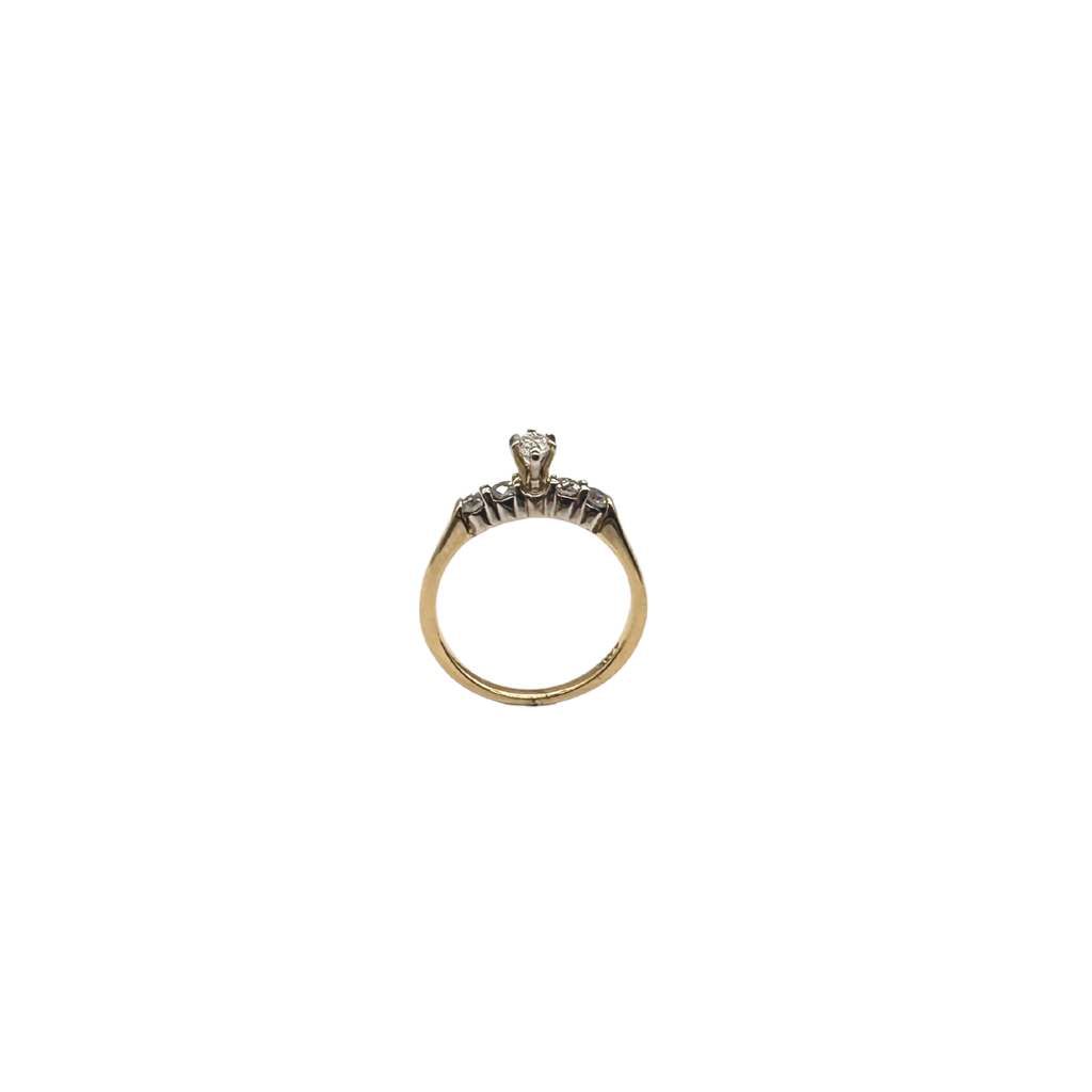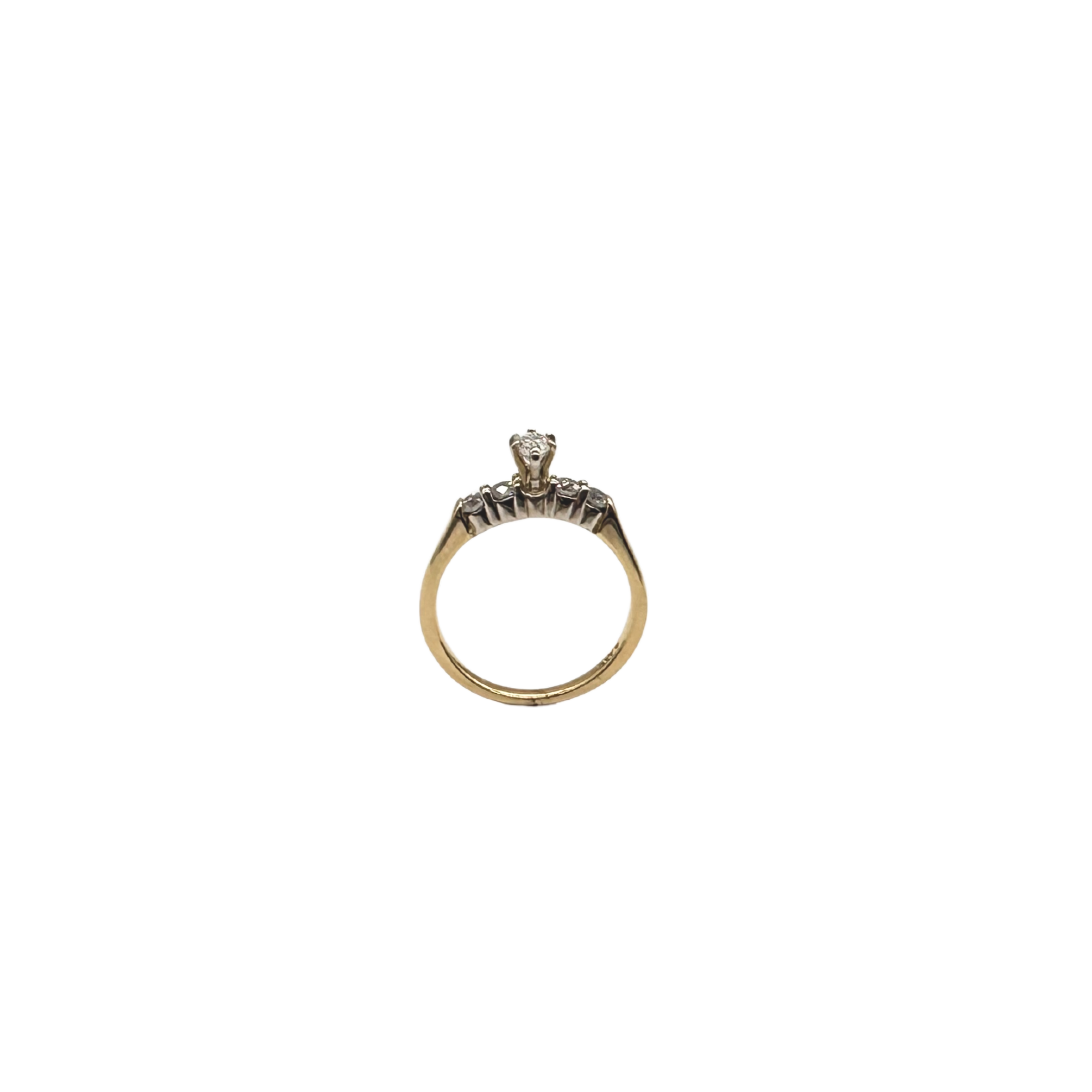 This beautiful two-tone diamond ring features a marquise-cut center diamond accented by round side stones, all set in a combination of 14k white and yellow gold.
