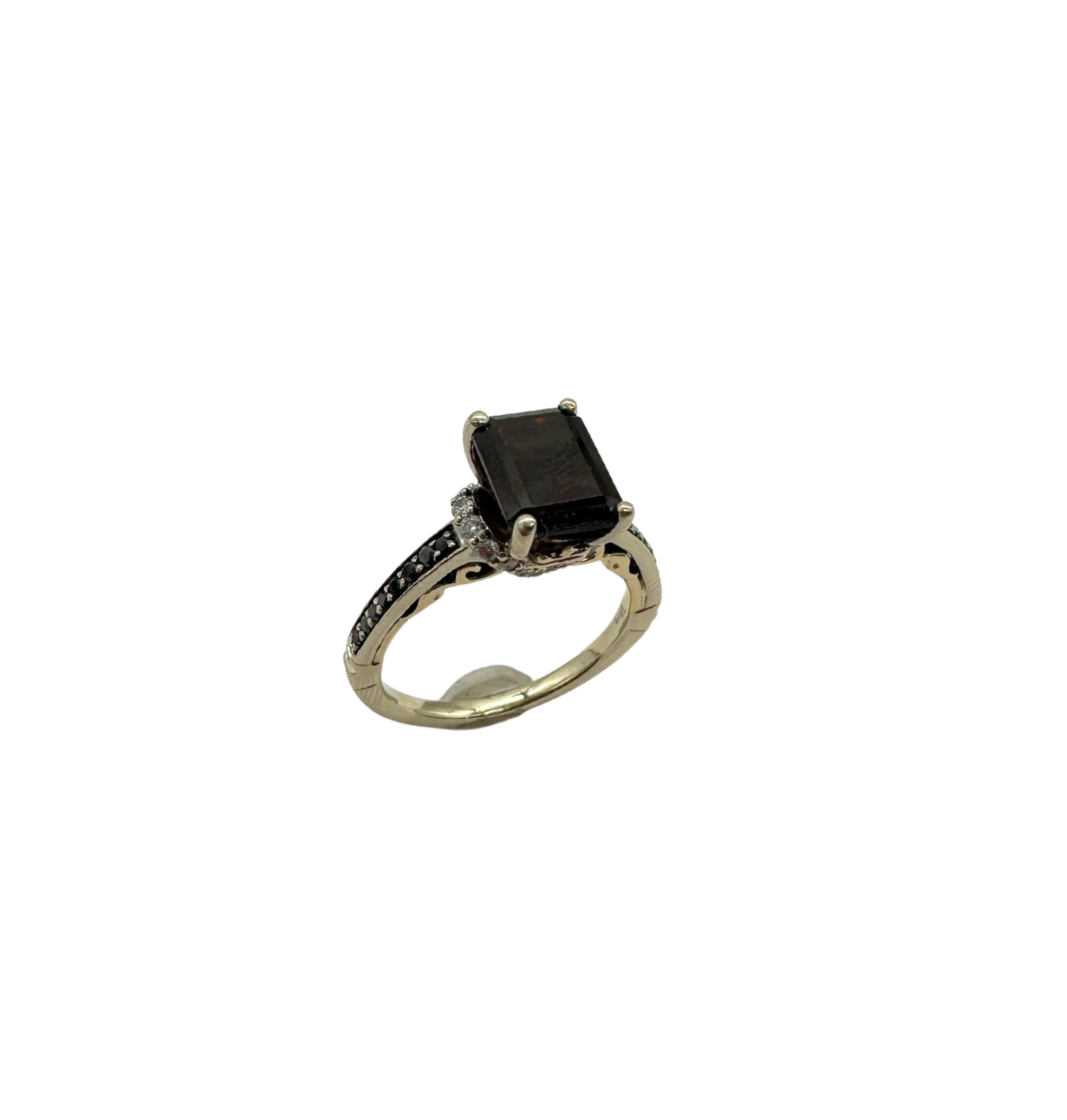 A touch of fairy tale magic meets timeless sophistication in this enchanting Disney-inspired ring. Crafted from 14k yellow and white gold, this beautifully detailed piece features a bold emerald-cut garnet as the centerpiece, surrounded by sparkling 1/3 ctw accent diamonds that dance with light.