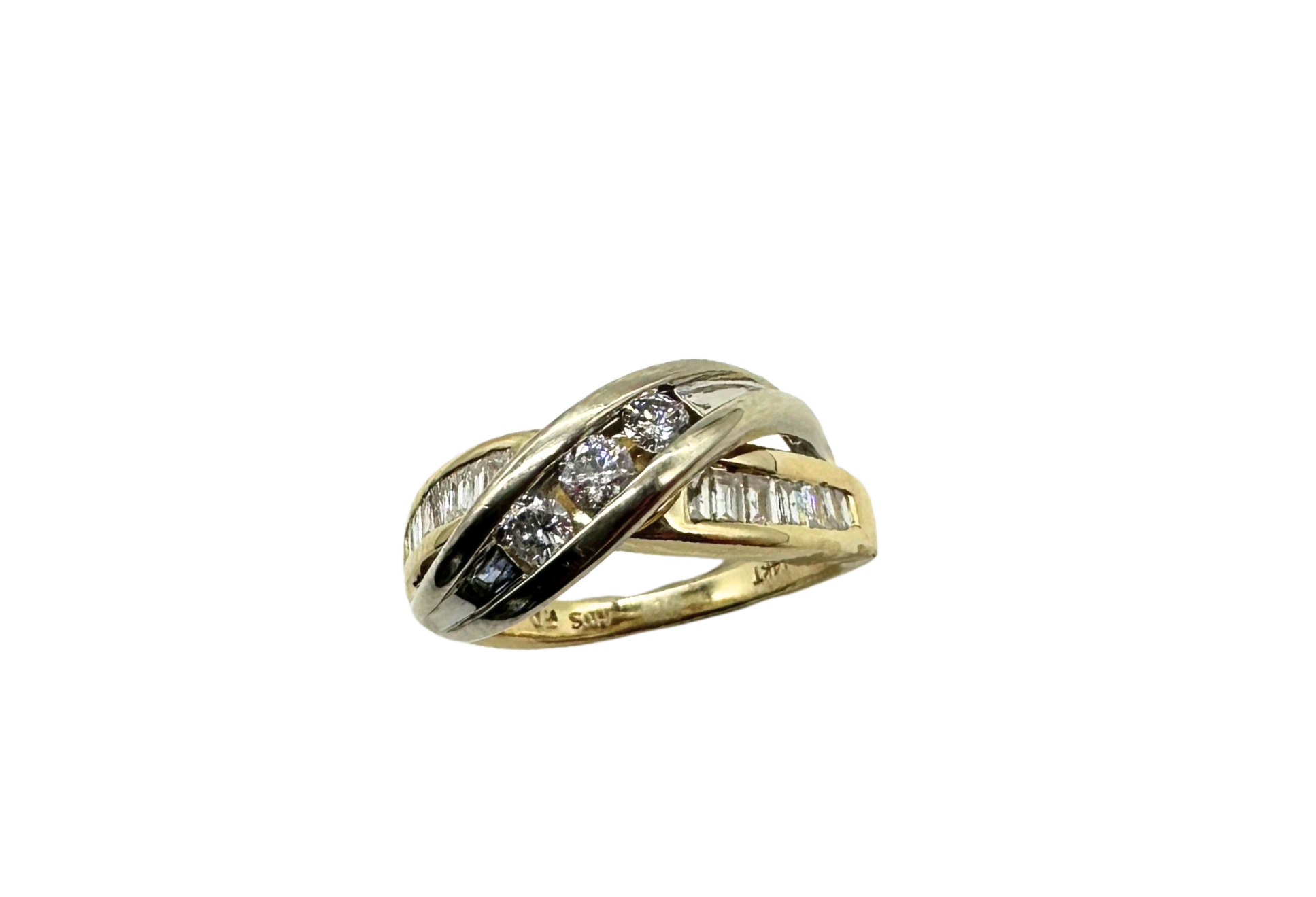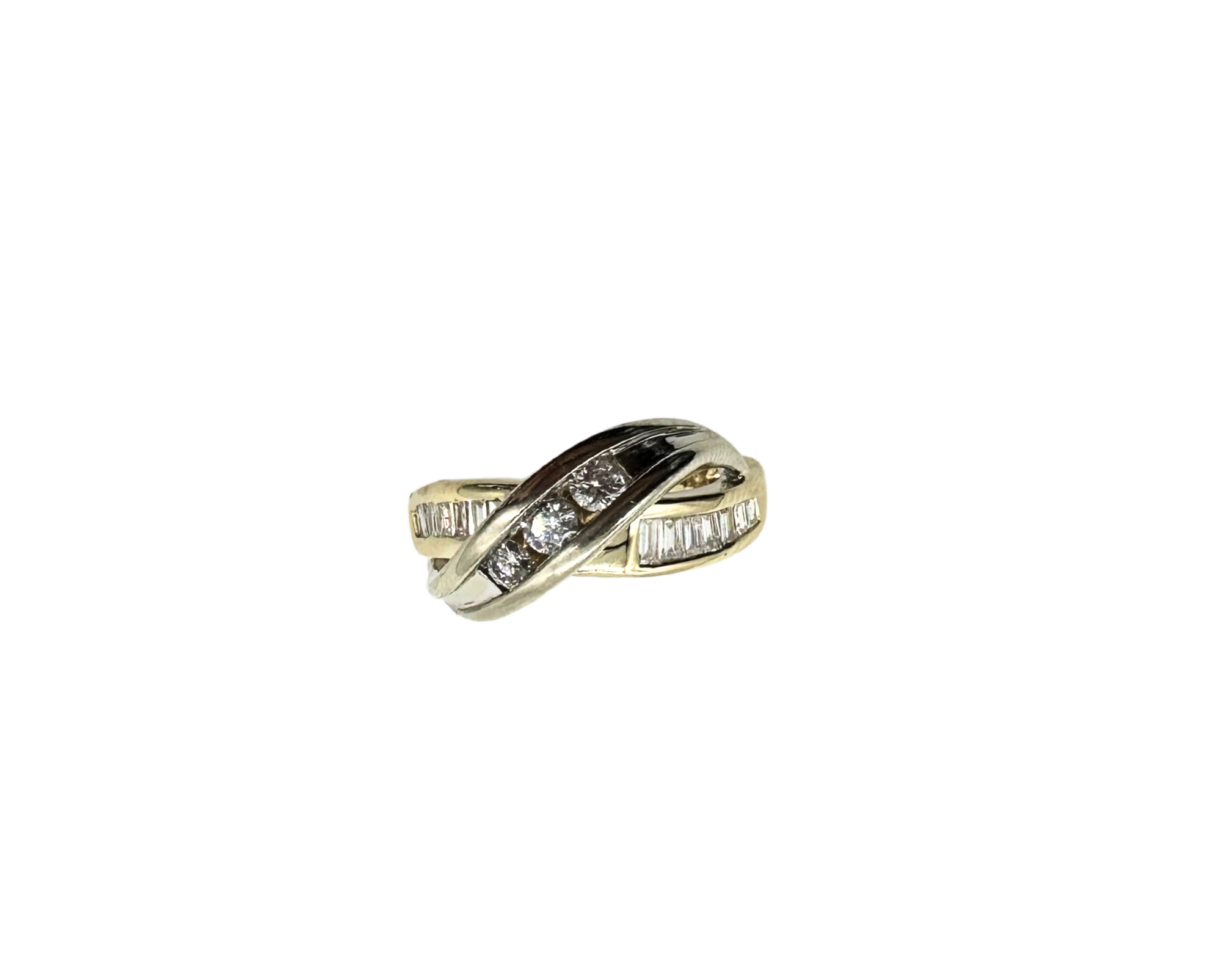 This gorgeous crossover ring blends classic charm with modern flair. Crafted in 14k yellow and white gold, it features a sleek crisscross design set with brilliant round and baguette-cut diamonds totaling 1/2 carat.