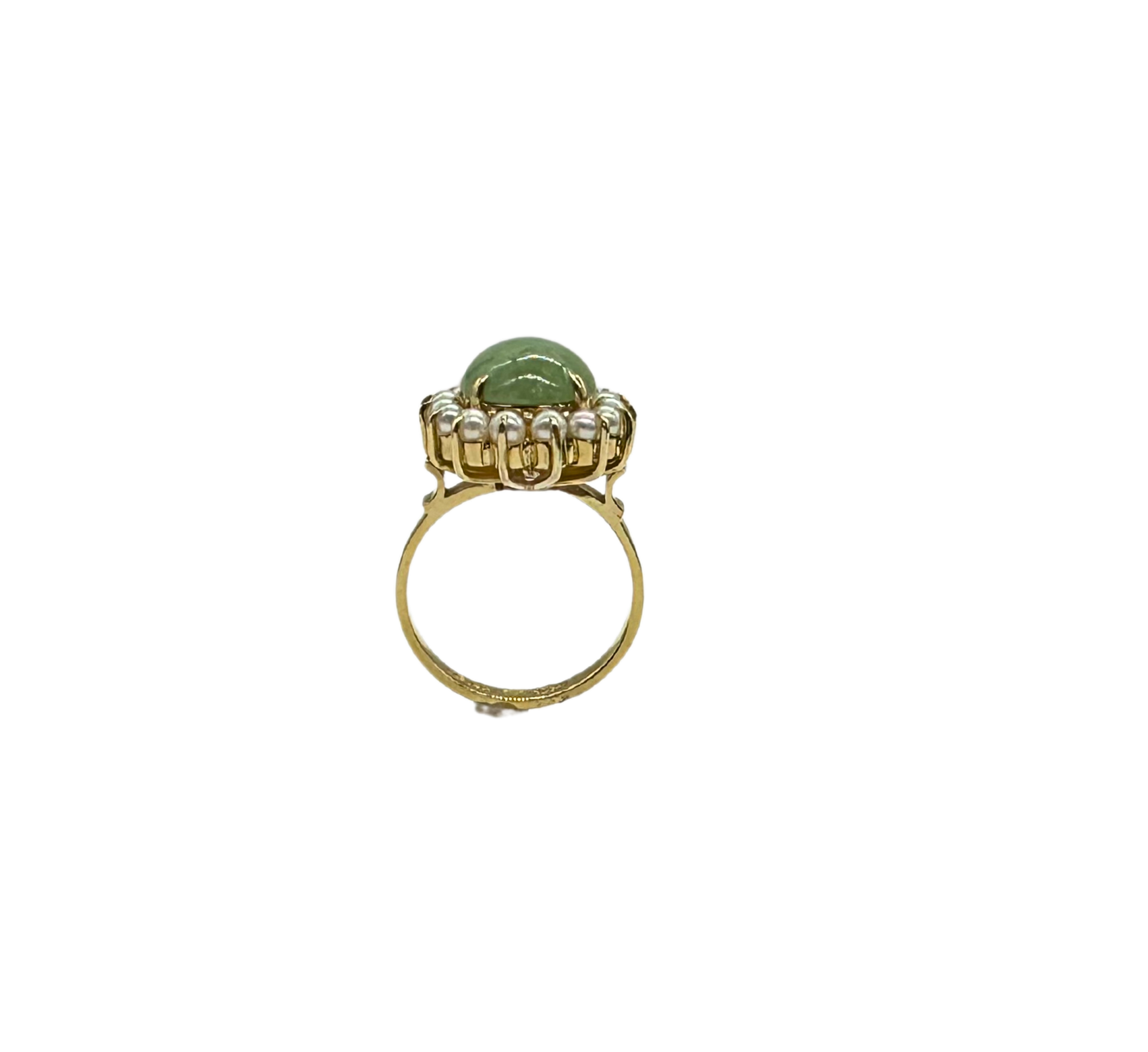 This stunning vintage-style ring showcases a rich oval jade cabochon, elegantly framed by a luminous halo of creamy cultured pearls. Crafted in warm 14k yellow gold, the design is both regal and timeless, offering an heirloom-quality piece that effortlessly blends natural beauty with fine craftsmanship. The bold green of the jade pops against the soft shimmer of the pearls, creating a graceful statement for any occasion.