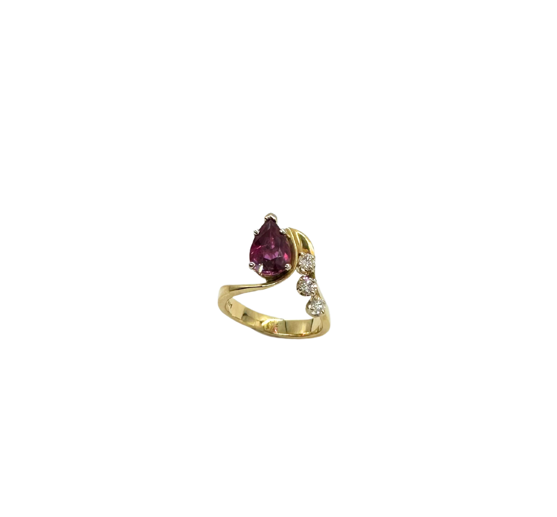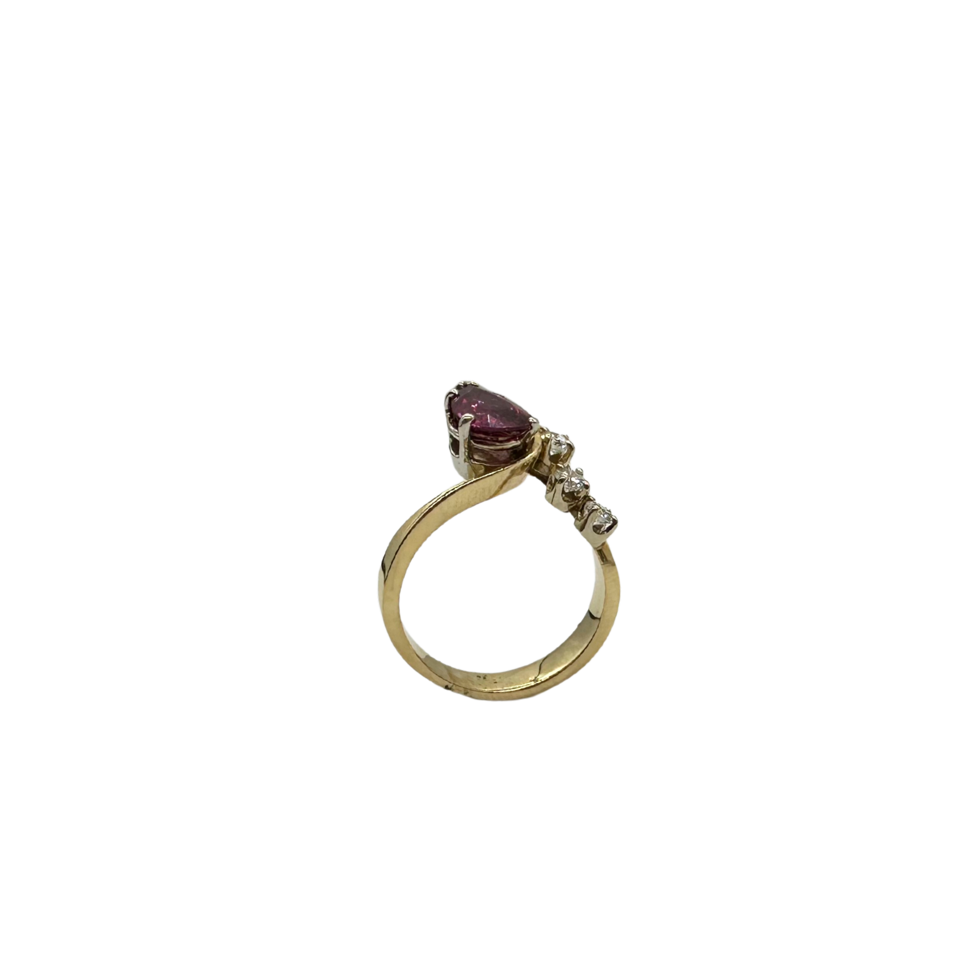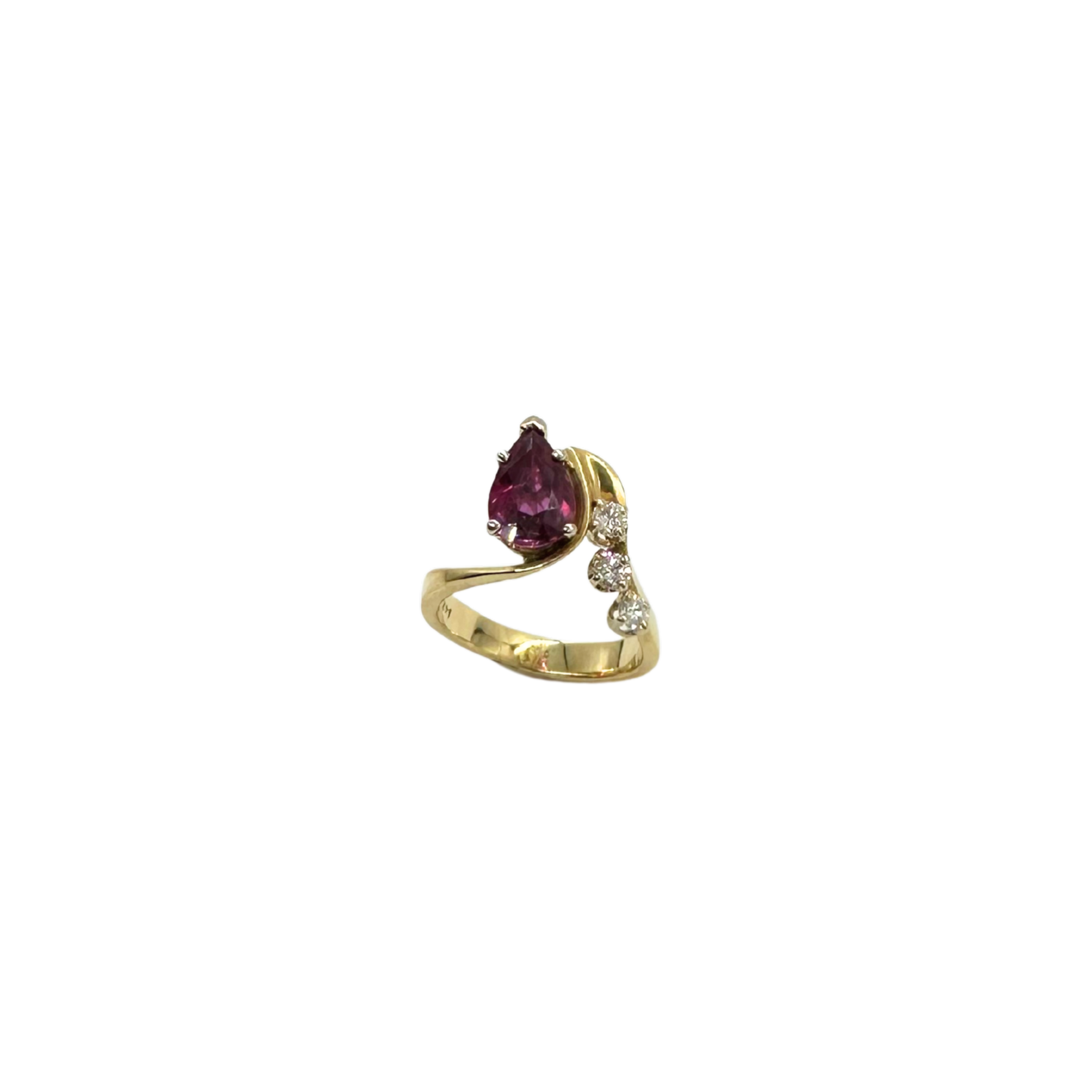 Turn heads with this striking 14k yellow gold bypass ring, featuring a captivating pear-shaped ruby at the center of a swirling, modern design. The rich magenta-red hue of the ruby is elegantly framed by a cascade of shimmering diamonds, totaling approximately 1/3 ctw.