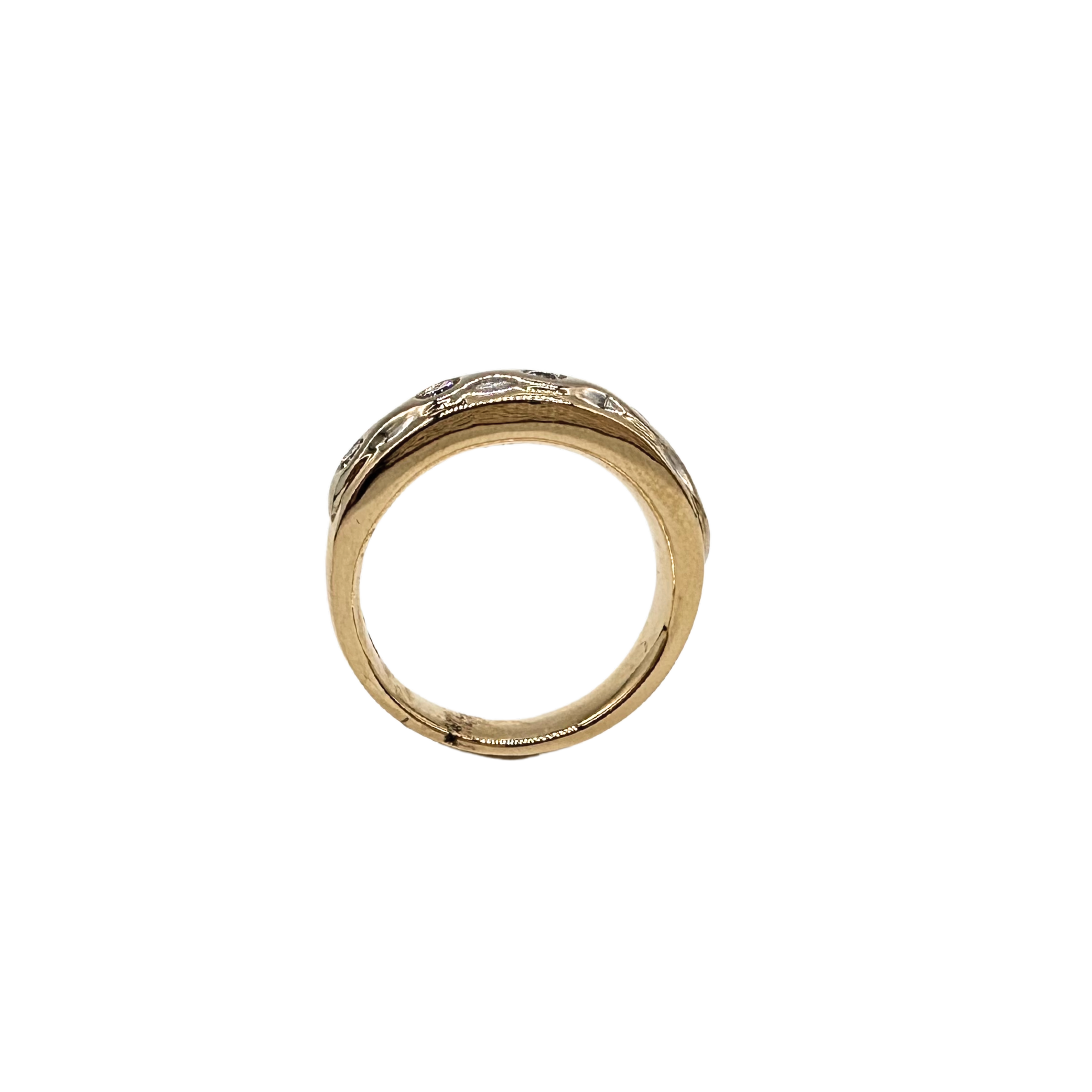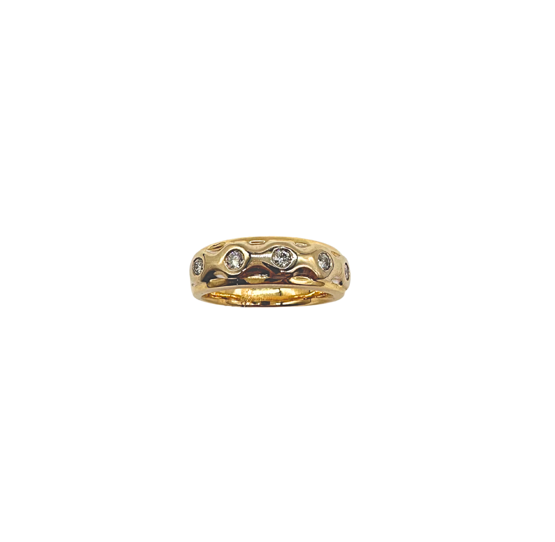 This elegant and modern 14k yellow and white gold band showcases five flush-set diamonds totaling approximately 1/4 carat. Each diamond is securely embedded in a flowing wave-style design that adds dimension and sophistication.