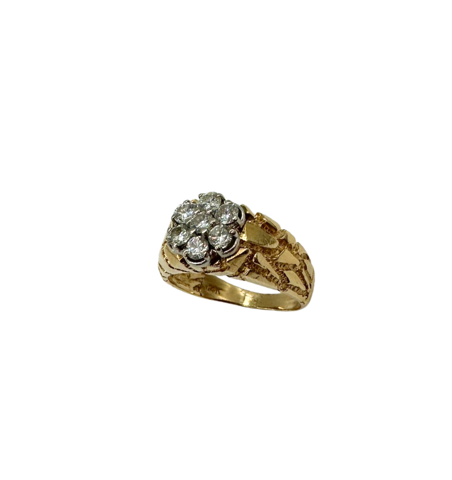 Radiating with vintage charm and standout brilliance, this 14k yellow and white gold cluster ring is a true showstopper. Weighing 8.3 grams, this piece features a dazzling 3/4 carat total weight of diamonds arranged in a bold, eye-catching cluster that captures the light from every angle.