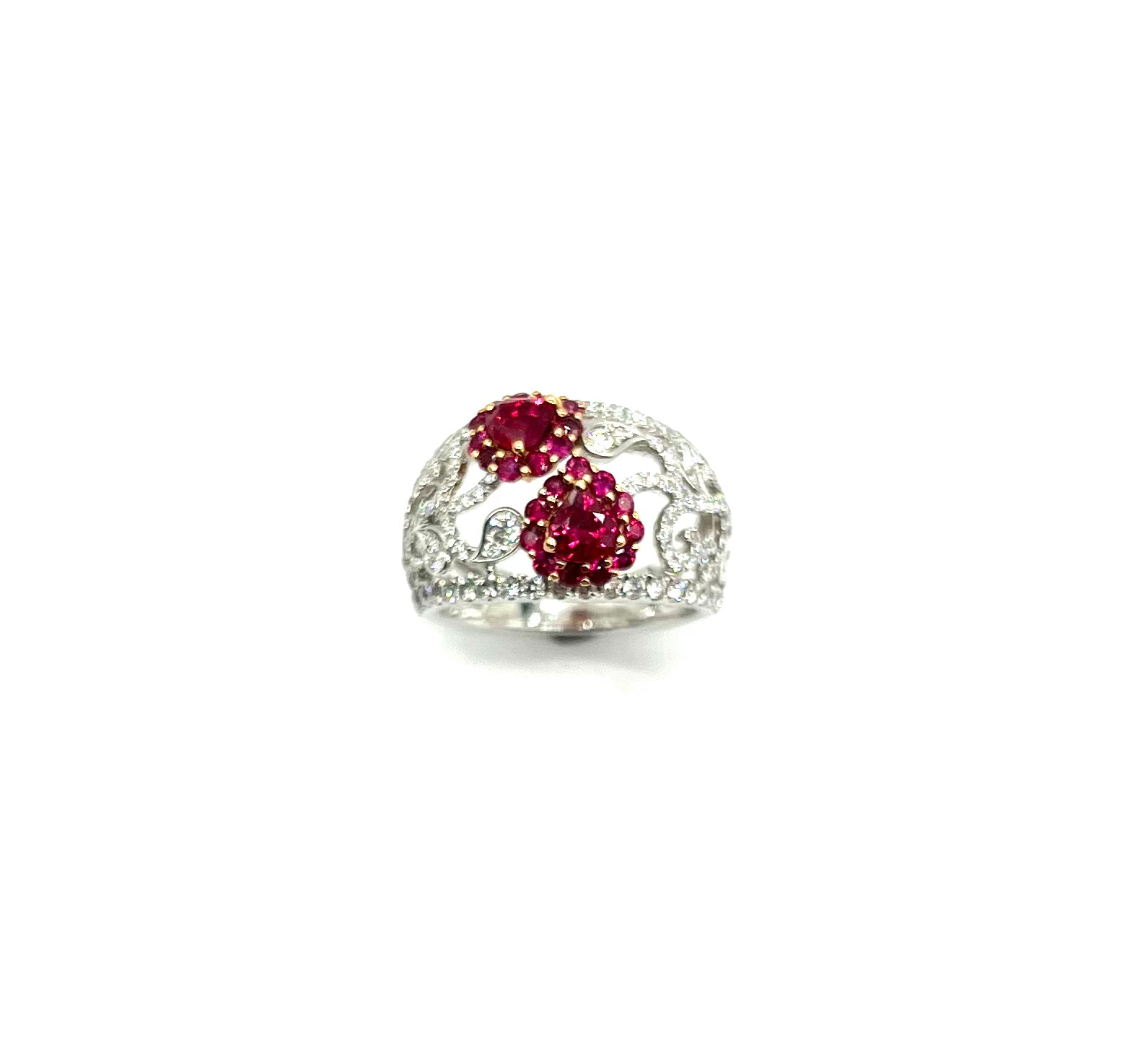 18k White Gold Ruby and Diamond Floral Cutout Ring