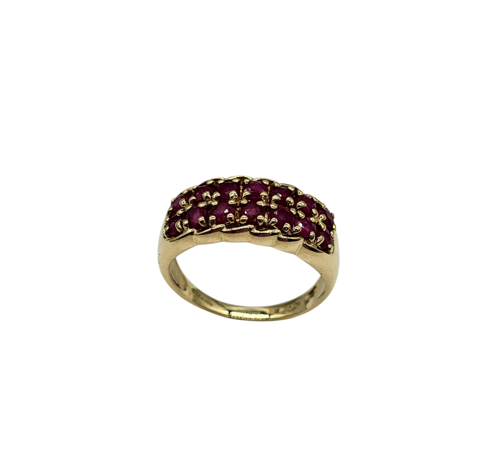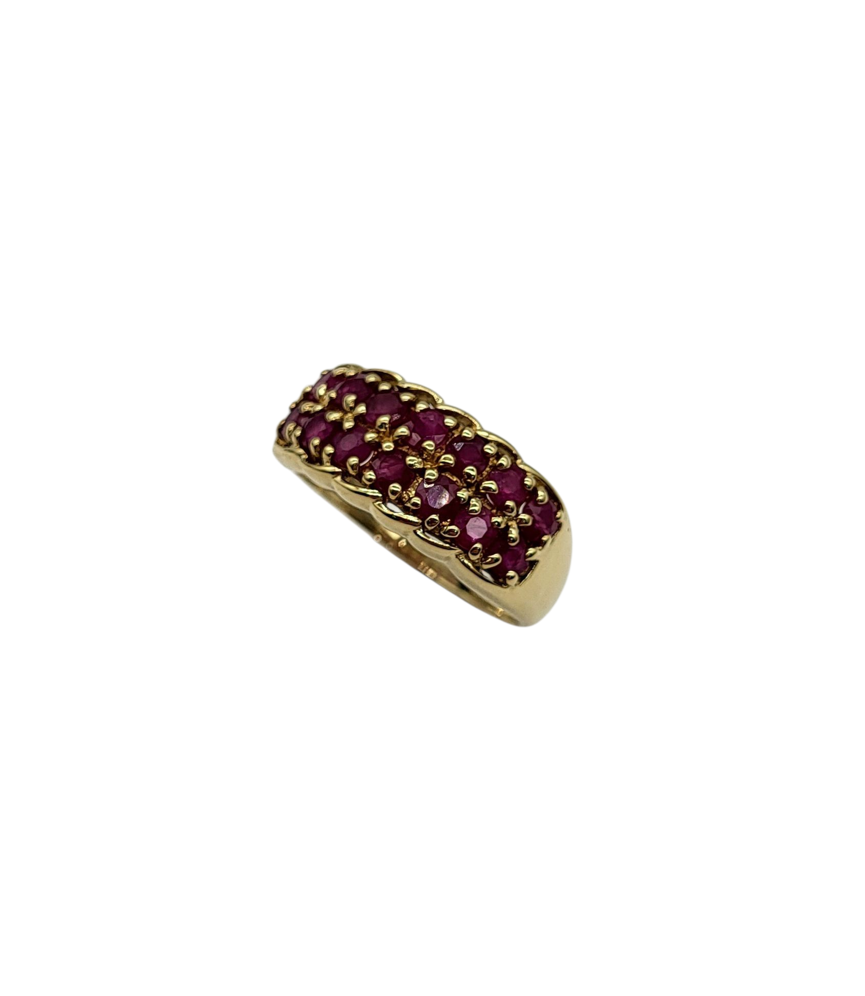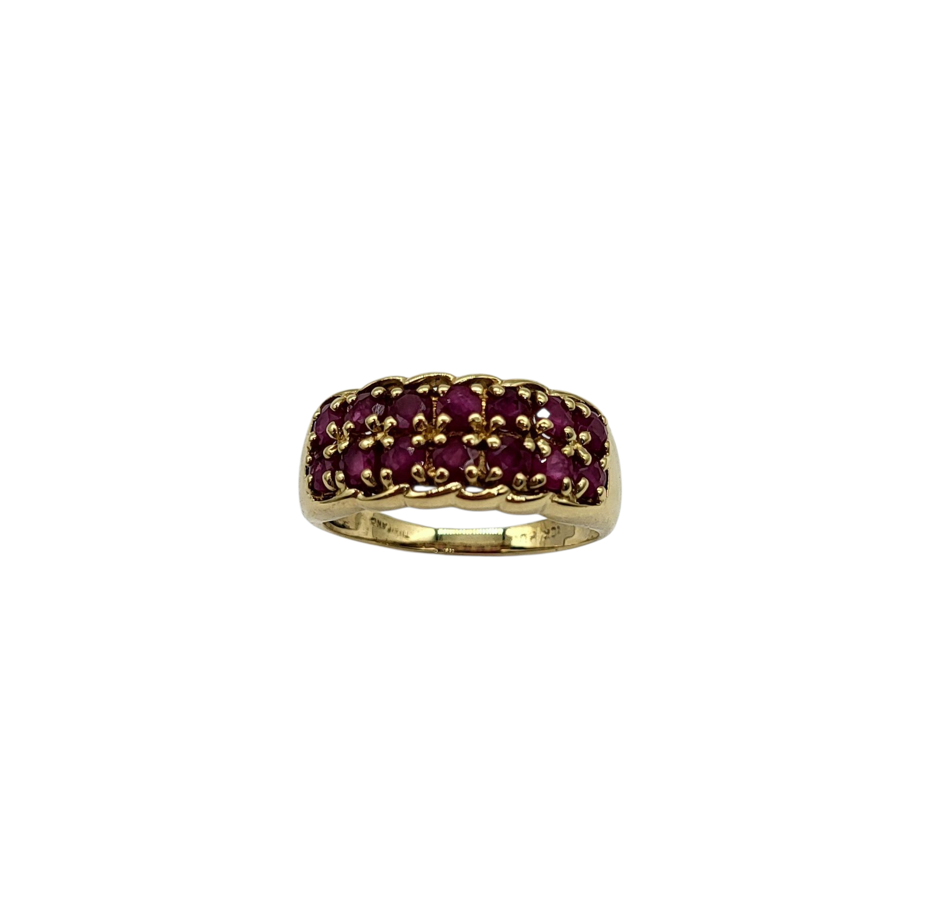 Indulge in the exquisite elegance of our 2 Row Ruby Band. Set in a 10 karat yellow gold scalloped mount, this timeless piece features two rows of stunning rubies, adding a touch of luxury and sophistication to any ensemble. Elevate your style with this exclusive and tasteful piece.