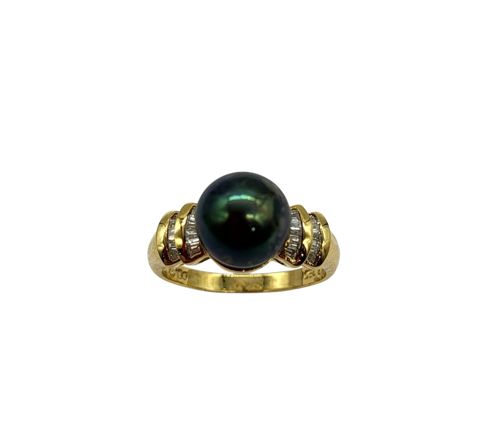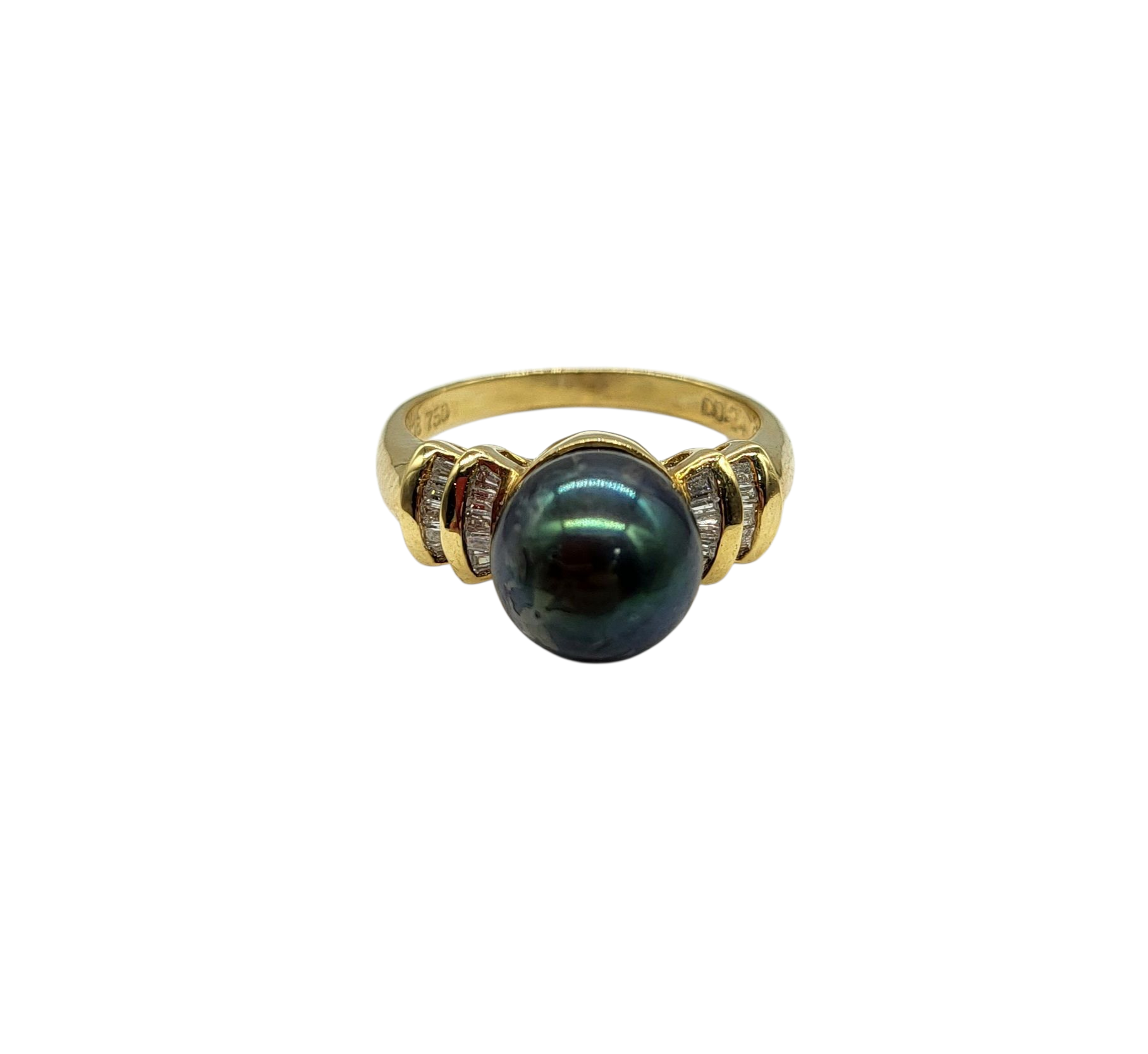 Indulge in luxury with our Black Pearl and Diamond Ring. The stunning 9mm black pearl is elegantly complemented by two step baguette diamond side accents set in 18 karat yellow gold. Elevate any outfit with this exclusive, sophisticated piece.