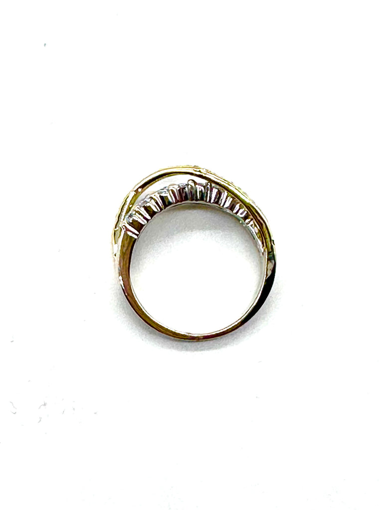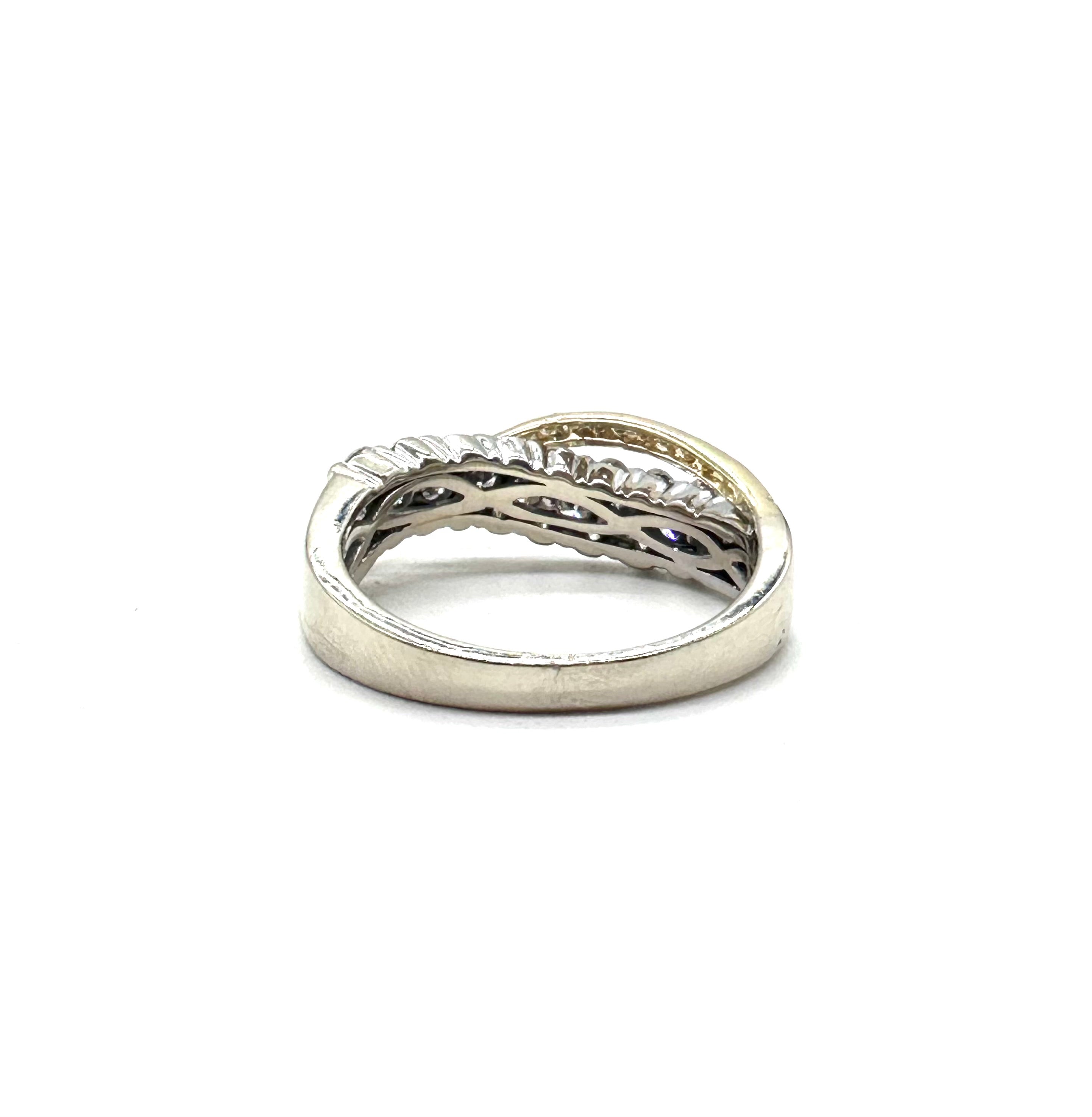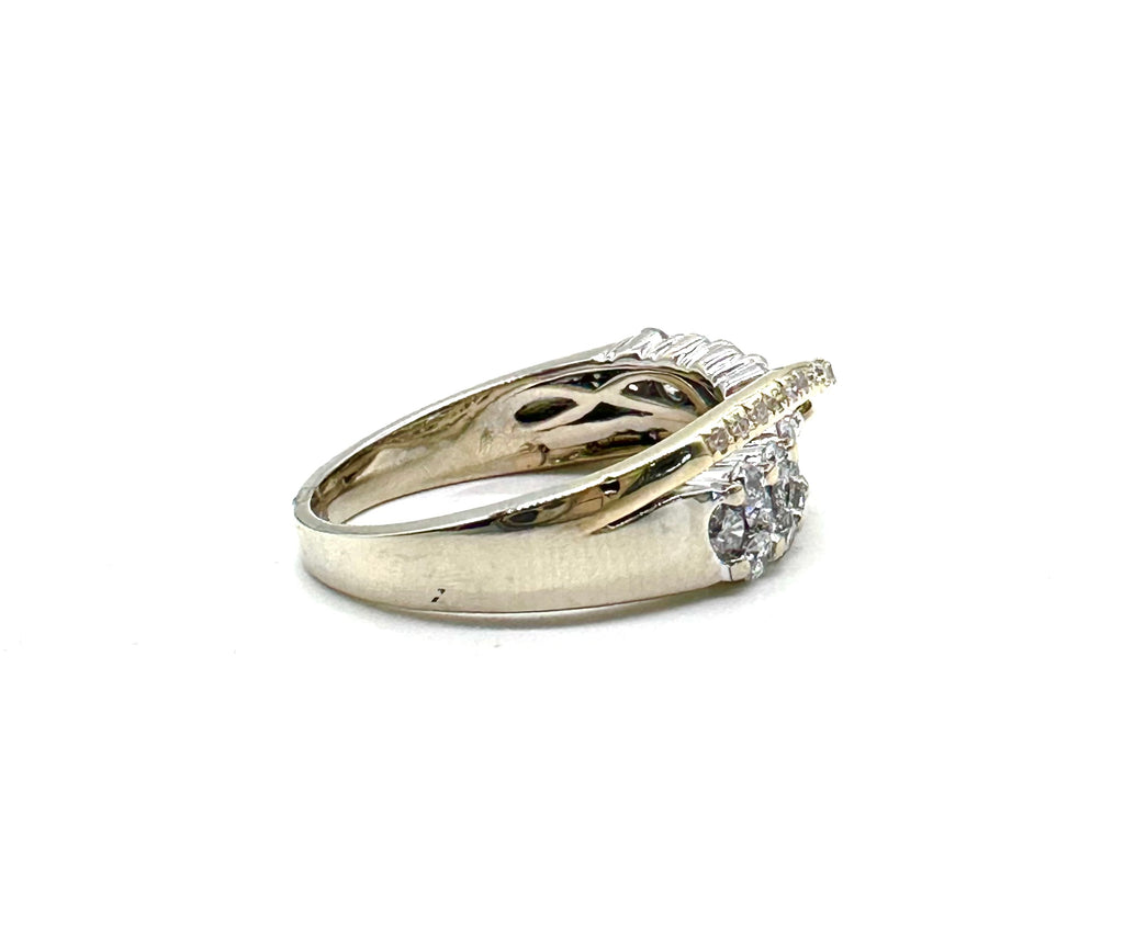 This stunning diamond three row bypass ring is set with a total of one carat of diamonds in 14 carat yellow and white gold.