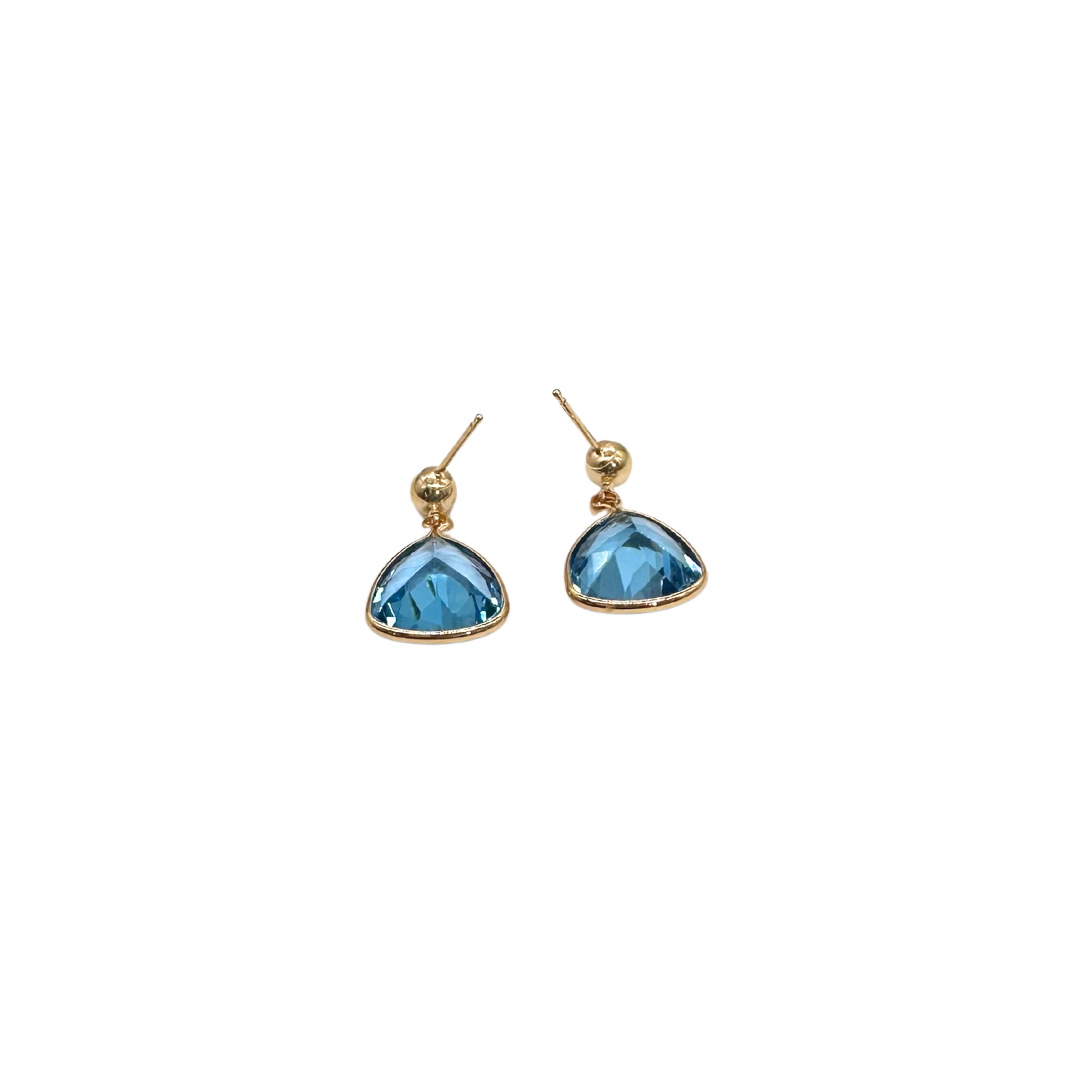 These gorgeous earrings feature vibrant trillion-cut blue topaz gemstones set in warm 14K yellow gold. Each stone is bezel-set and suspended from a polished gold ball stud, creating a lightweight, elegant dangle that catches the light beautifully. A standout pair that brings color and sophistication to any look.