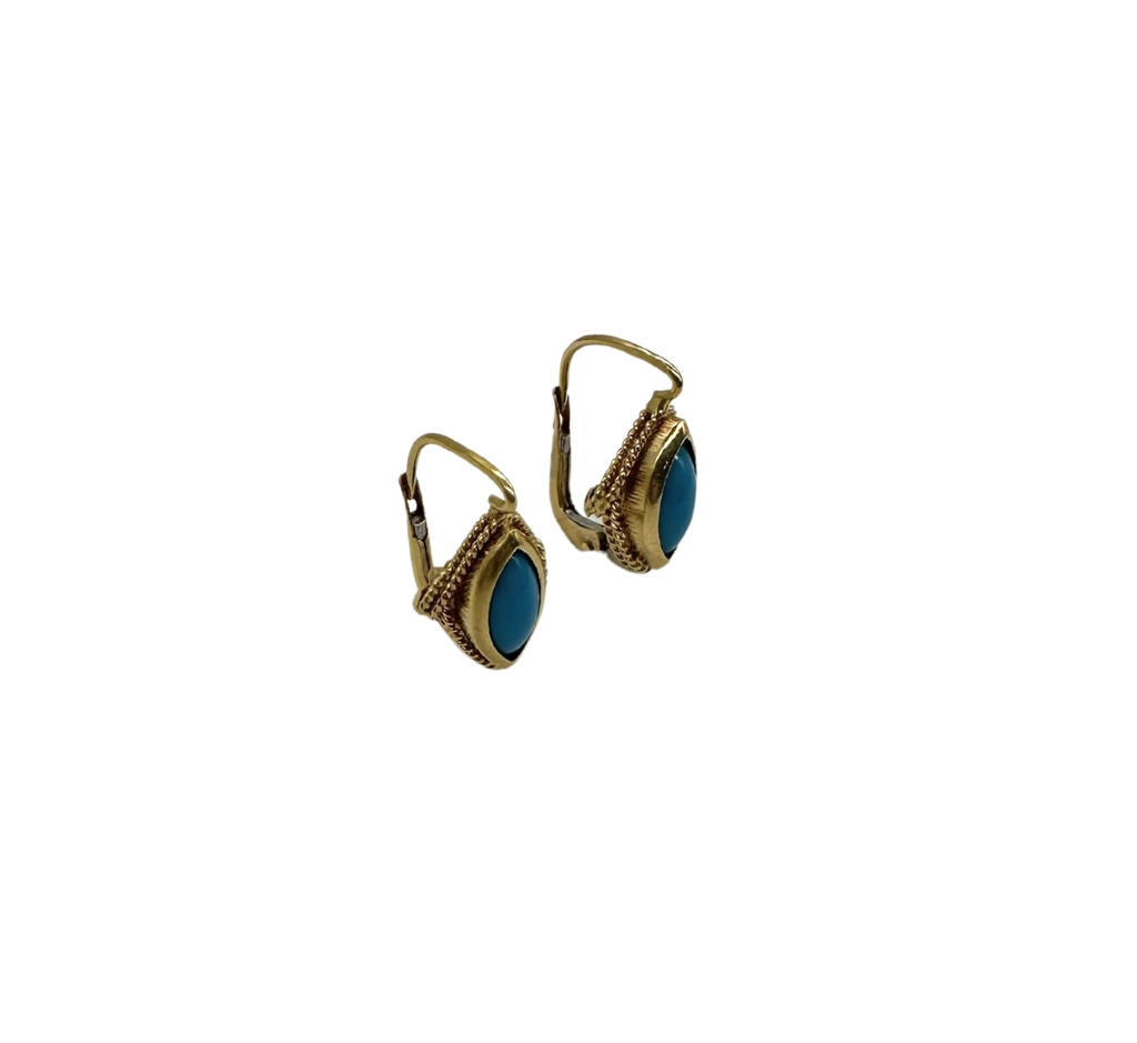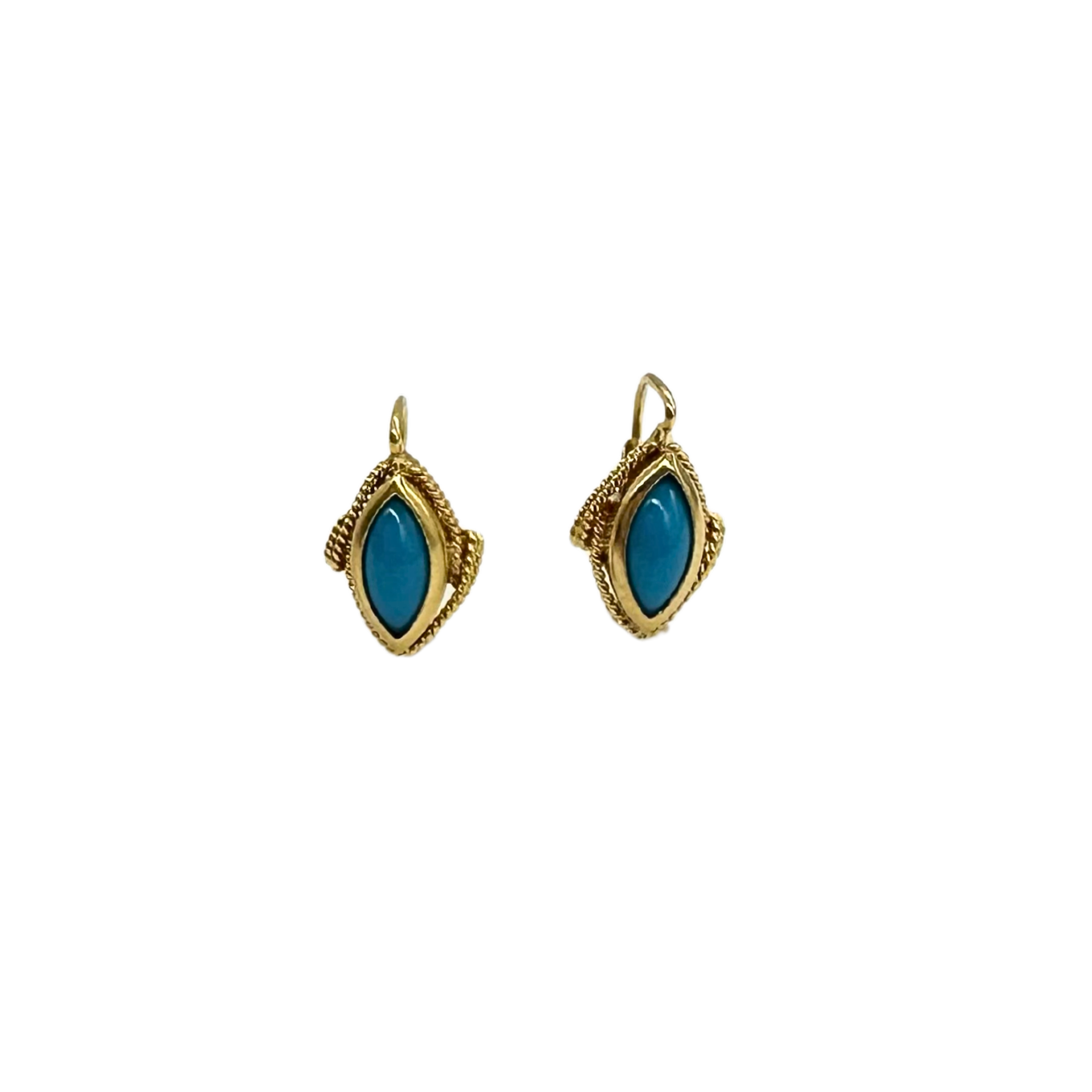Elegant 18k yellow gold earrings featuring beautiful marquise-shaped turquoise stones. Designed with lever-back closures for a secure and comfortable fit, these earrings combine timeless style with a bold pop of color.