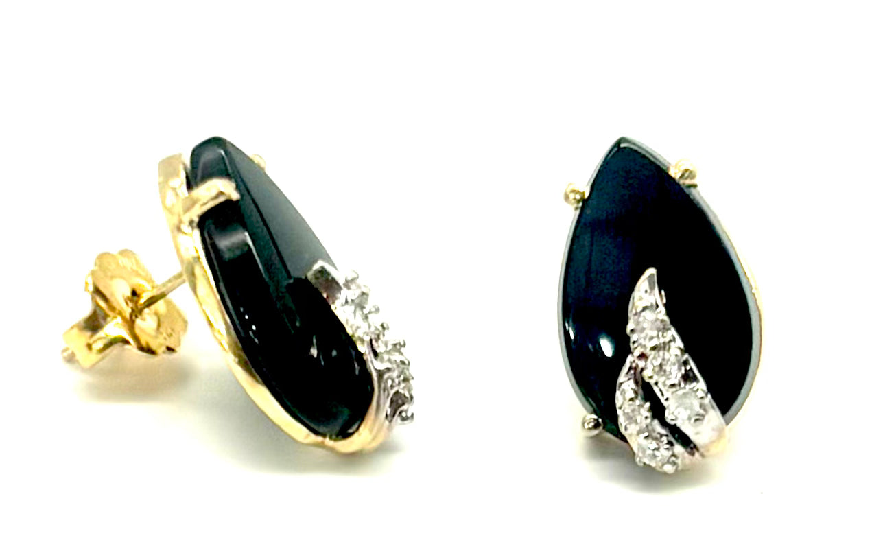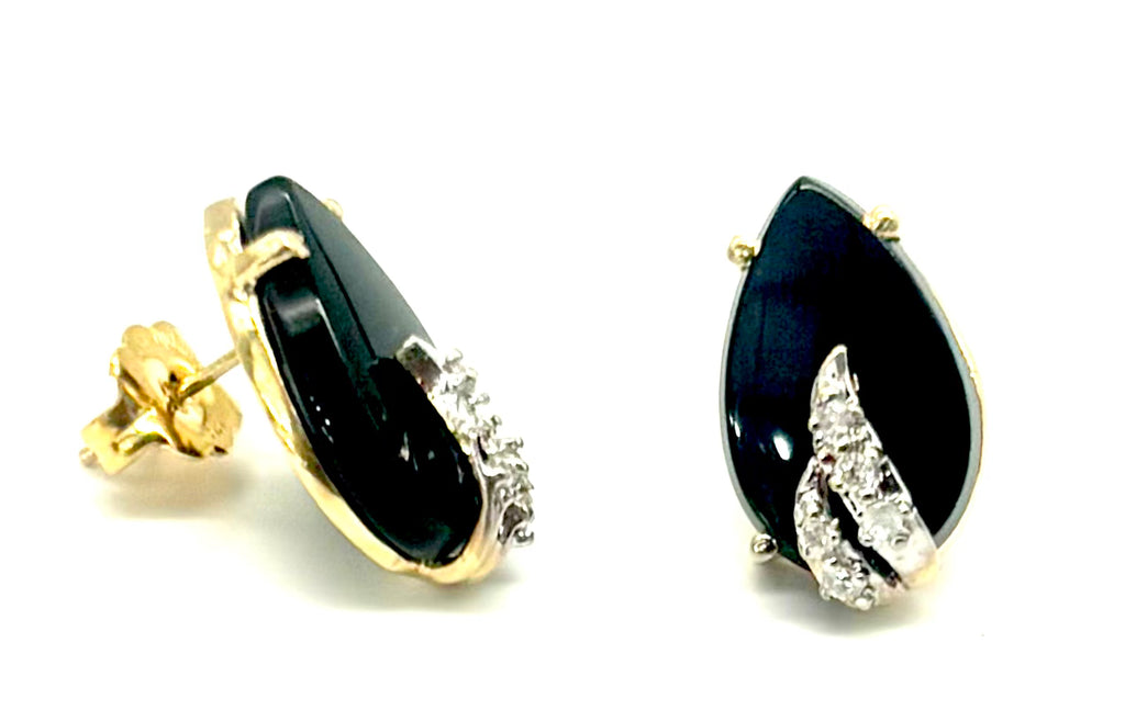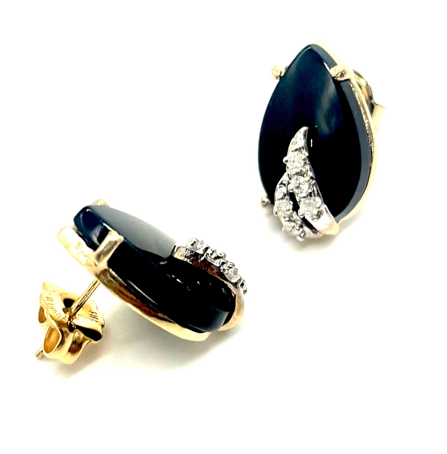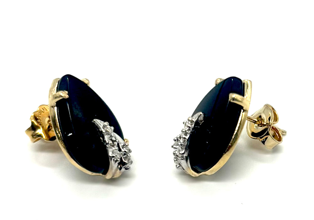 Pear-Shaped Onyx and Diamond Stud Earrings| 14K Yellow Gold