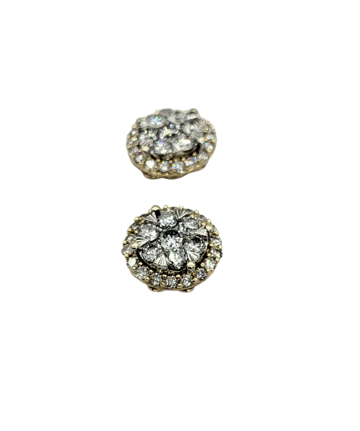 These 1 carat total weight diamond halo cluster stud earrings feature all natural diamonds.  The combination of white gold on the top enhances the brilliance of the diamonds, while the yellow gold back and posts provide durable support. This design ensures a sophisticated and elegant appearance suitable for various occasions.