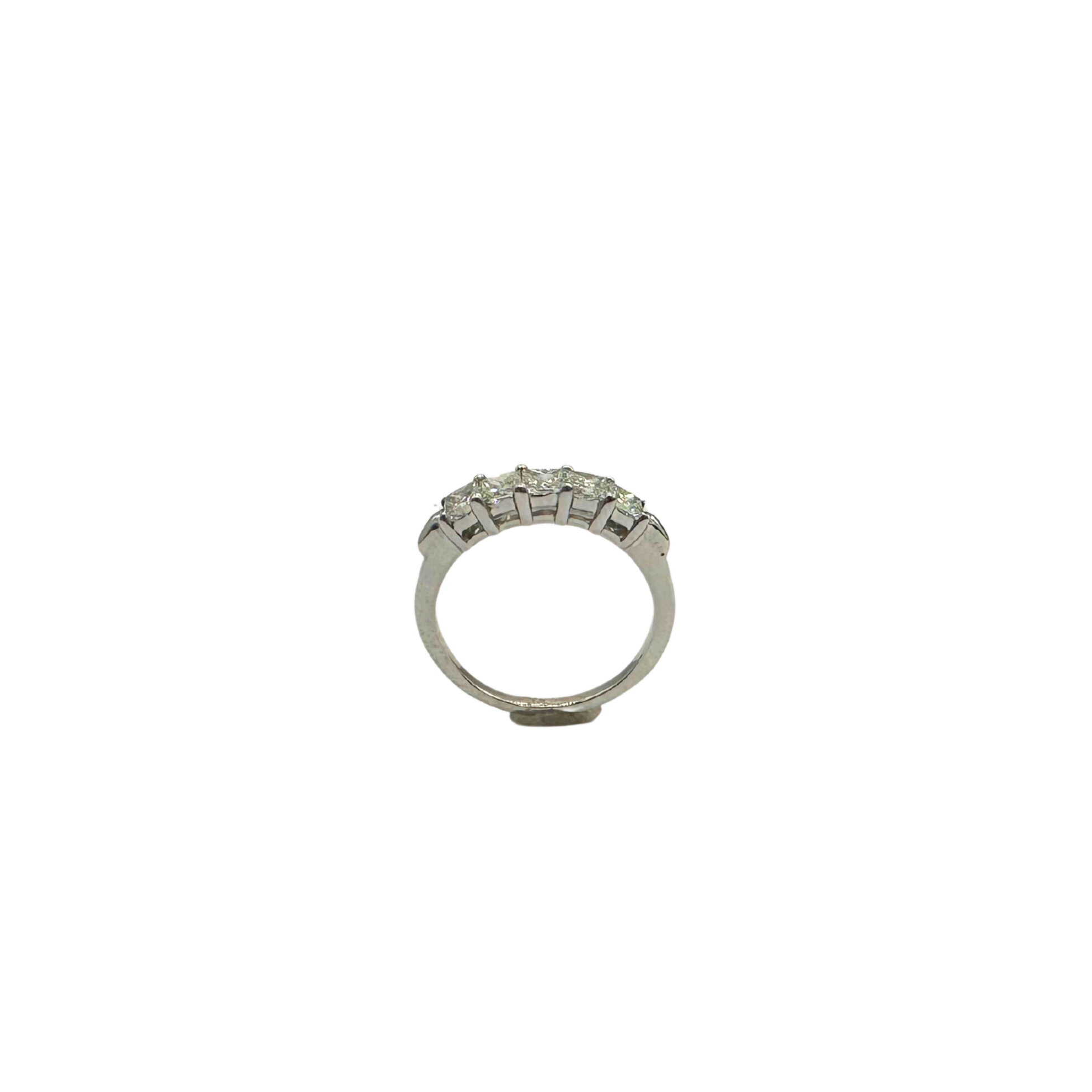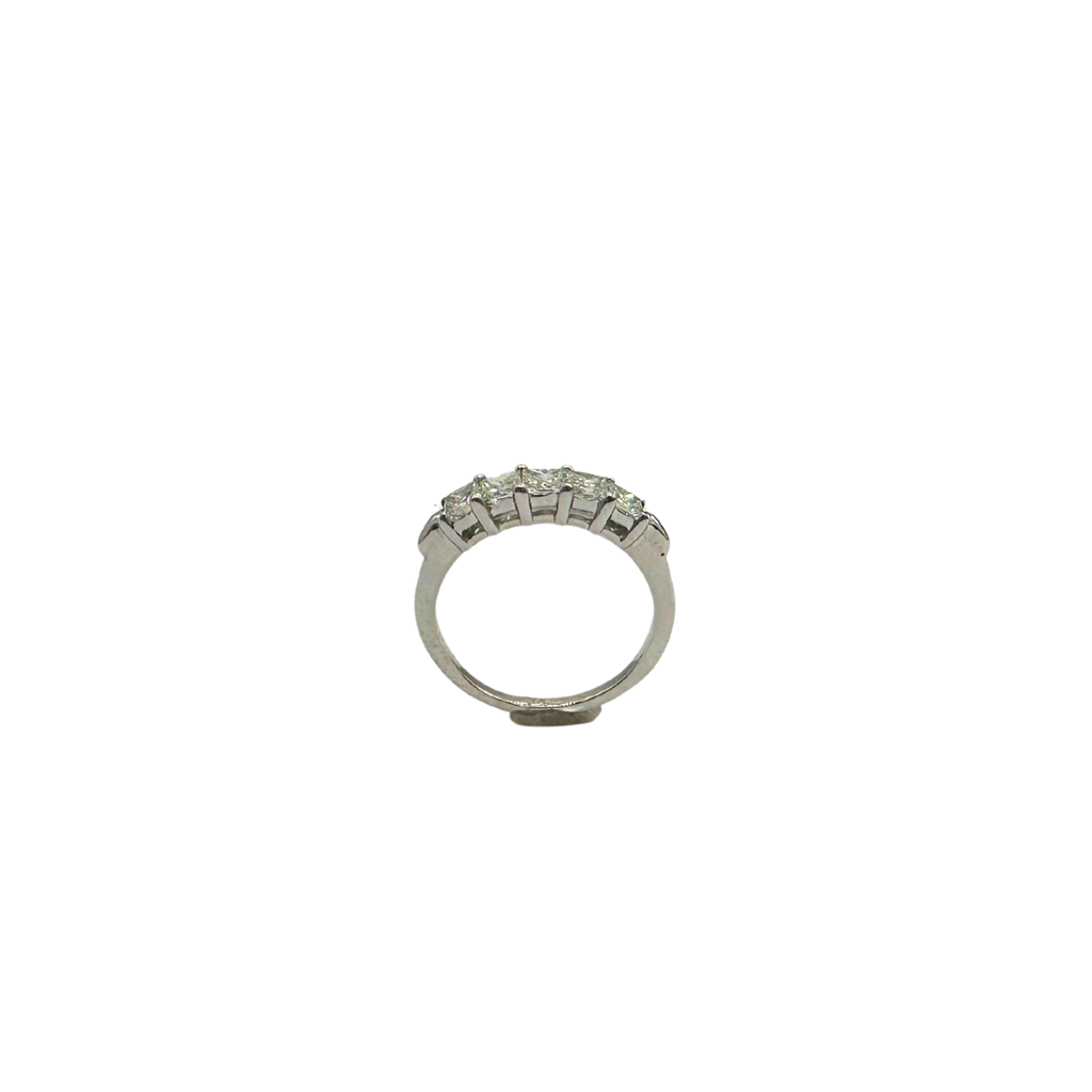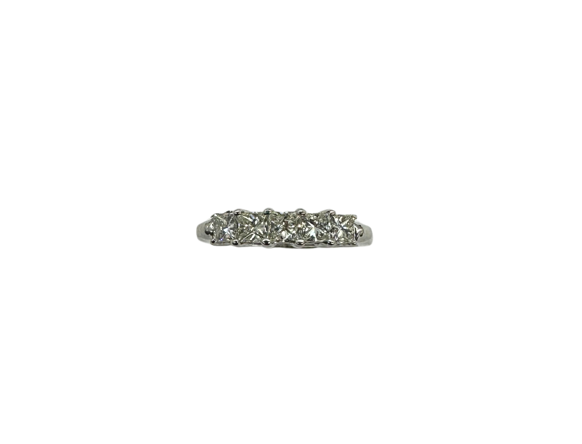 This stunning two-tone 14k white and yellow gold band showcases 1.25 carats total weight of sparkling princess-cut diamonds, set in an elegant inline design. The square diamonds are expertly set to maximize brilliance, creating a seamless row of fire and sparkle across the finger. Weighing 2.8 grams, this ring combines durability with refined beauty, making it a versatile piece perfect for daily wear or special occasions.