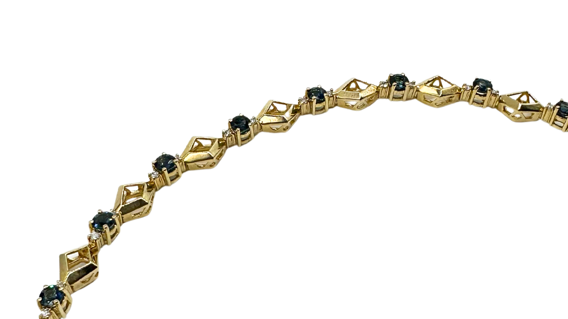 Crafted in radiant 14k yellow gold, this bracelet features a distinctive cutout link design that alternates with deep blue sapphires and shimmering diamonds. The unique geometric links add an artistic flair, while the 1 carat total weight of diamonds provides an elegant sparkle.
