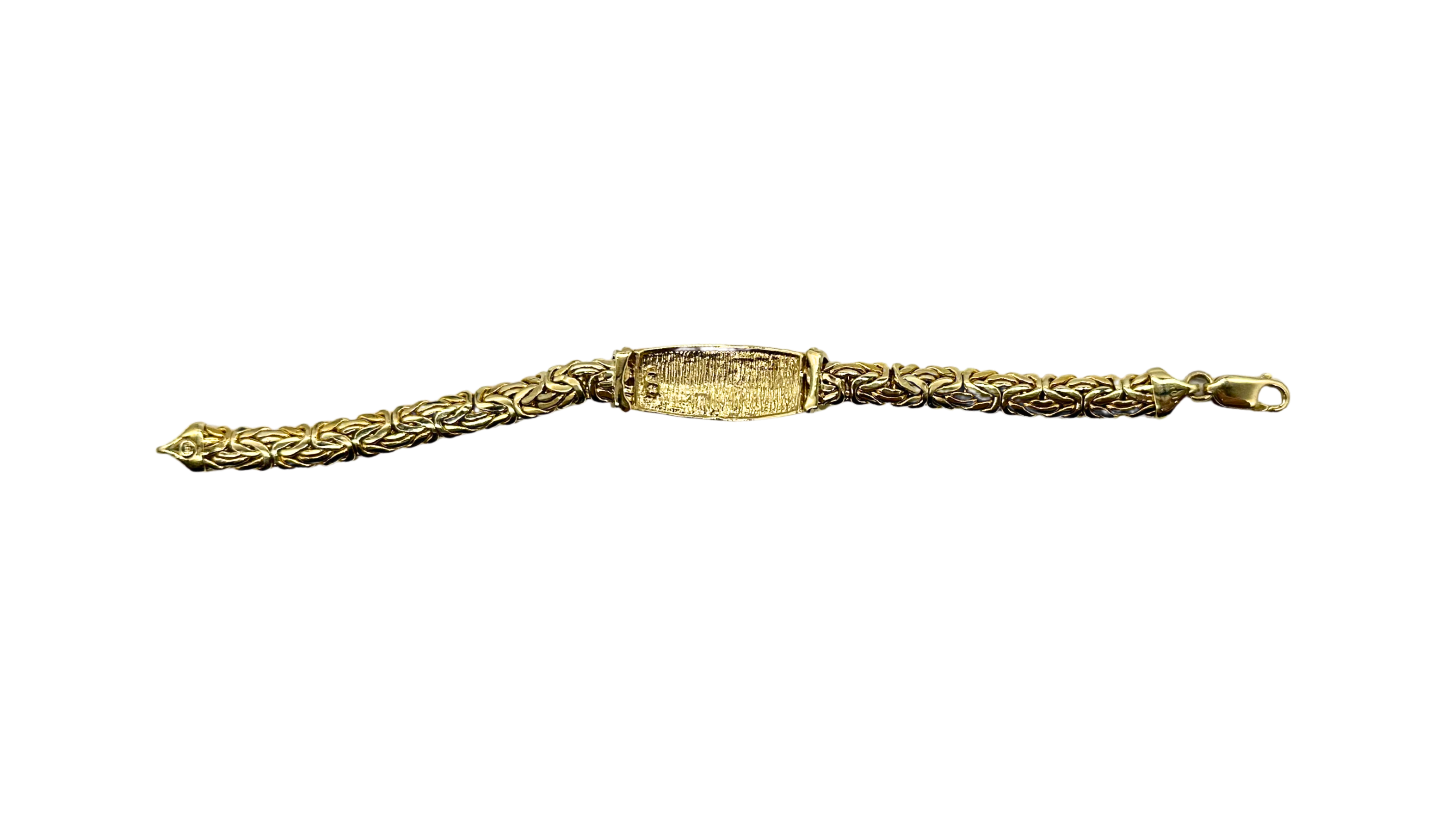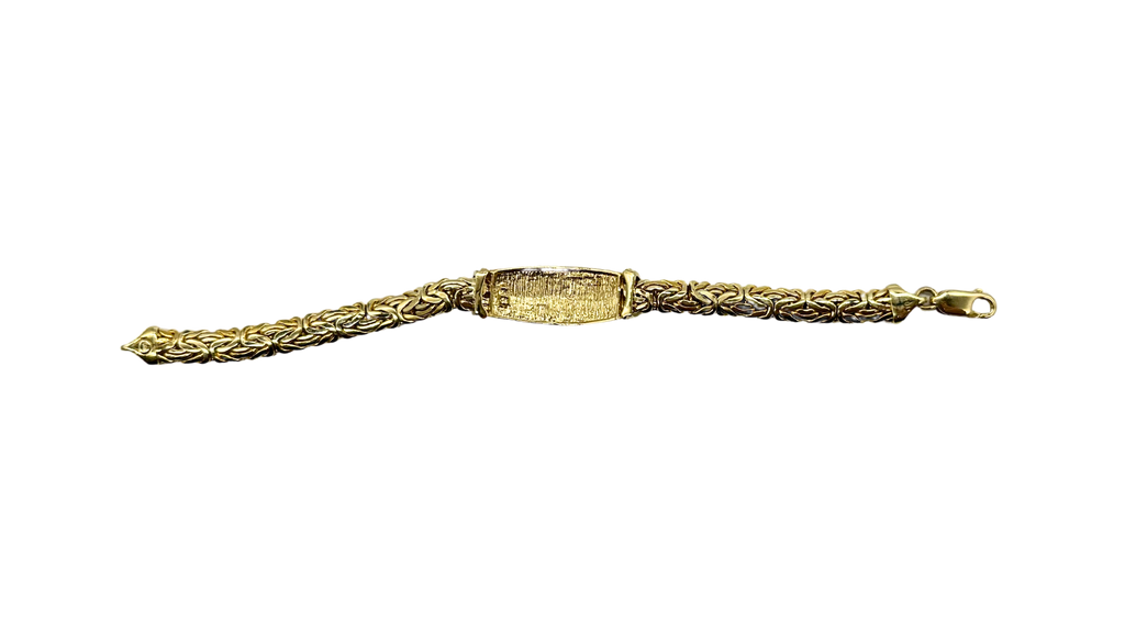 Add a touch of color and character to your jewelry collection with this stunning 14k yellow gold bracelet, crafted in a bold Byzantine link design. At the heart of this piece lies a vibrant mosaic of inlaid blue opal, showcasing a rich play of blues and greens that shimmer with every move. The intricate weave of the gold links gives the bracelet depth and texture, while the opal centerpiece adds a striking focal point with a natural, almost oceanic vibe.