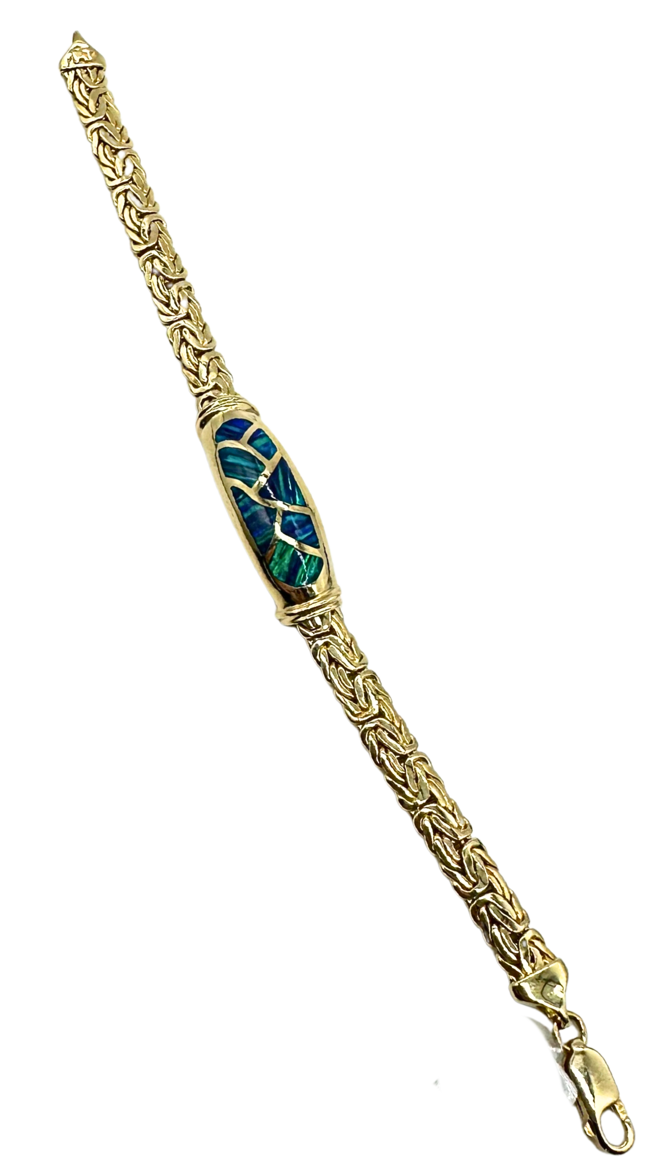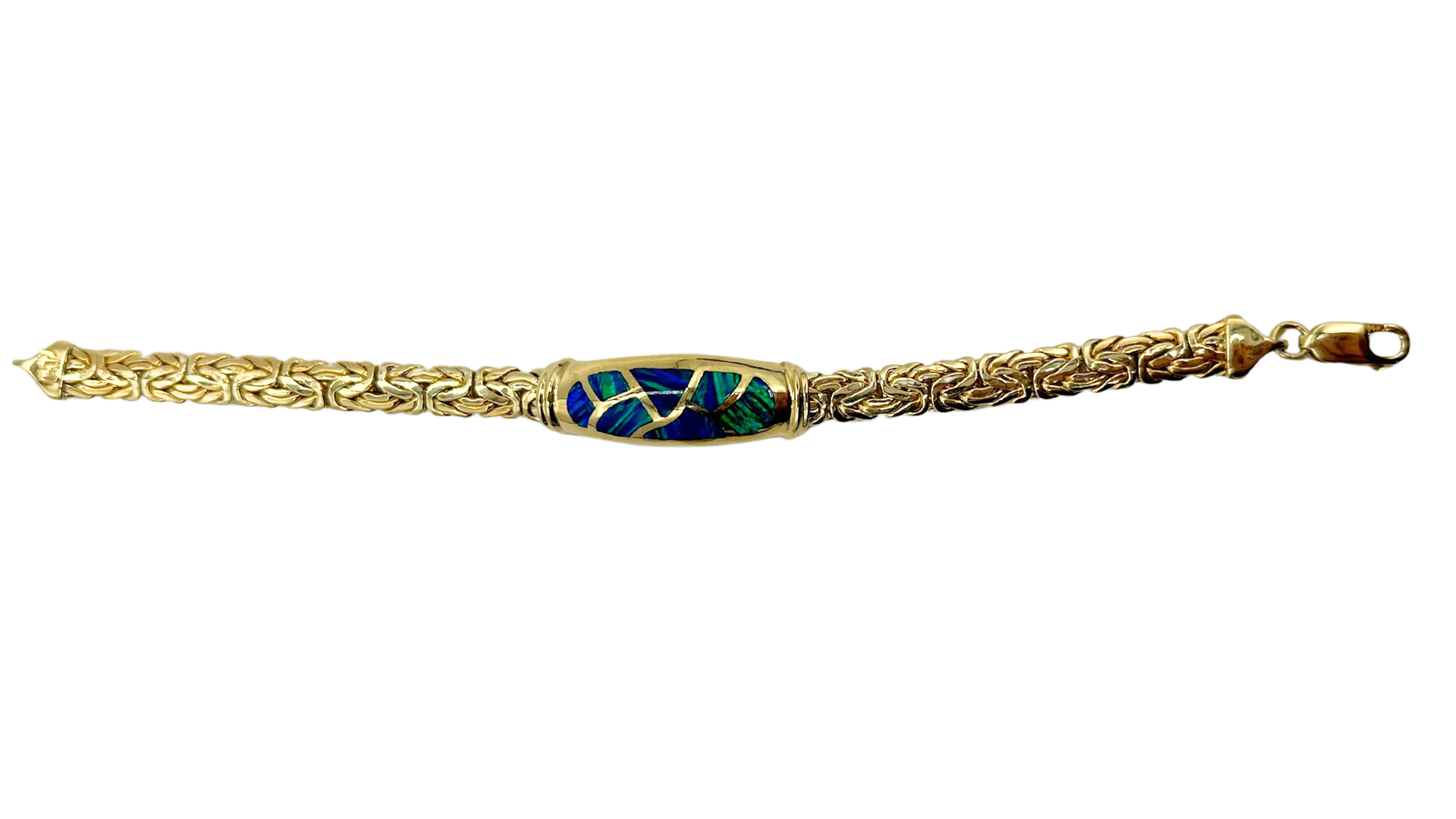 14k Yellow Gold Blue Opal Inlay Byzantine Bracelet