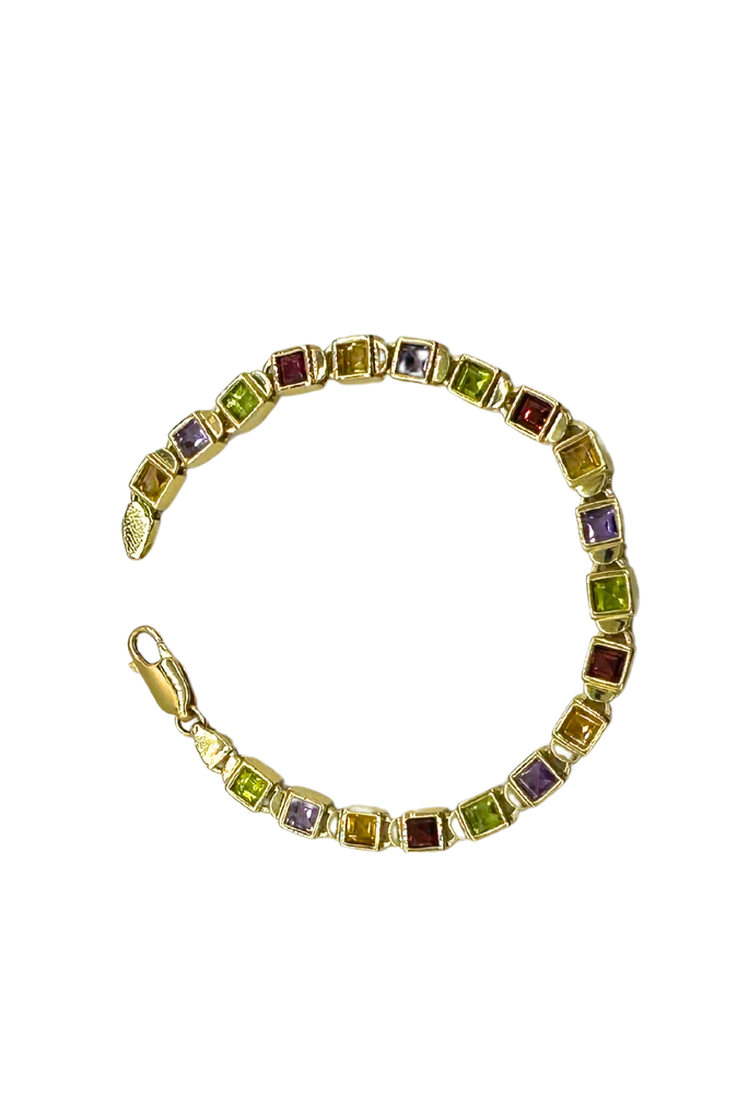 Add a pop of vibrant color to your jewelry collection with this stunning 14k yellow gold bracelet, featuring a dazzling array of square-cut multi-colored gemstones. Each bezel-set stone is securely nestled in warm yellow gold links, creating a smooth, luxurious finish and a fun yet elegant look.