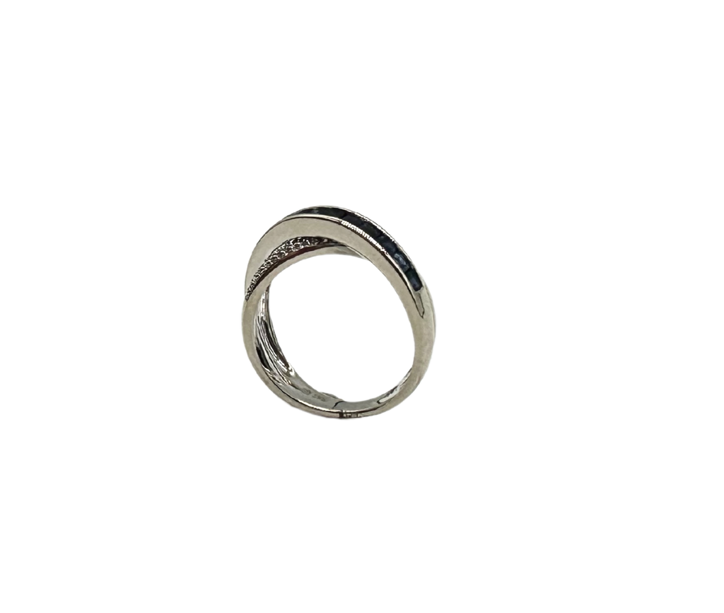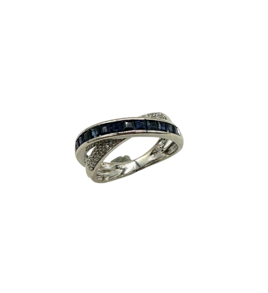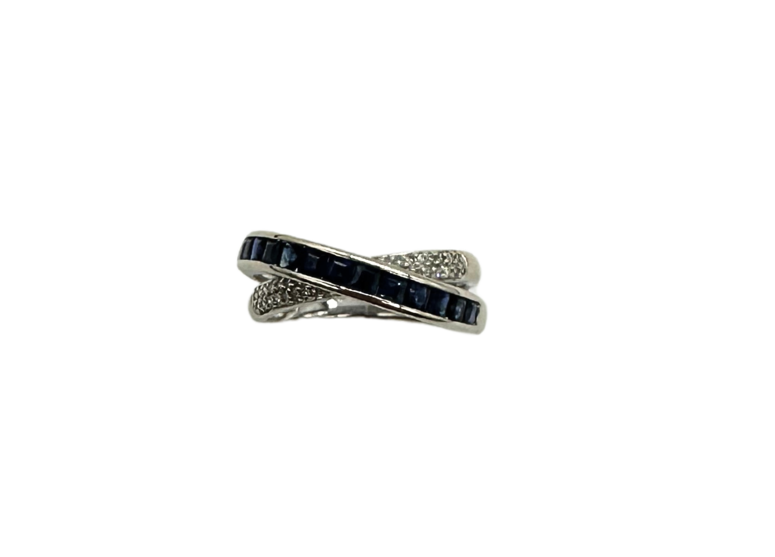 This gorgeous 14k white gold crossover ring blends elegance and modern charm. One band is channel-set with deep blue sapphires, while the other sparkles with diamond accents, creating a striking crisscross pattern.