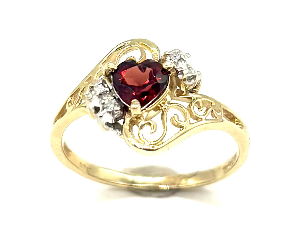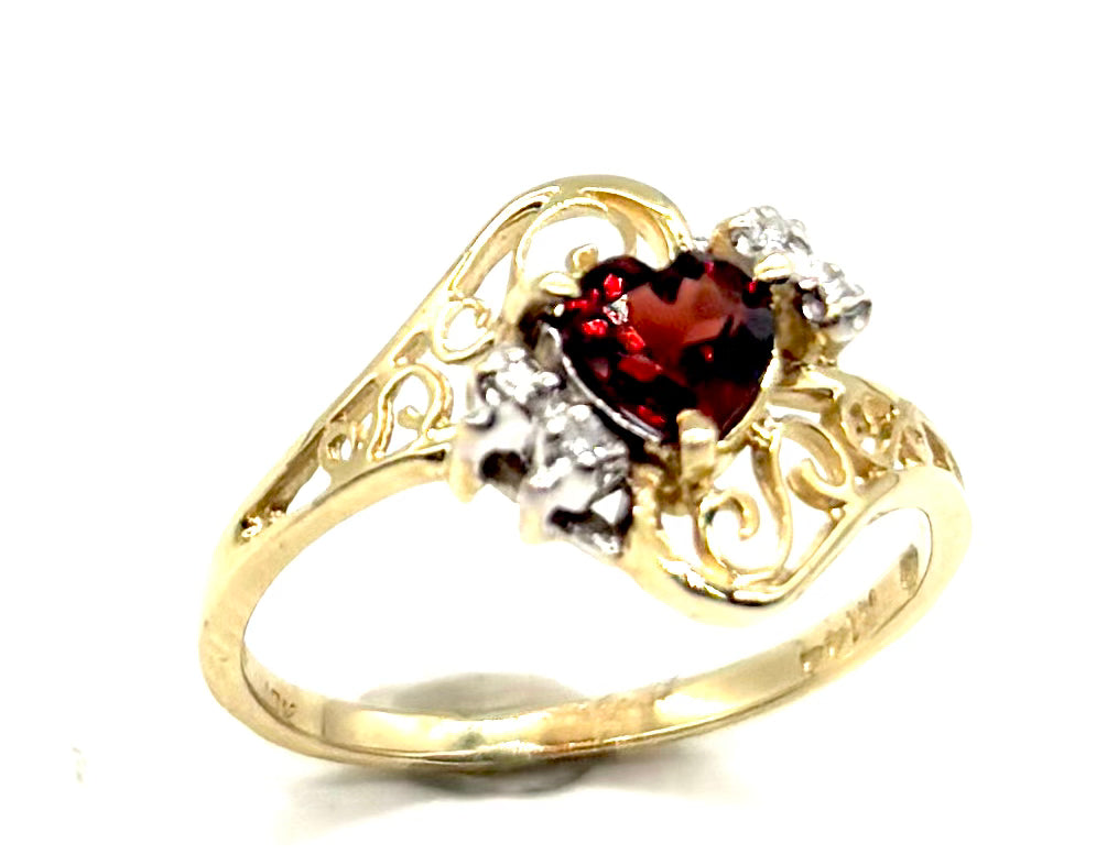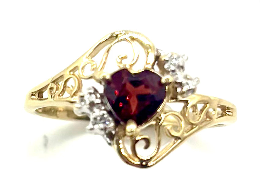 Add a touch of romantic elegance to your collection with this stunning pre-owned bypass ring. Crafted in 14k yellow and white gold, this piece features a vibrant heart-shaped garnet as its center stone—rich, warm, and full of charm. Sparkling natural diamond accents flank the garnet, enhancing its deep red glow.