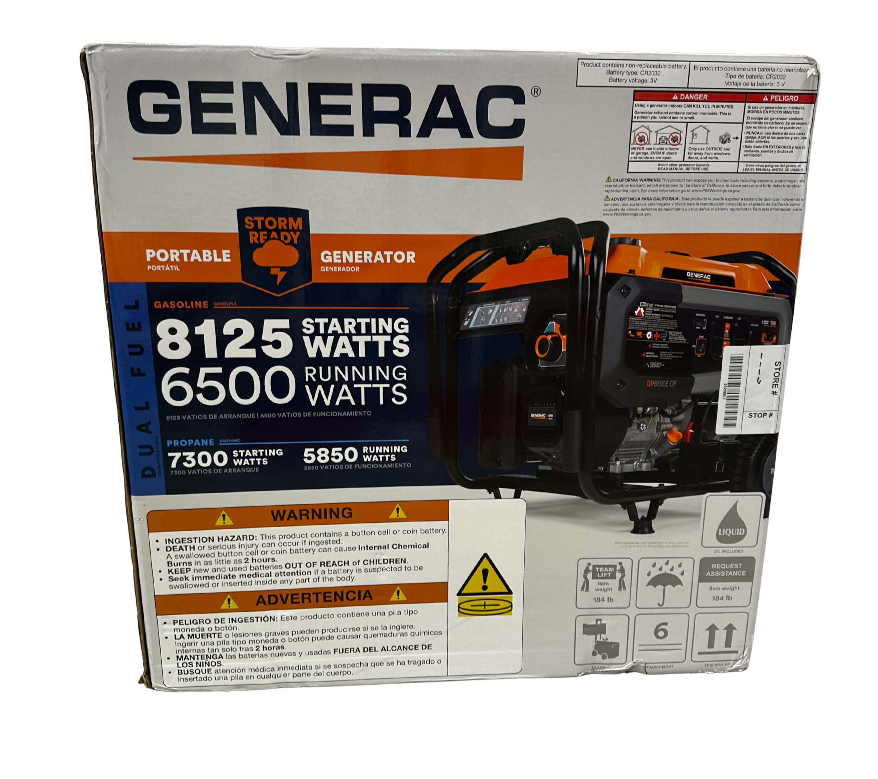 Generac GP6500EDF Dual Fuel Portable Generator – 8125 Starting Watts, 6500 Running Watts (Gasoline) (Local Pickup)