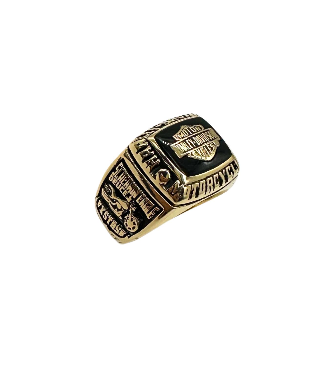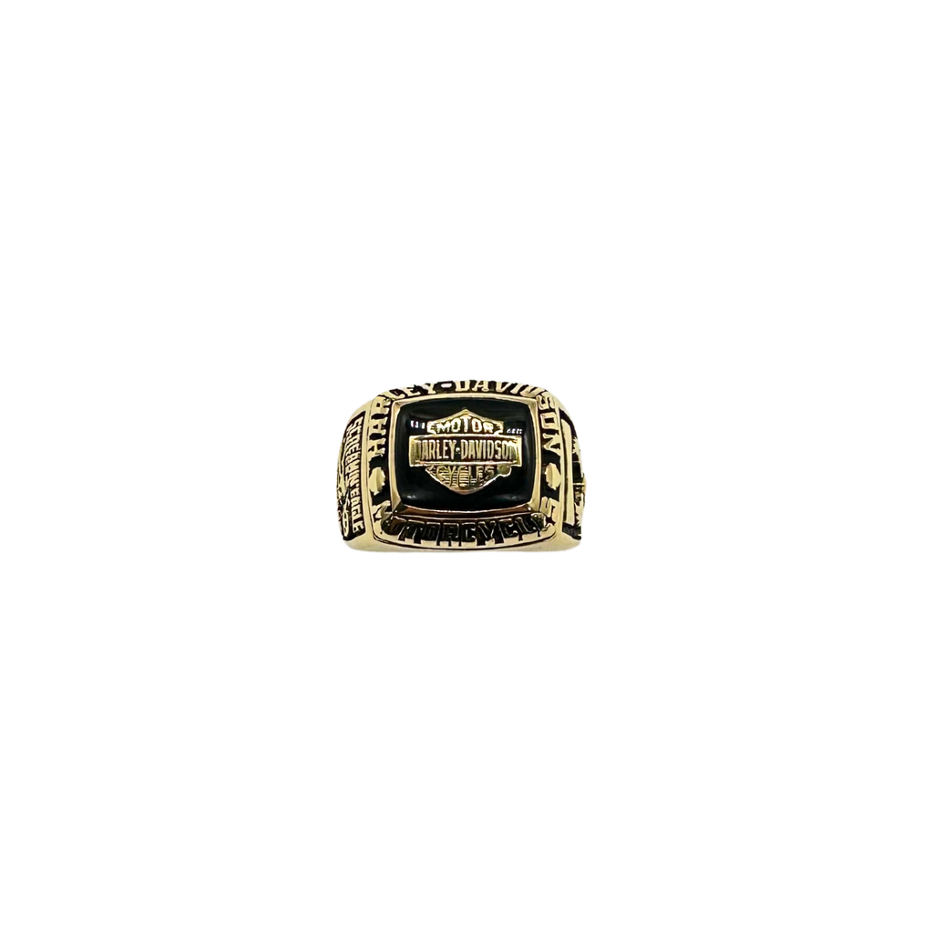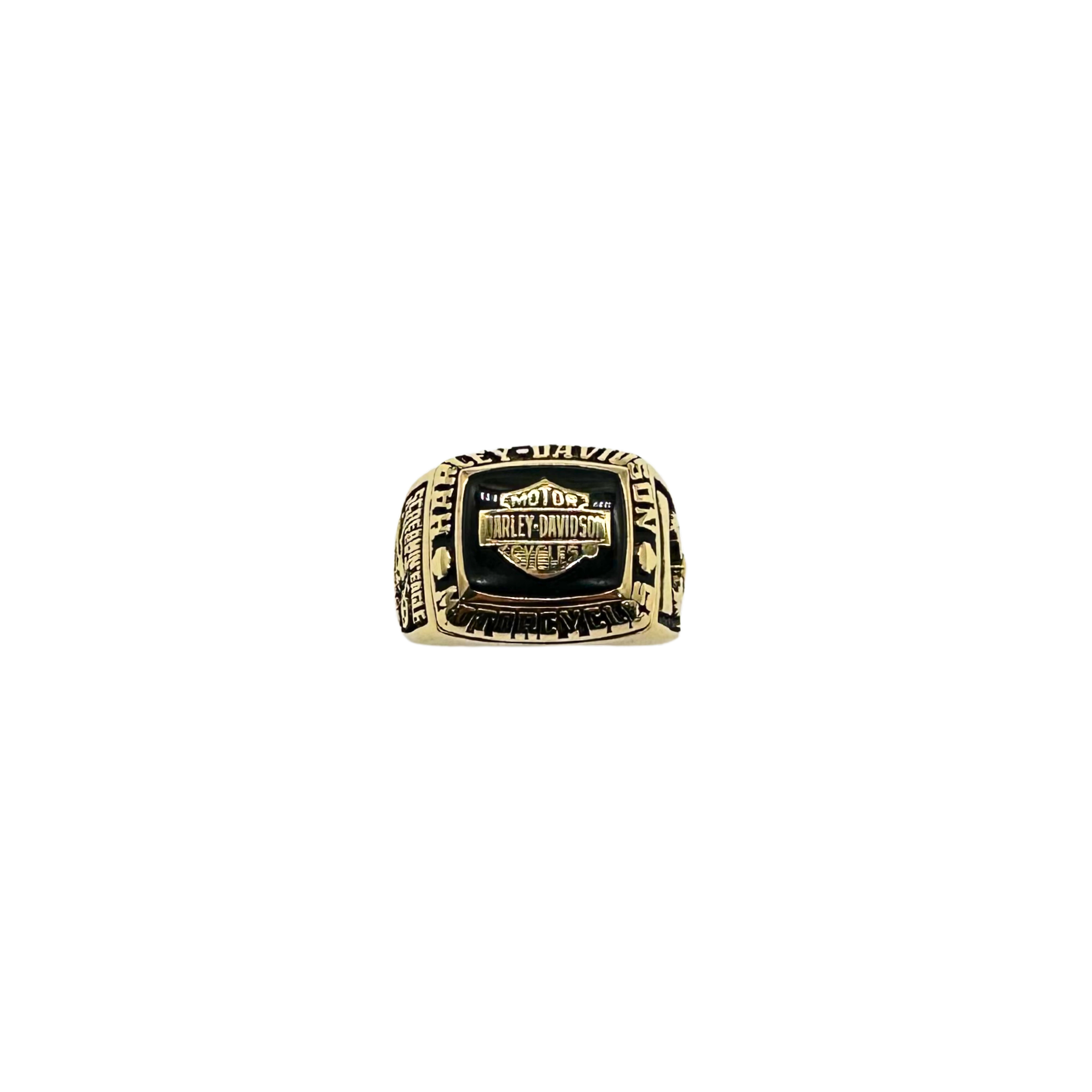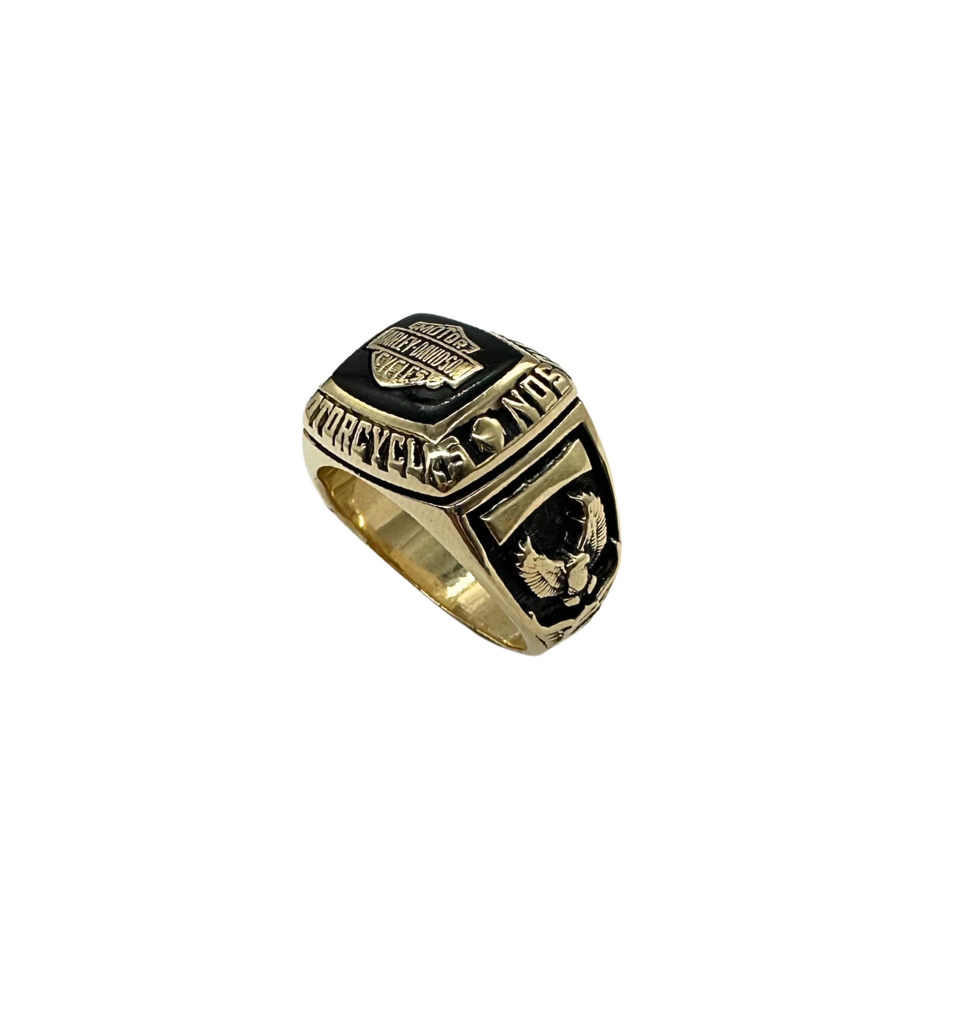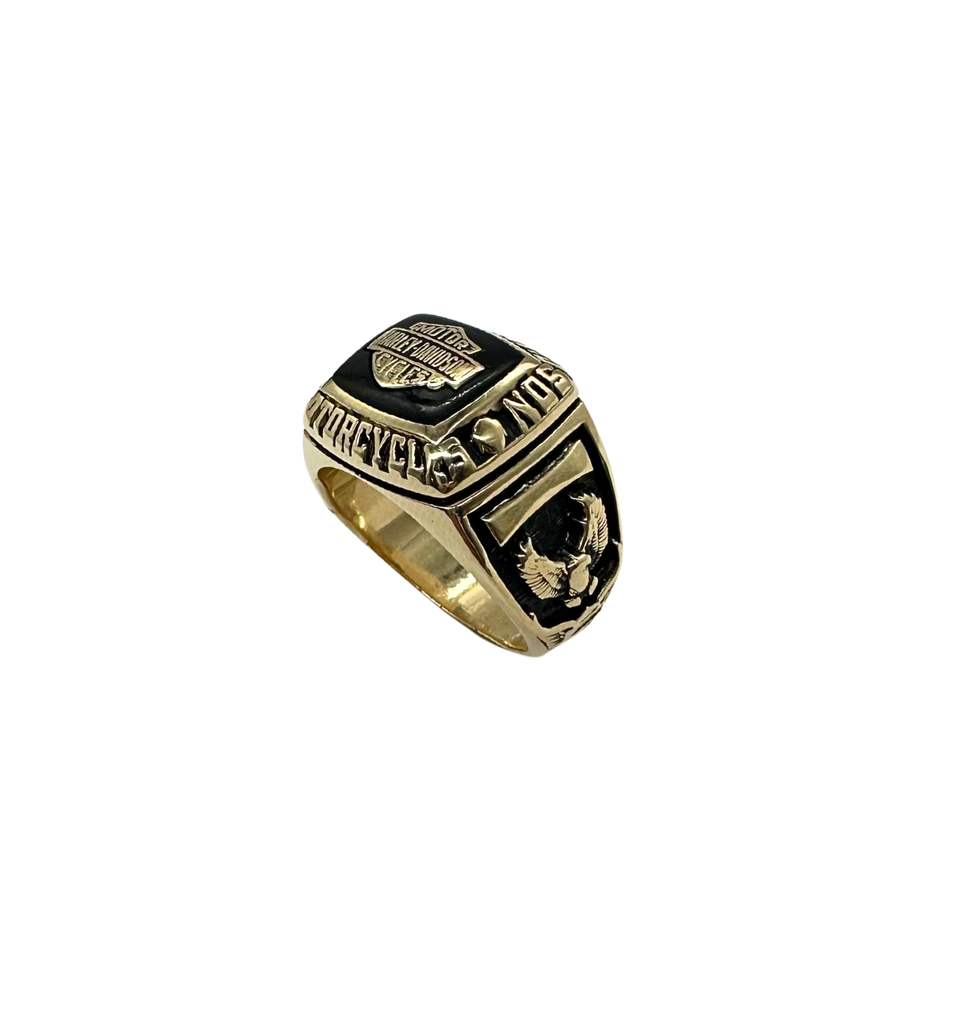 This bold 10K yellow gold Harley-Davidson ring showcases a black onyx centerpiece with the iconic Harley-Davidson Motor Cycles logo in raised gold detail. The band features intricate engravings along the sides, including classic Harley emblems and a proud eagle design, representing strength and freedom. With substantial weight and craftsmanship, this piece captures the spirit of the open road.