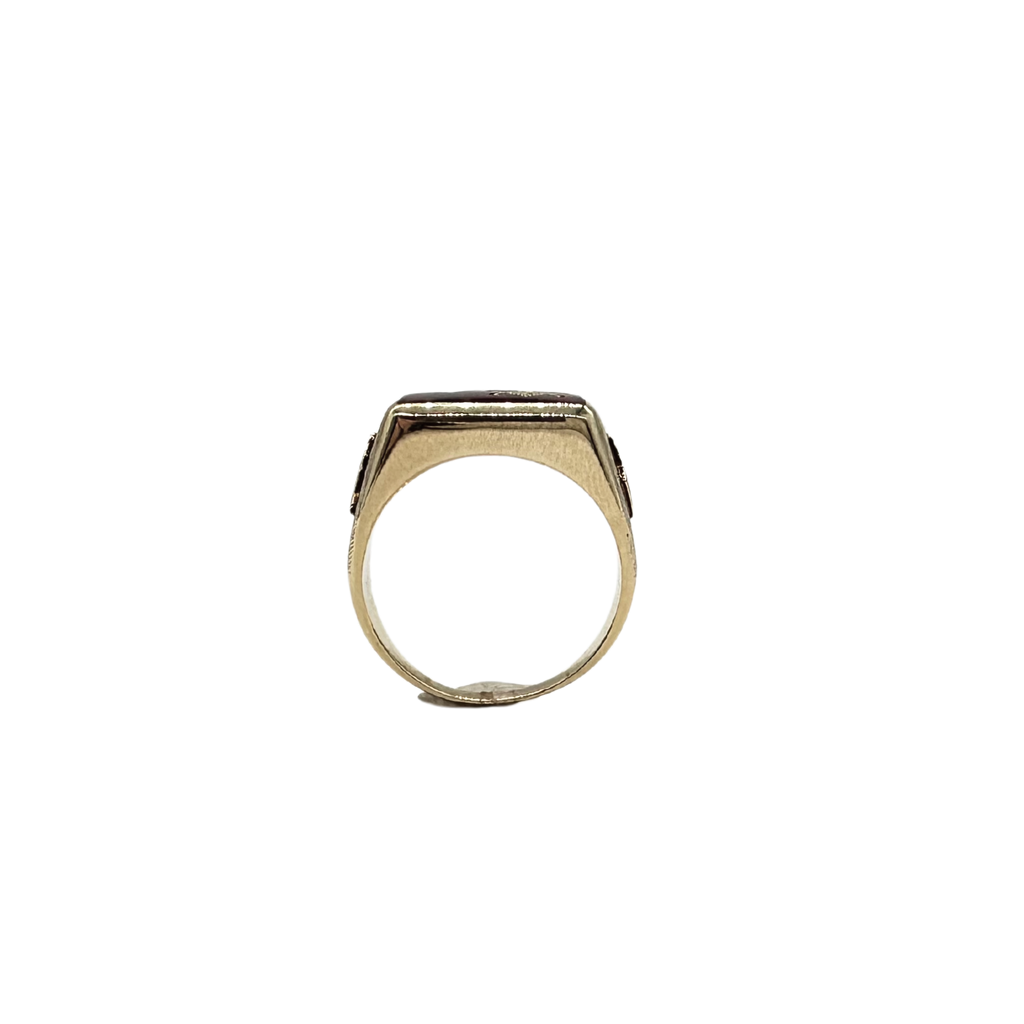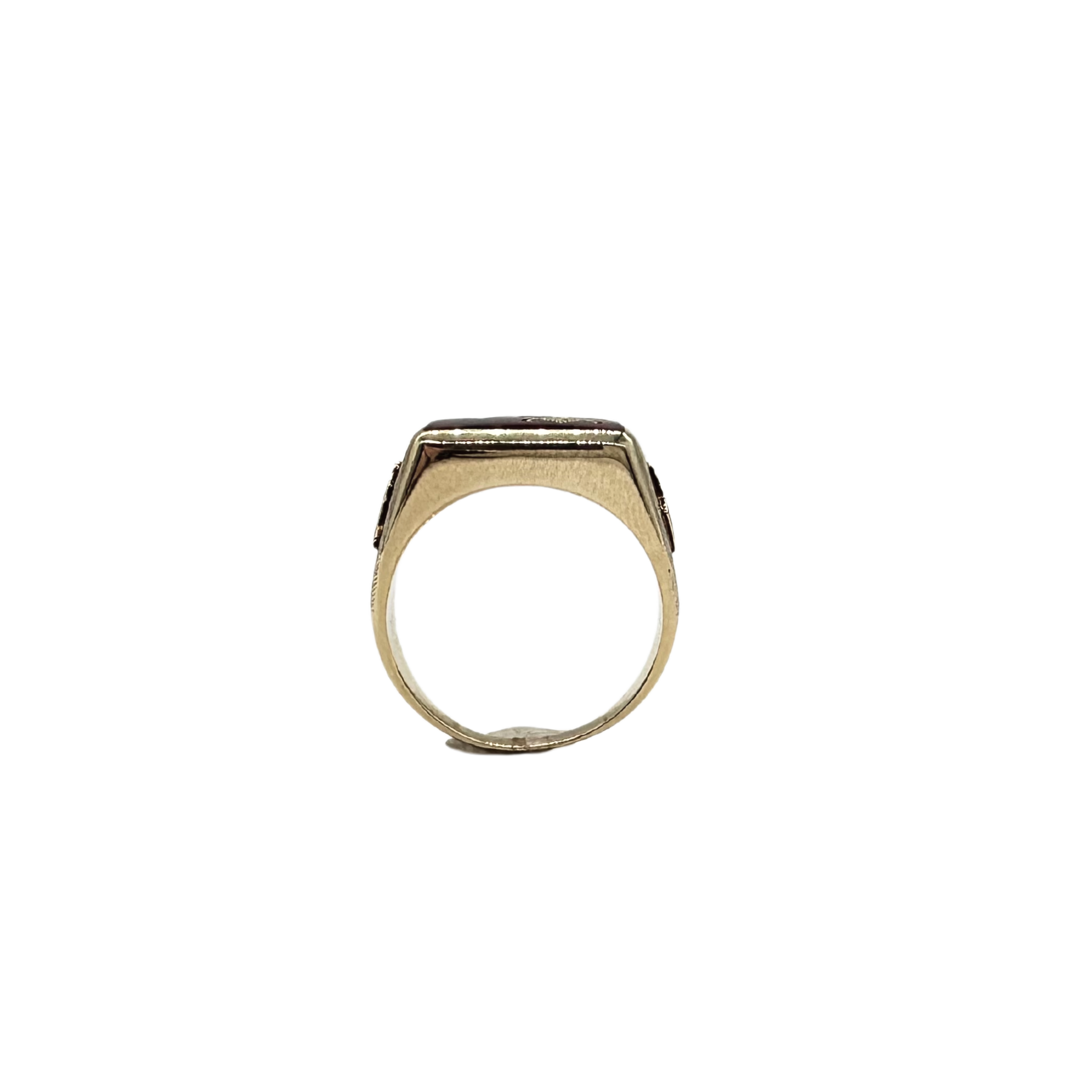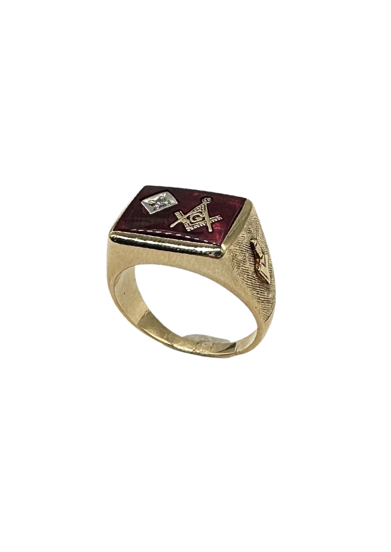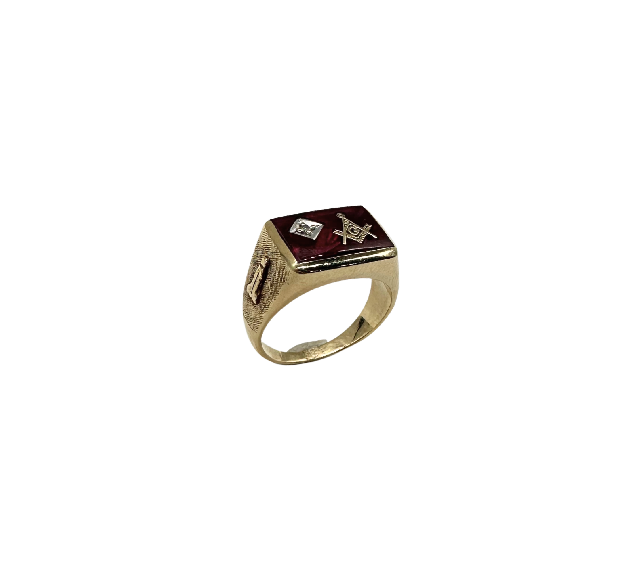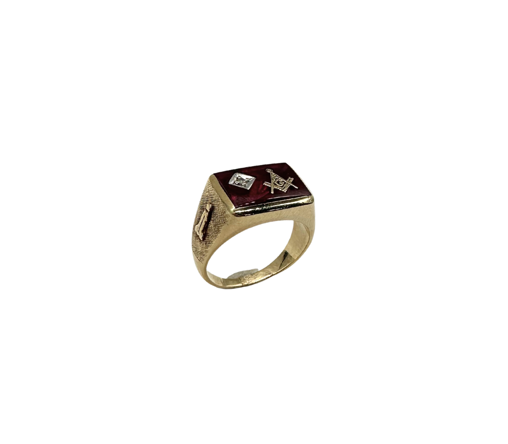 This distinguished 10K yellow gold Masonic ring features a rectangular red enamel top inlaid with symbolic Masonic emblems — including a diamond-accented square and compass. The polished frame and textured sides enhance its vintage character, while side engravings complete the design with classic fraternal detail. A meaningful and collectible piece for any Mason or jewelry enthusiast.