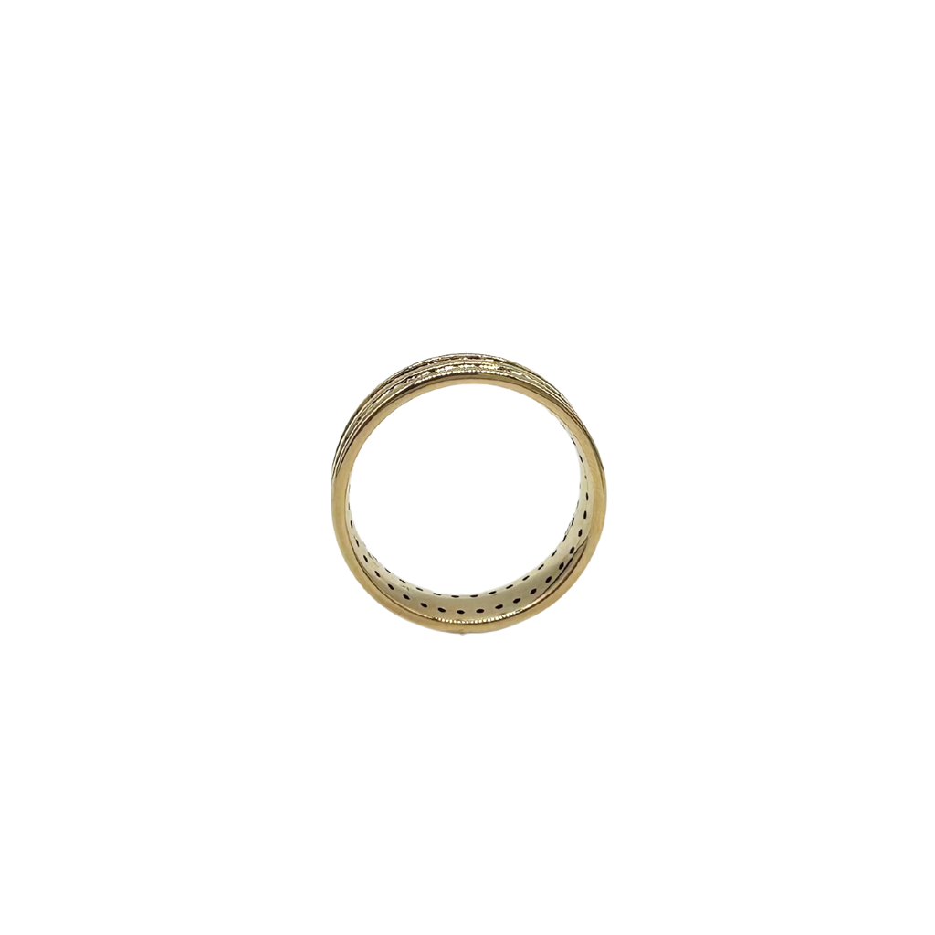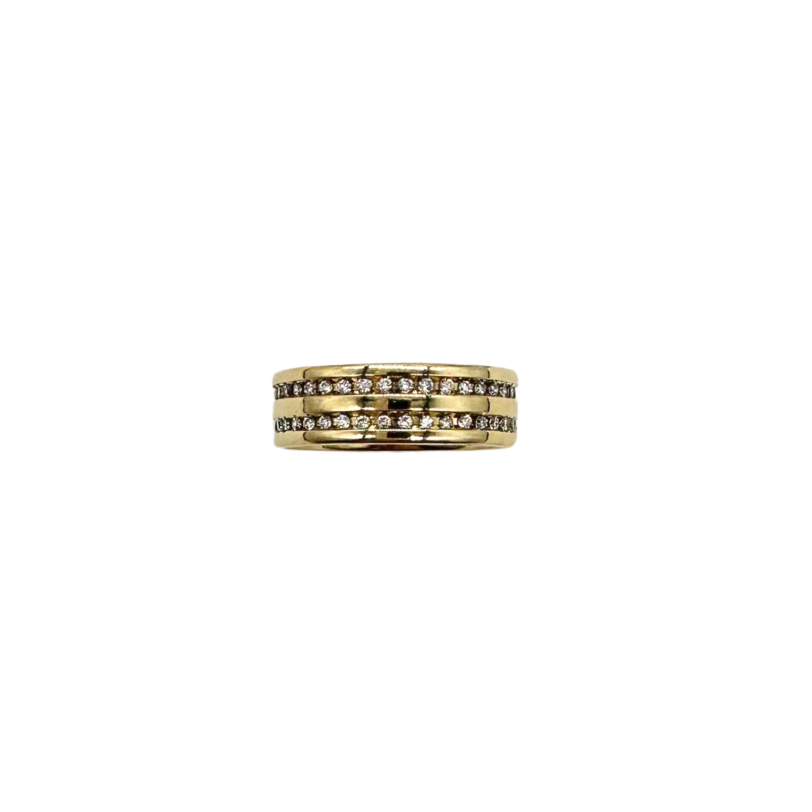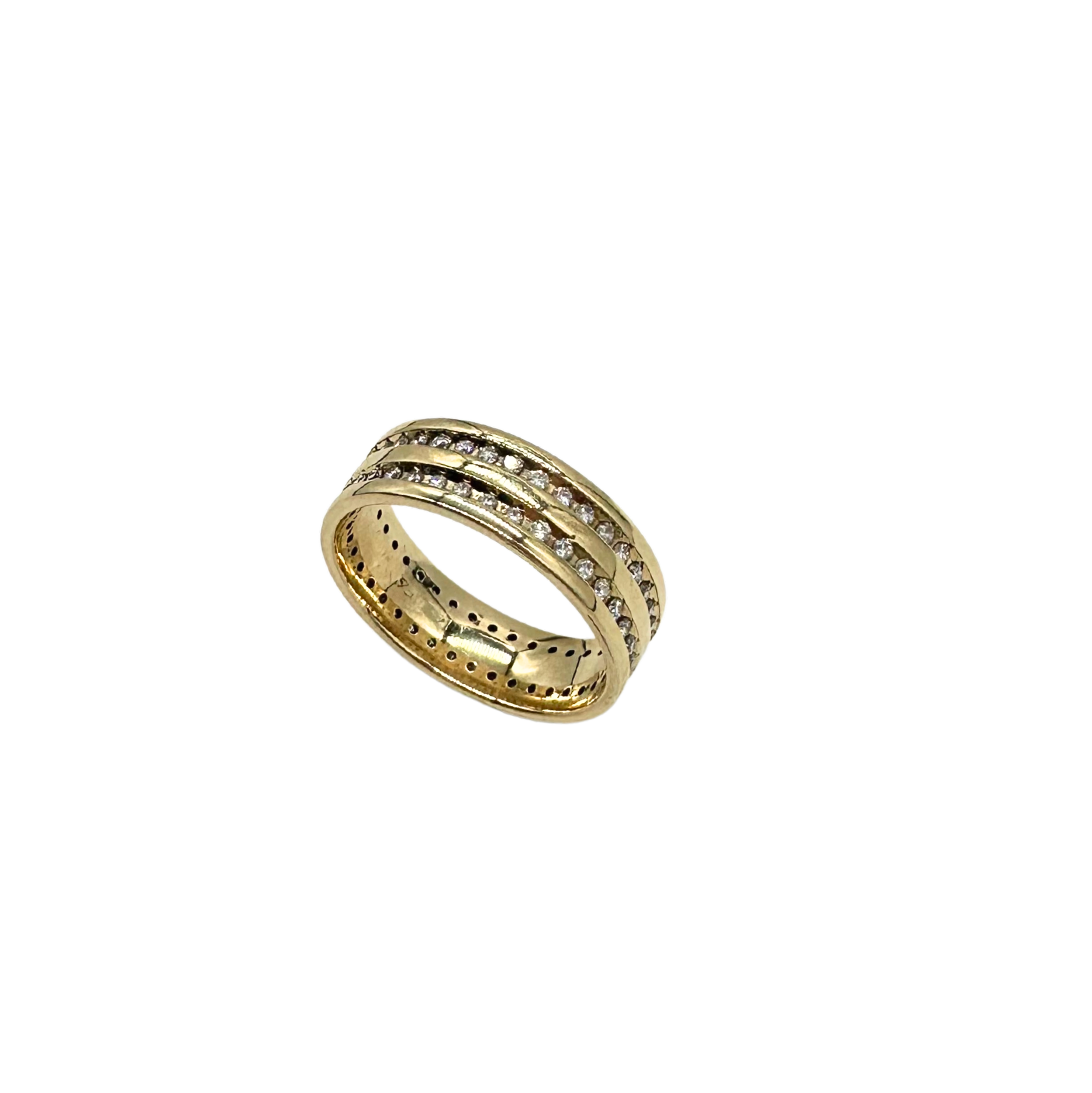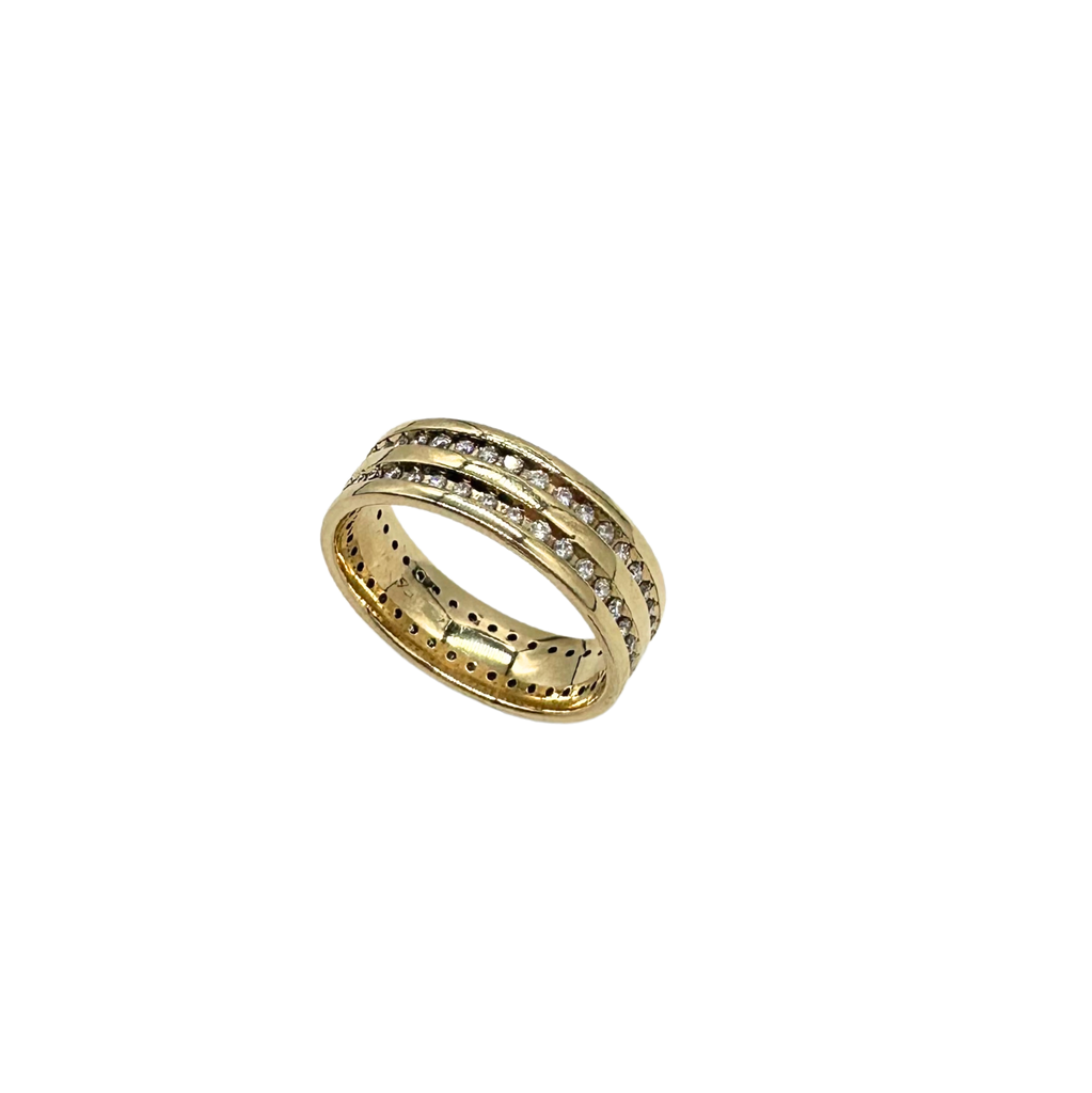 This stunning 14k yellow gold eternity band radiates timeless elegance with a bold, modern edge. Crafted in a wide design, the ring showcases two continuous rows of sparkling round diamonds, channel set for a seamless and sophisticated finish. Weighing 8.4 grams, this piece offers both luxury and substance.