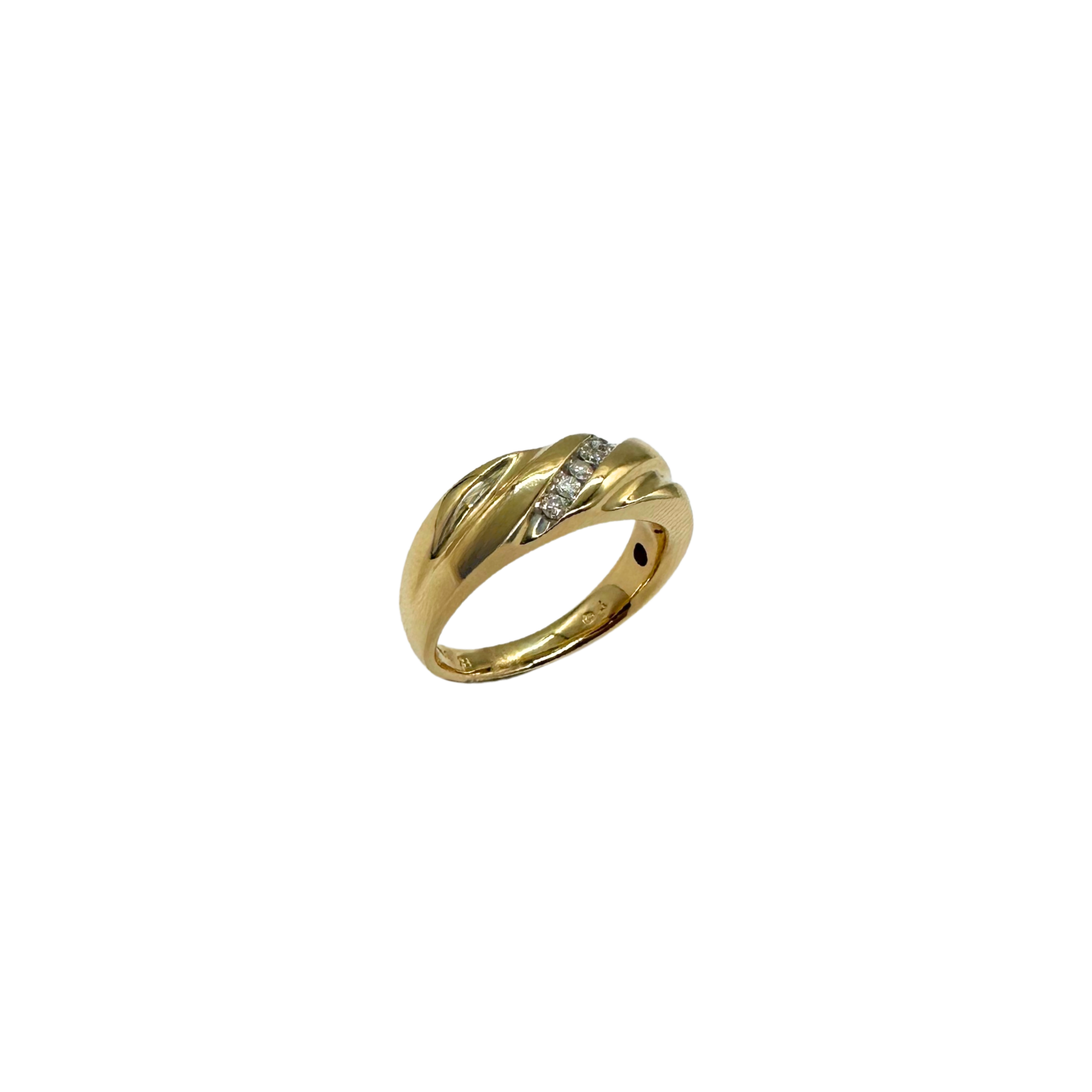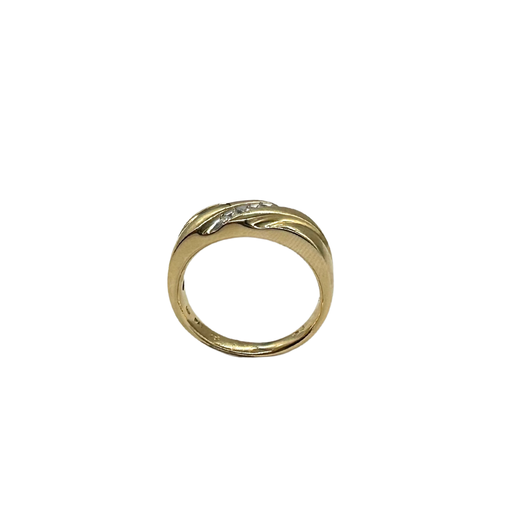 Crafted from solid 14K yellow gold, this bold ribbed band features a diagonal row of round brilliant-cut diamonds totaling approximately 0.15 carat. The grooved texture gives it a dimensional look, balancing shine with subtle depth. A great piece for anyone who appreciates refined design with a touch of character.