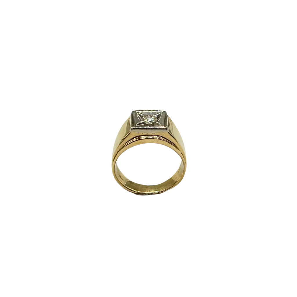 This striking 14K yellow and white gold ring features a bold framed design with a brilliant 1/4 carat diamond solitaire at its center. The diamond is showcased within a white gold starburst-style setting that amplifies its sparkle, while the wide yellow gold band offers a sleek, polished finish for timeless appeal.