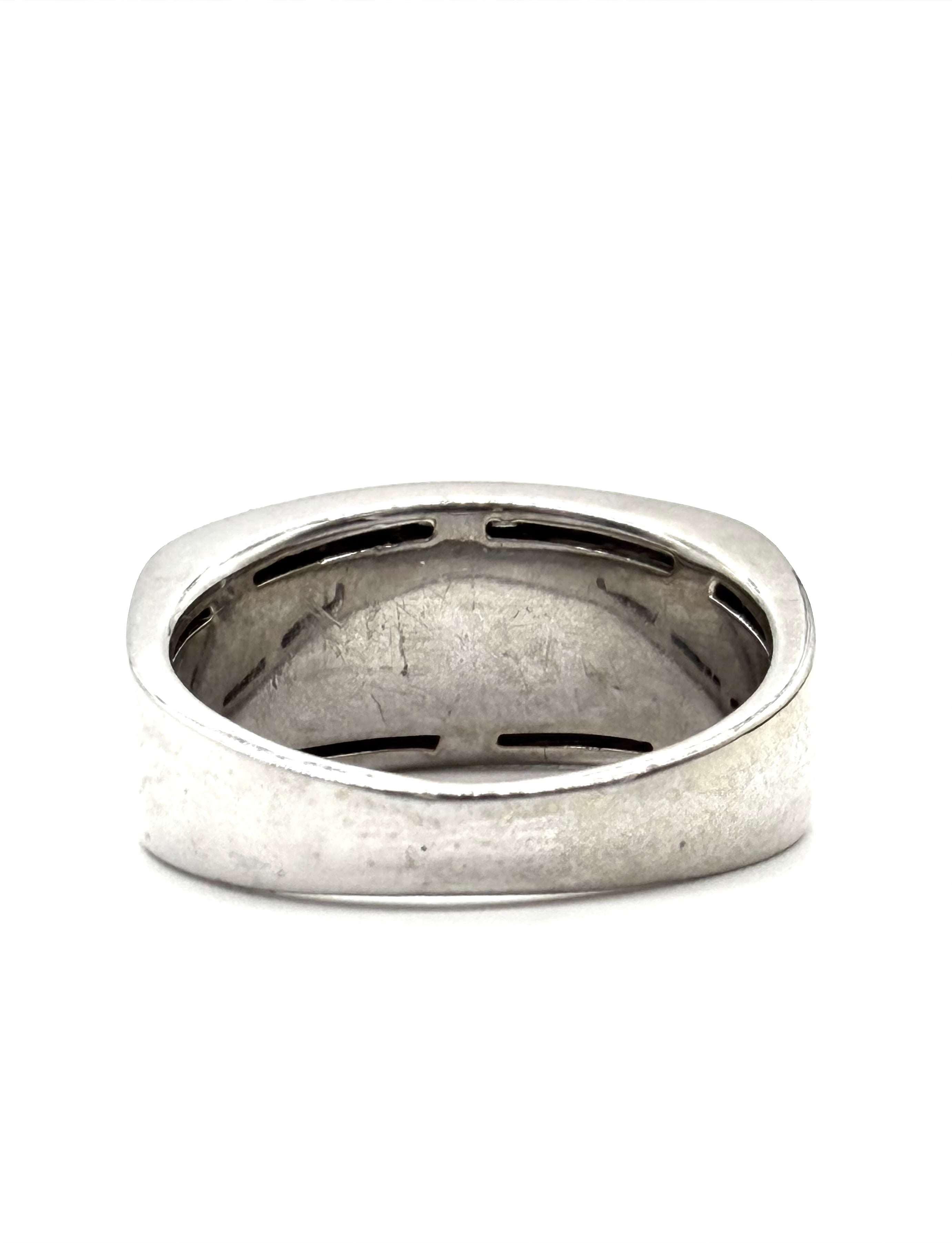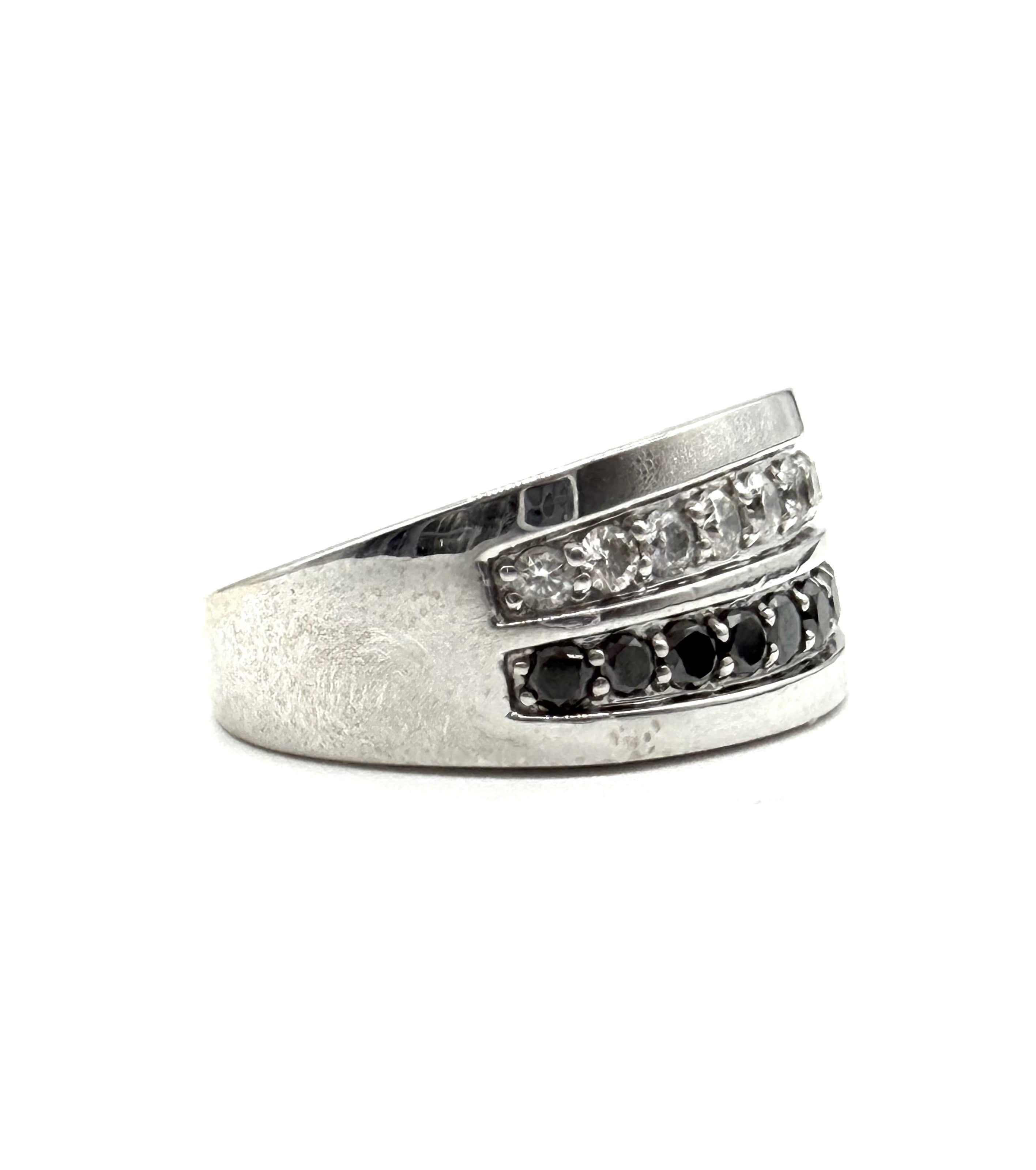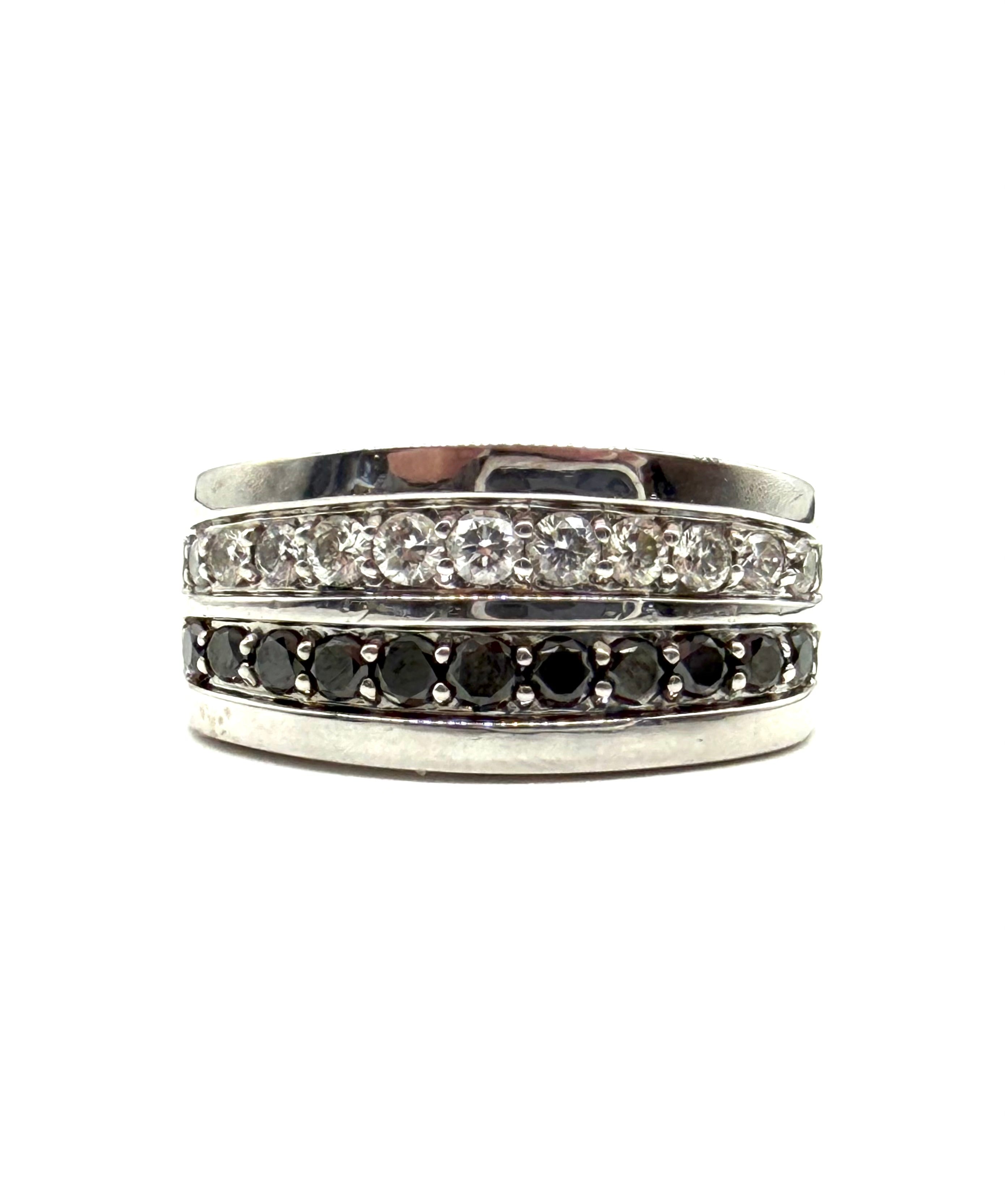 This handsome men’s black and white diamond ring is set with one row of a half carat of white diamonds and the other row of a half carat of black diamonds and set in 14 karat white gold.