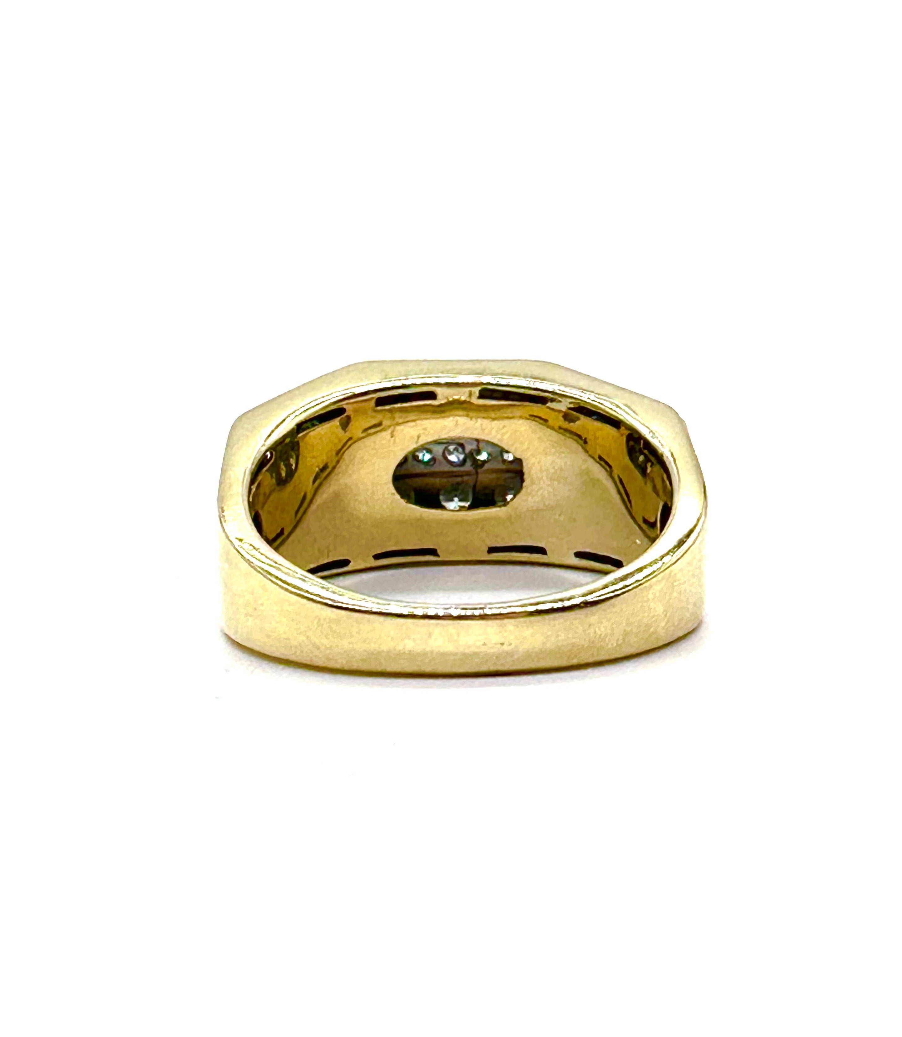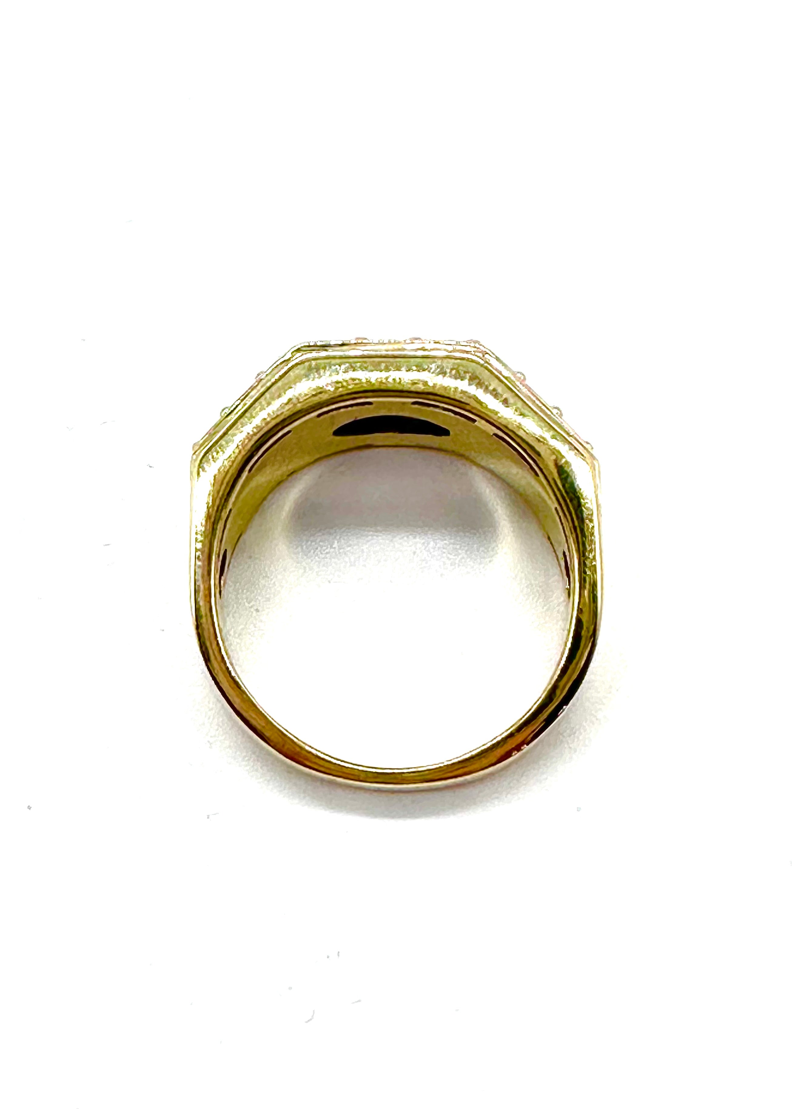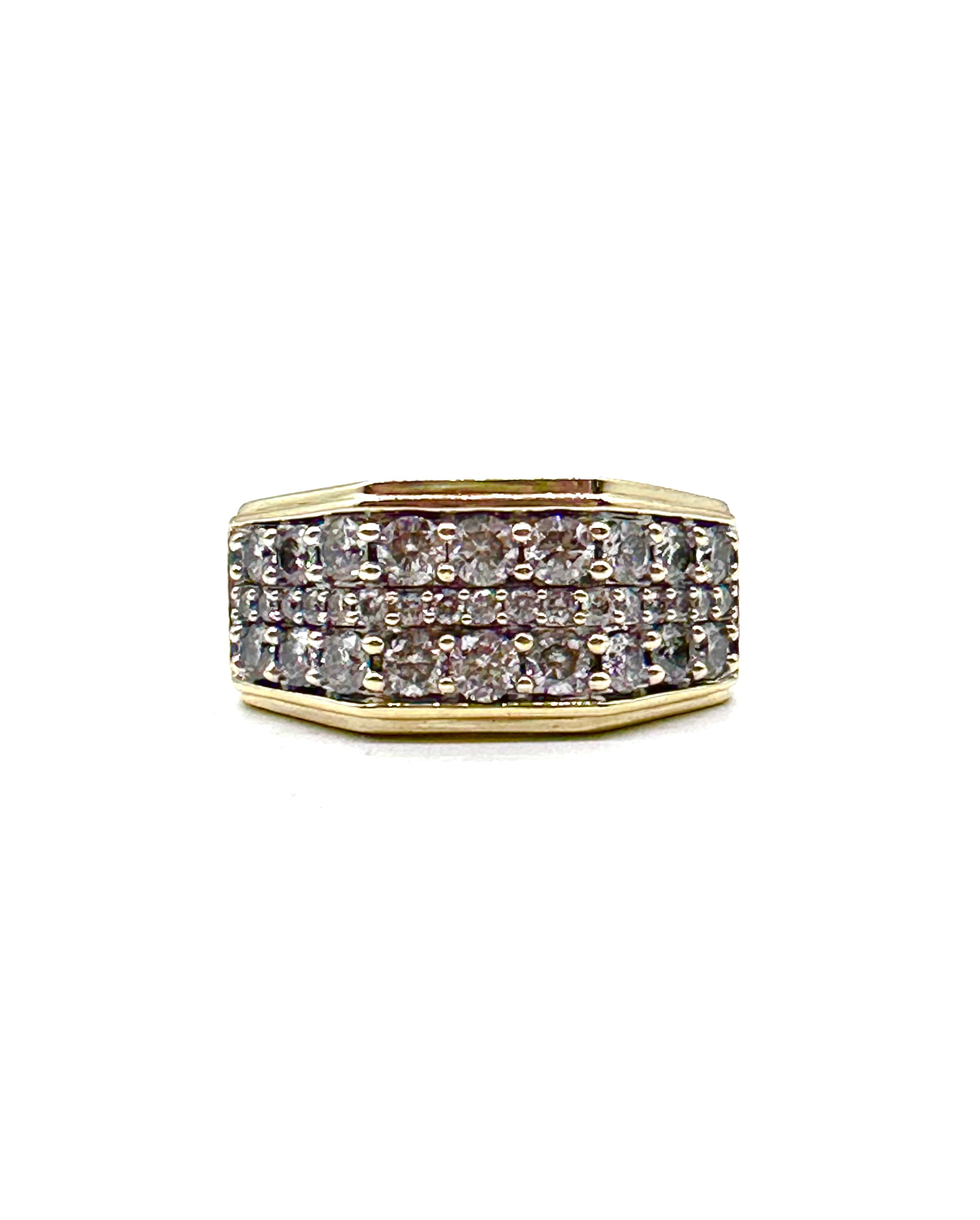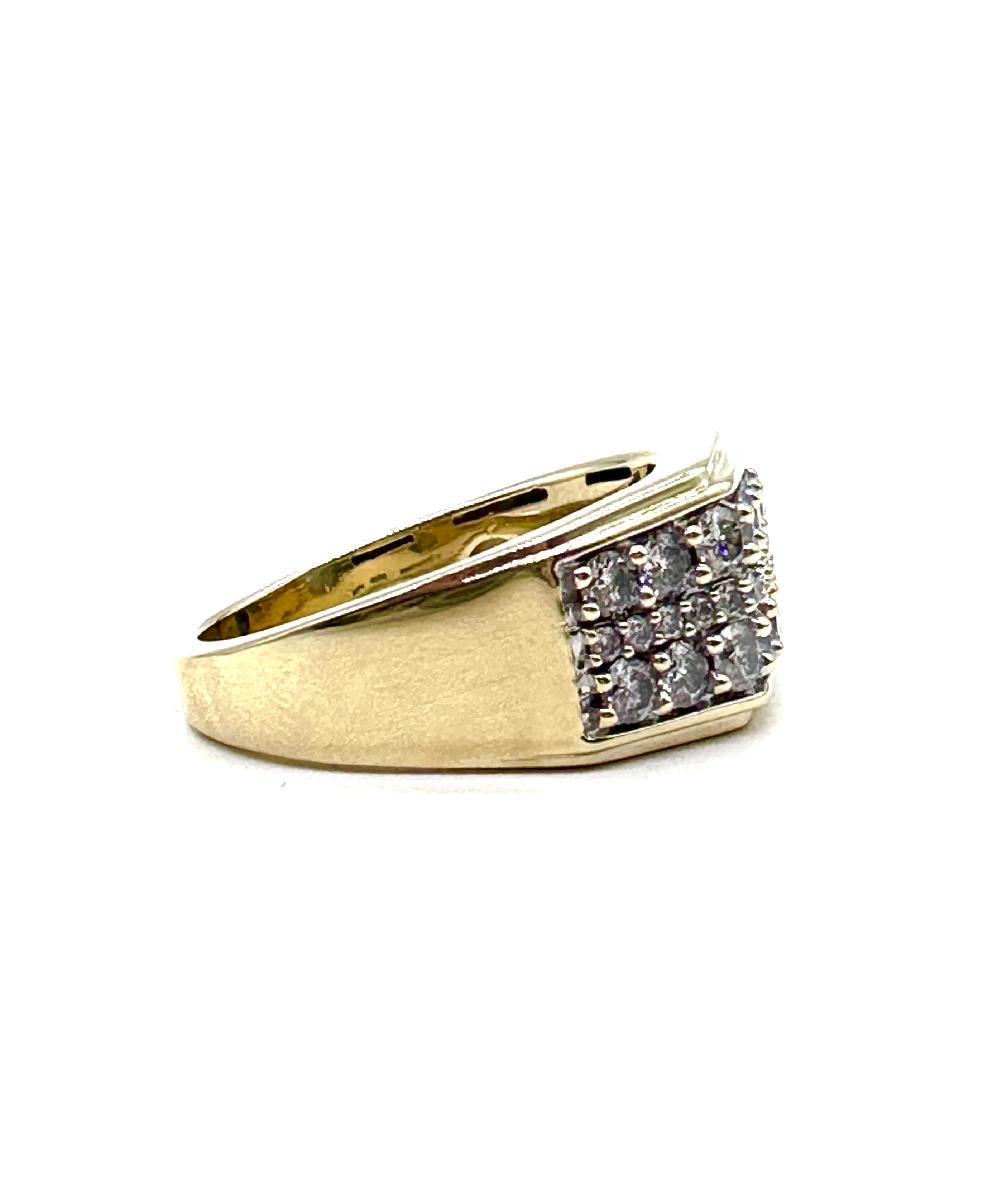 This handsome men’s three row tiered diamond ring is set with one and a half carats of diamonds in 10 carat yellow gold.