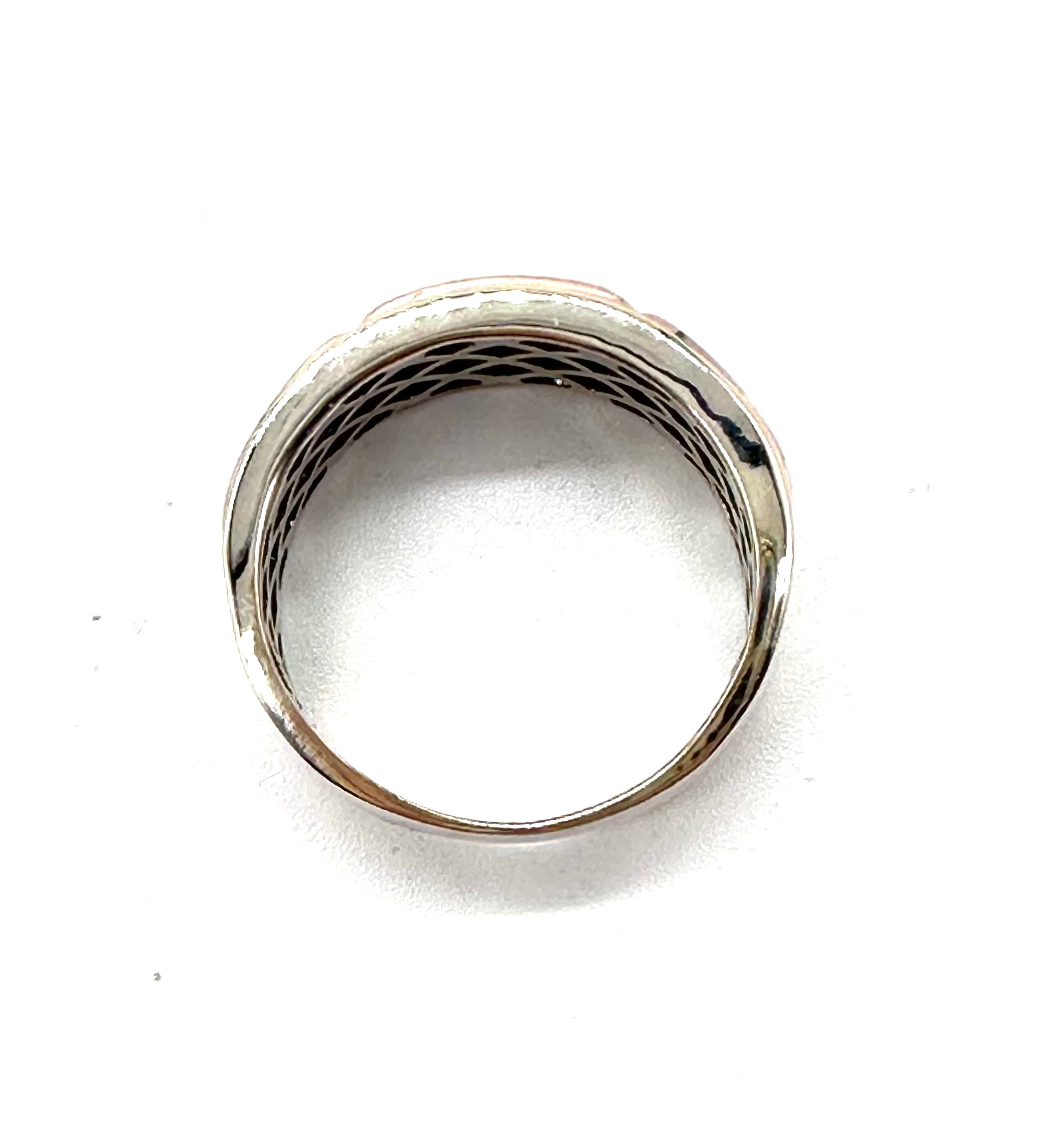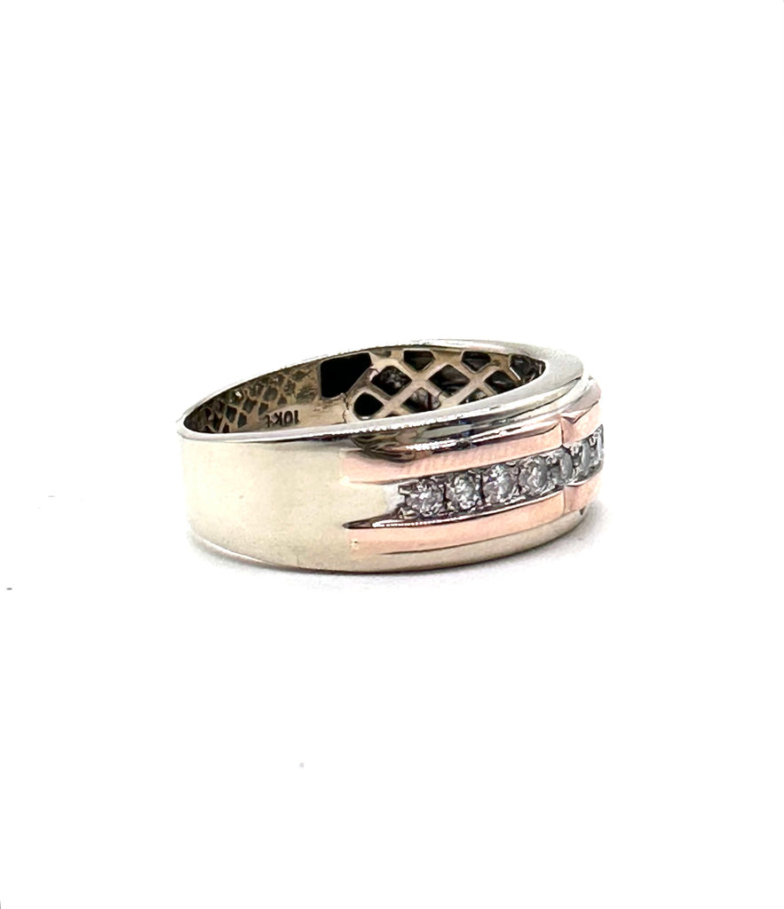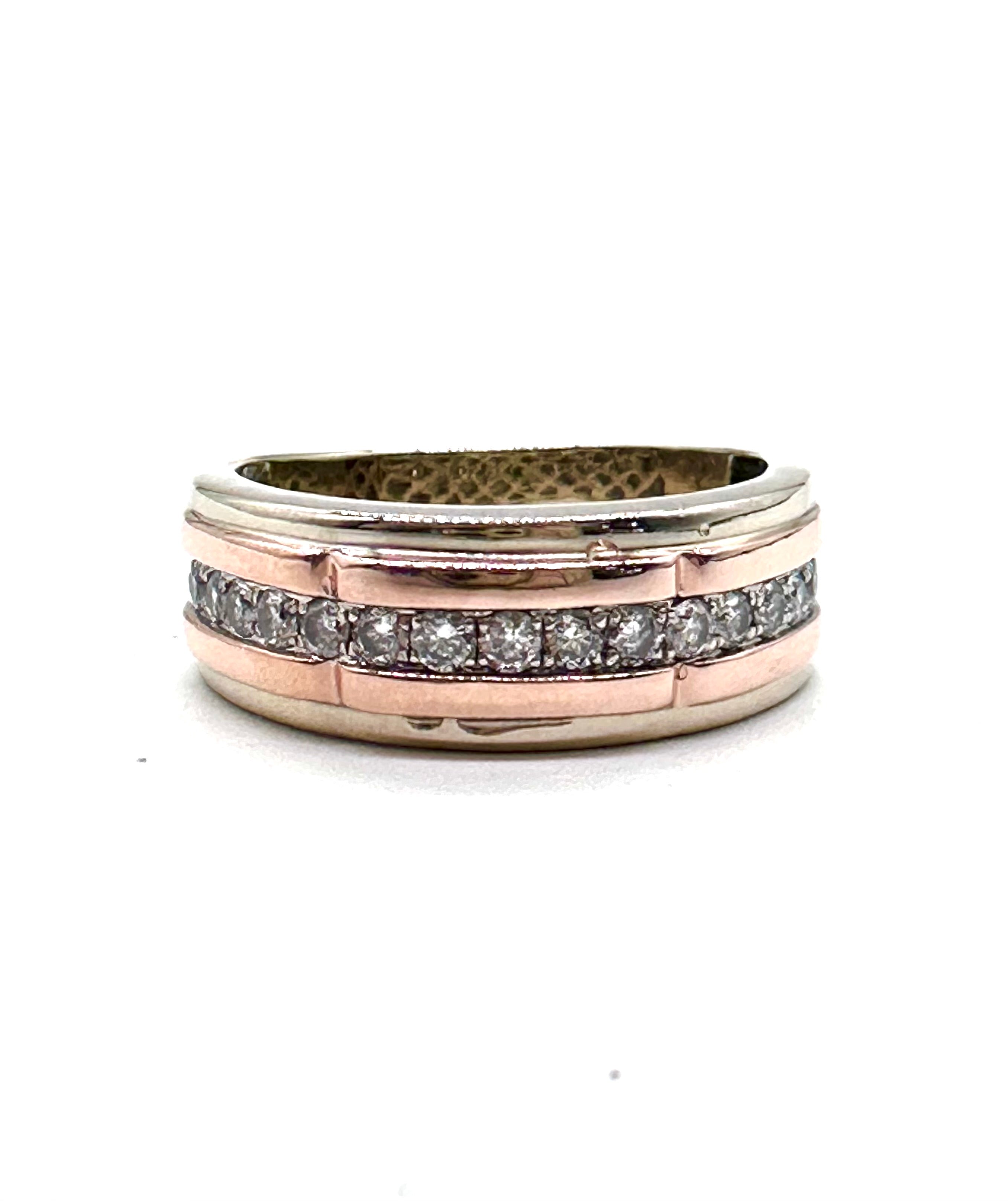 This stunning men’s channel set diamond band set with a total of a half carat of diamonds in 10 carat white and rose gold.