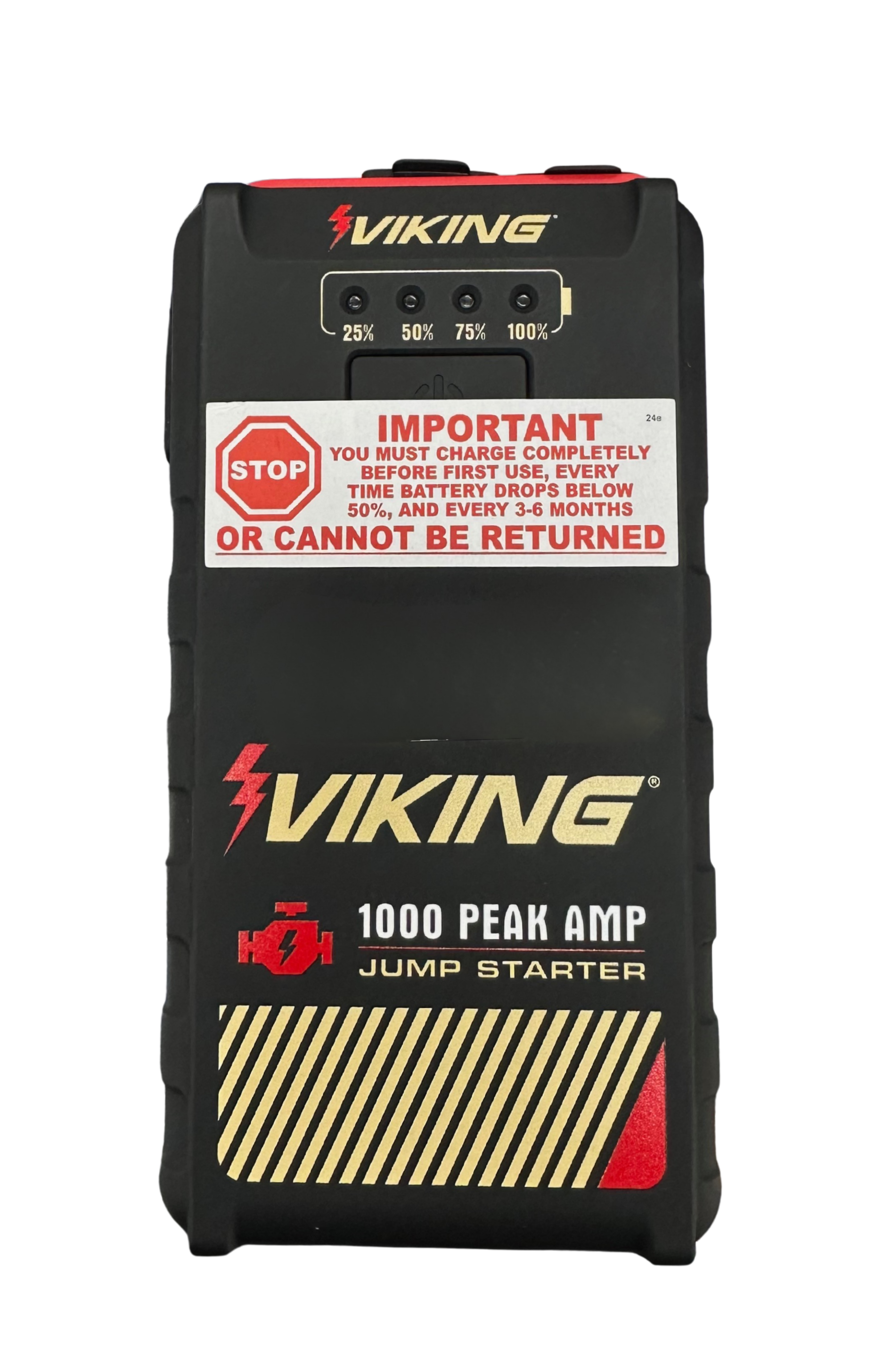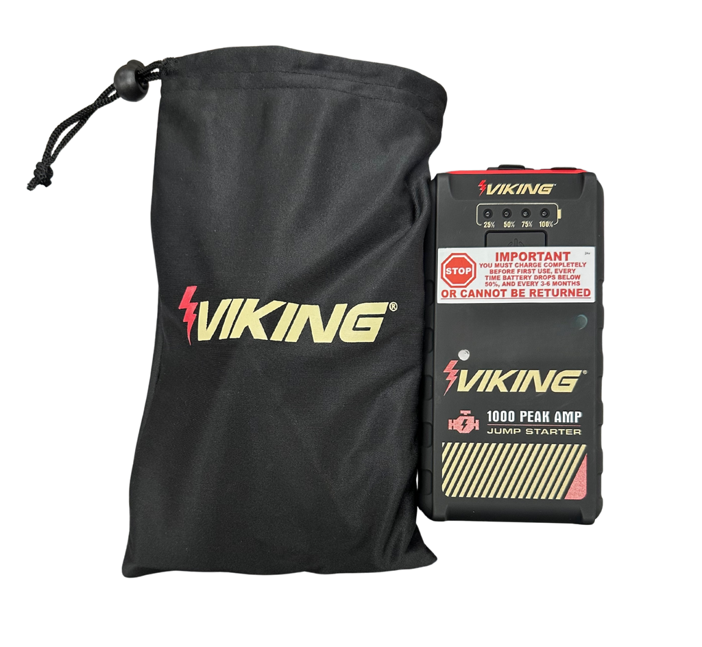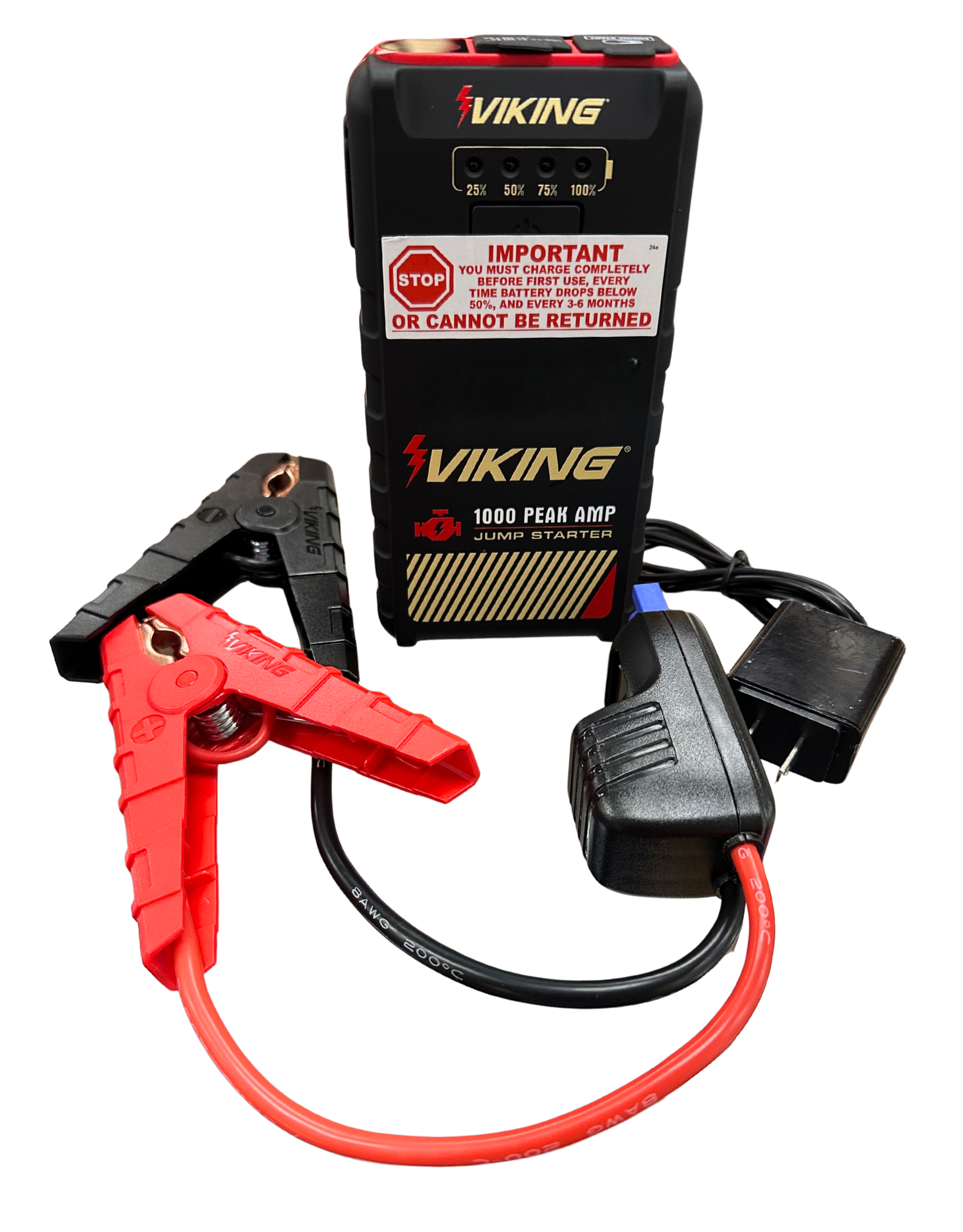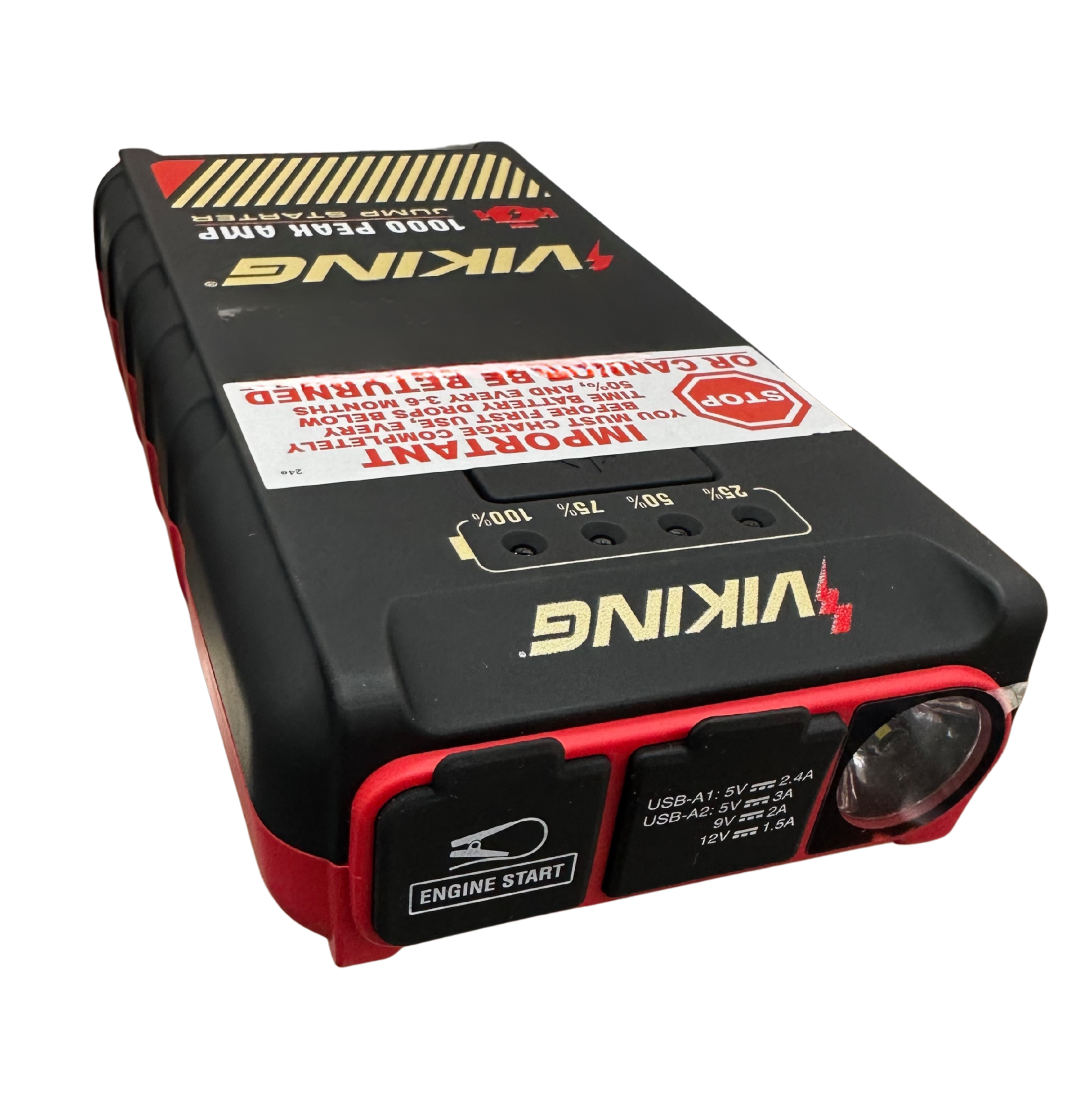 Stay road-ready with the Viking 1000 Peak Amp Jump Starter, designed to fire up your vehicle when you need it most. Compact, powerful, and easy to use, this unit packs 1000 peak amps of jump-starting muscle to revive dead batteries quickly and safely. Whether you're on a job site, parked in your driveway, or out on the road, this is the emergency power you can count on.