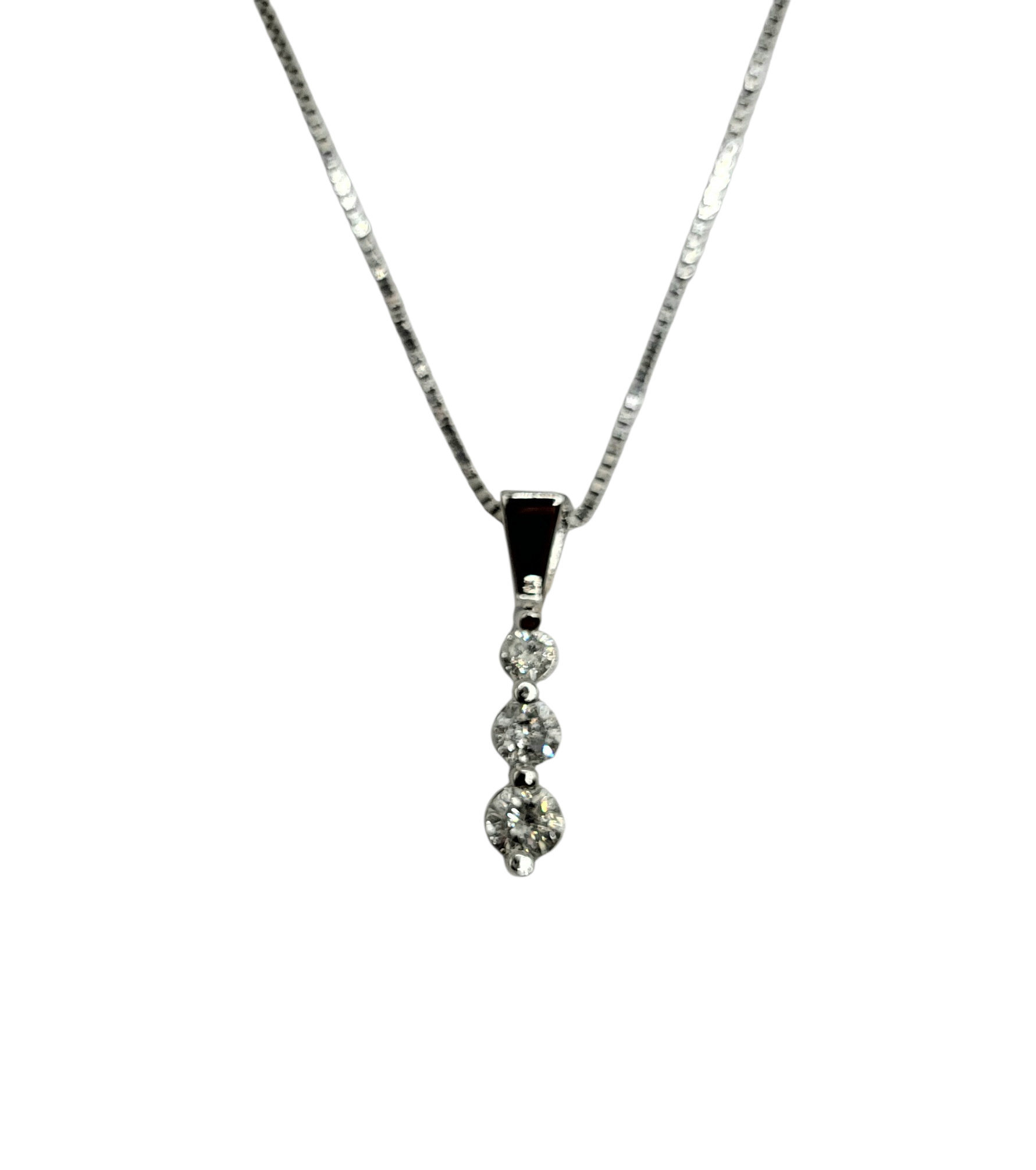 Embodying a refined elegance, this pendant showcases three graduating natural diamonds, totaling a quarter carat, each expertly set in luminous 10 karat white gold. Its exquisite design captures the essence of sophistication, making it an essential piece that enhances both day and evening attire with an air of timeless luxury. Chain available separately.