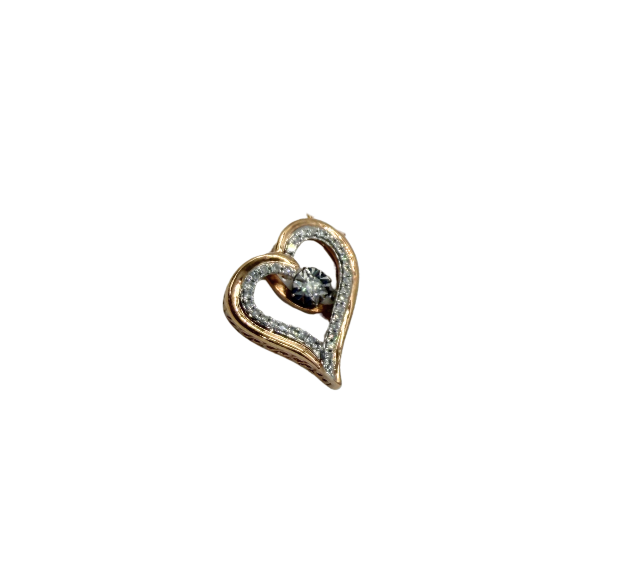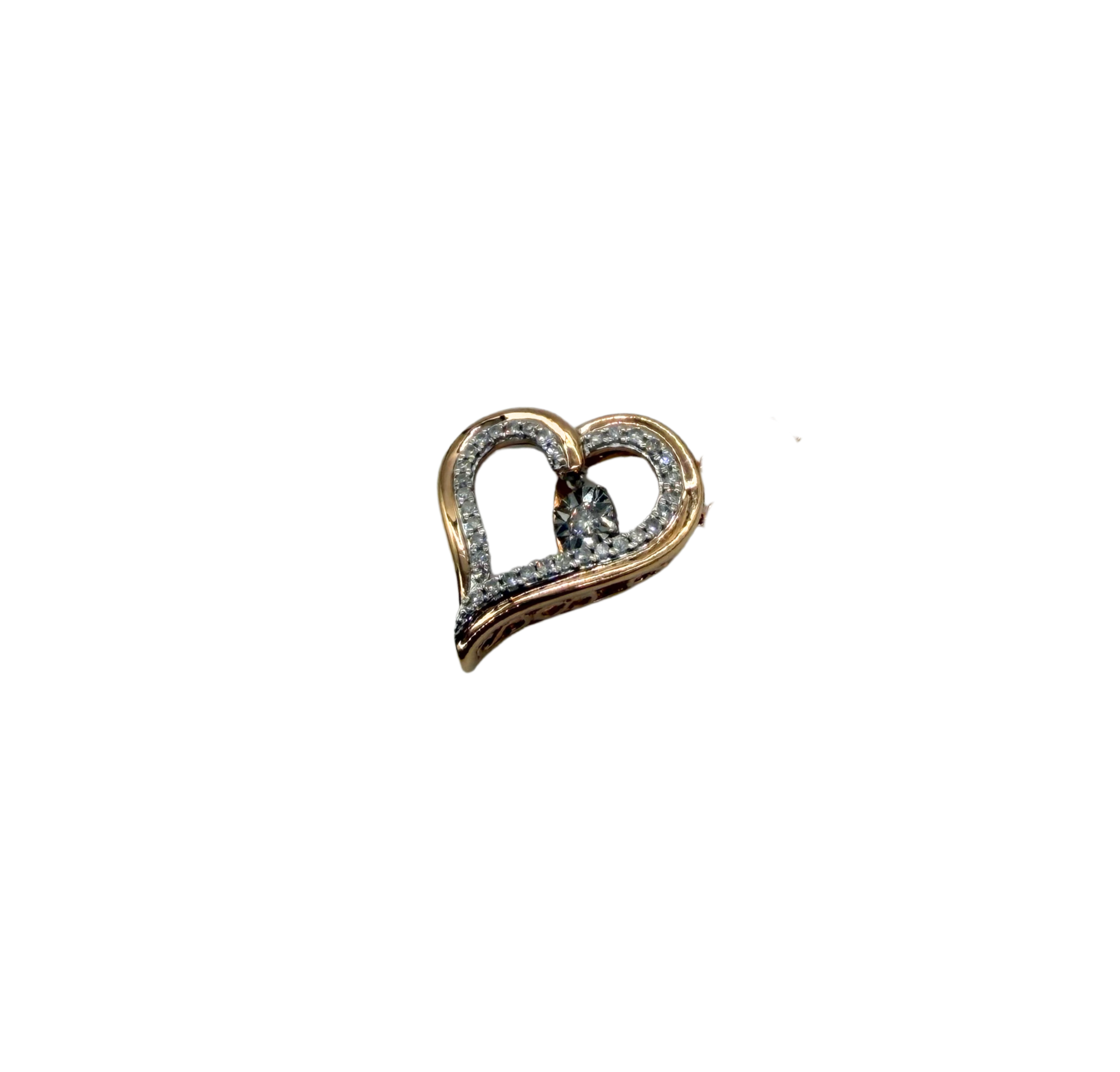 This beautiful pendant is crafted in warm 10k rose gold and features a graceful open heart design symbolizing love and connection. The heart is accented with shimmering round diamonds lining one side, adding brilliant sparkle and enhancing the elegant contours of the design. At the center, a larger round diamond is set within the heart, creating a “beating heart” effect that gives the piece movement and emotional significance.